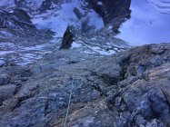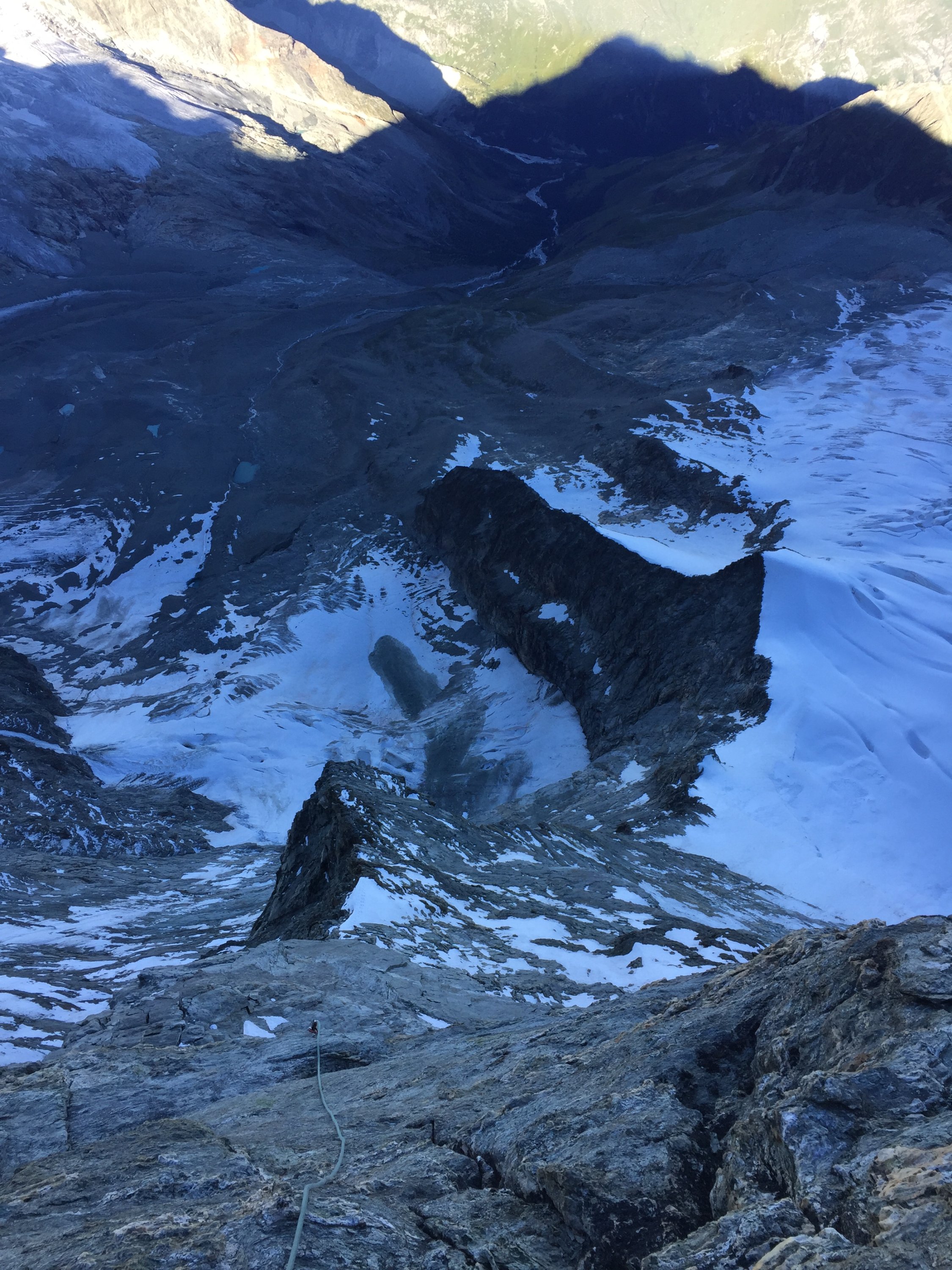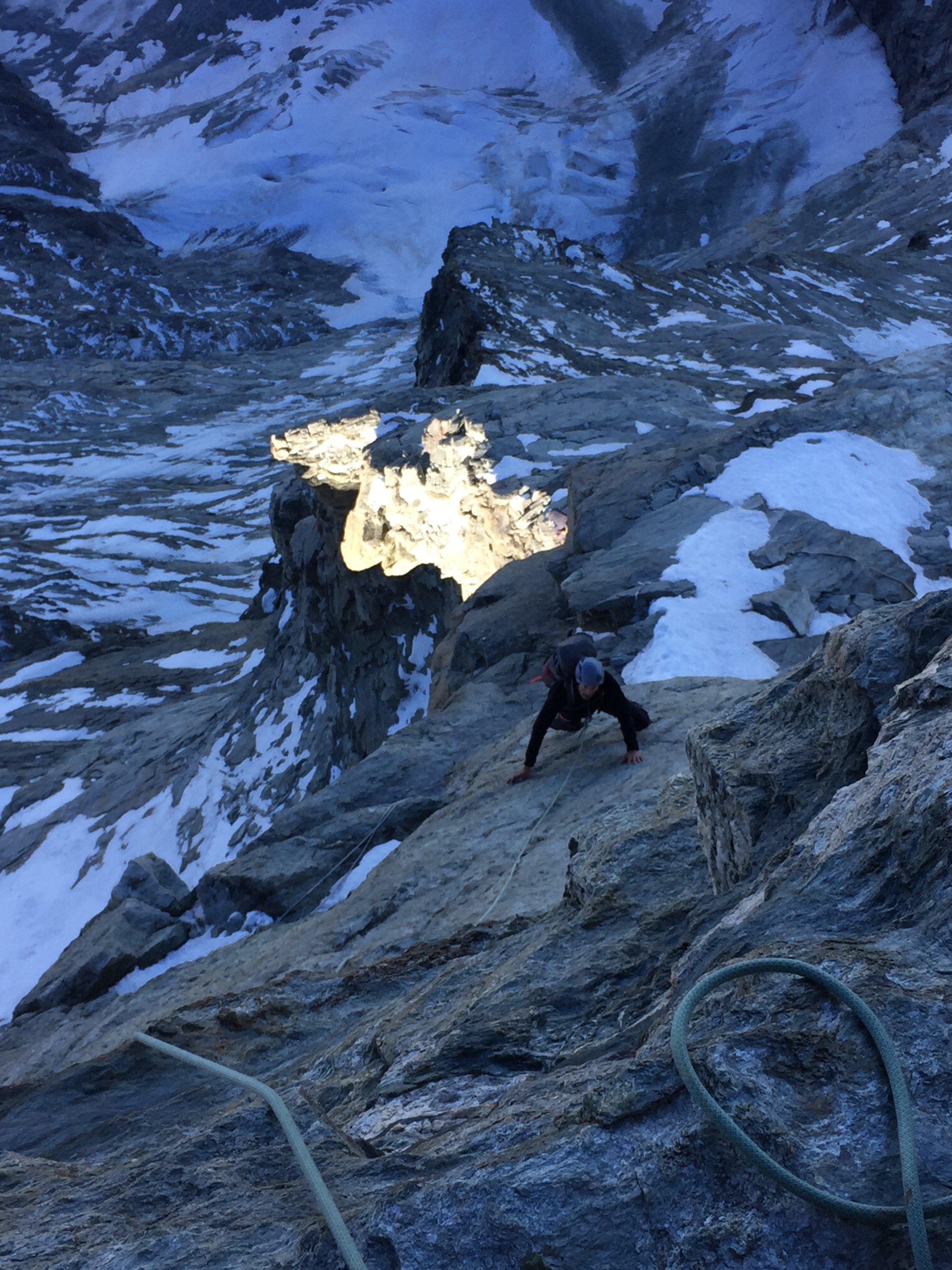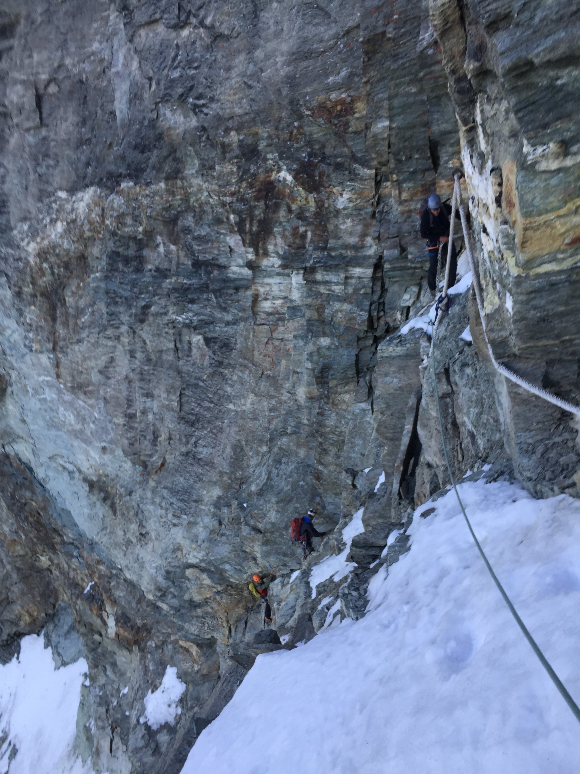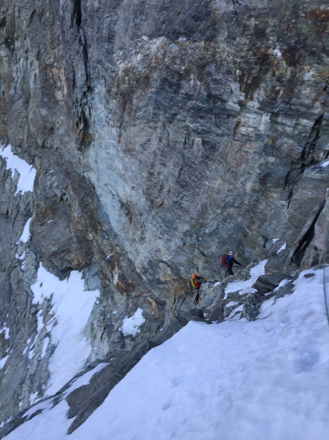 Früher wurde die Route viel begangen. Über weite Strecken wurden Fixseile installiert und Abseilstangen eingerichtet. Der Gendarm wurde rechts im Couloir umgangen (Haken und Stifte - durch die Ausaperung / Felsausbruch nicht mehr empfehlenswert). Meine persönliche Meinung: Es ist schade dass die Installationen in einem so himmeltraurigen Zustand sind (Fixseile und teilweise lose Stifte). Wenn man die Route über den Gendarm durch die Plattenwand einbohrt - kann man genügend Haken setzen, dass man auch bei Kälte und Nässe ohne Kletterfinken hochkommt. Gutes Beispiel waren unsere Vorfahren: Die haben jeweils auch eine "Rechte Sache" gemacht und Einzelstellen Homogen eingerichtet. Es ist leider auch unter "Lokals" Mode die Routen möglichst unverändert zu lassen: Ein loser Stein mal aus dem Weg räumen oder eine Schlinge auszuwechseln hat mit "Clean Climbing" Ethik nichts zu tun...