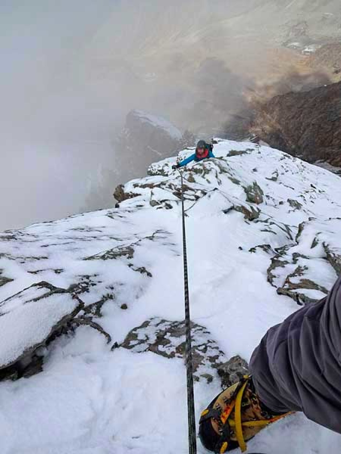 am vorabend der tour hat eine sehr dukle wolke den alphubel eingenebelt. diese wolke hat wohl dafür gesorgt, dass der ganze obere teil des wissgrates sowie die drei aufschwünge am firngrat mit wassereis überzogen waren. am eigentlichen steilaufschwung des rotgrates herrschten dann sehr winterliche verhältnisse, die allerdings im grossen ganzen nicht allzusehr störten. nur der einstieg vom firngrat weg gestaltete sich äusserst heikel (der gut gemeinte bohrhaken steckt bei solchen verhältnissen leider am falschen ort, man klettert etwa anderthalb meter rechts davon durch und hofft, dass die füsse nicht von den vereisten minitritten abrutschen). nochmals sehr störend war der neuschnee am kurzen plattigen gipfelgrat, den man bei solchen verhältnissen wohl besser links in der (zur zeit allerdings vereisten) firnflanke umgehen würde.