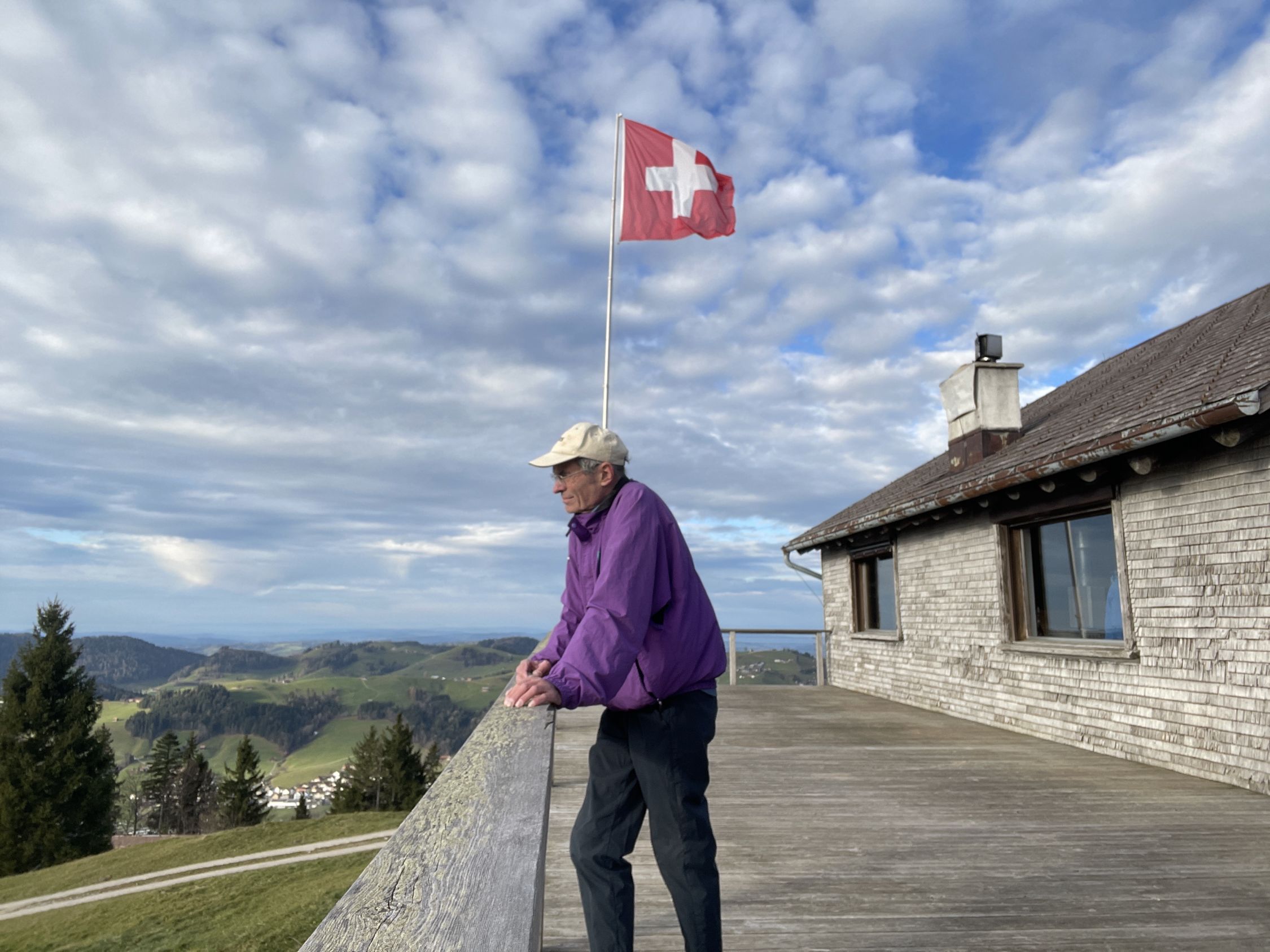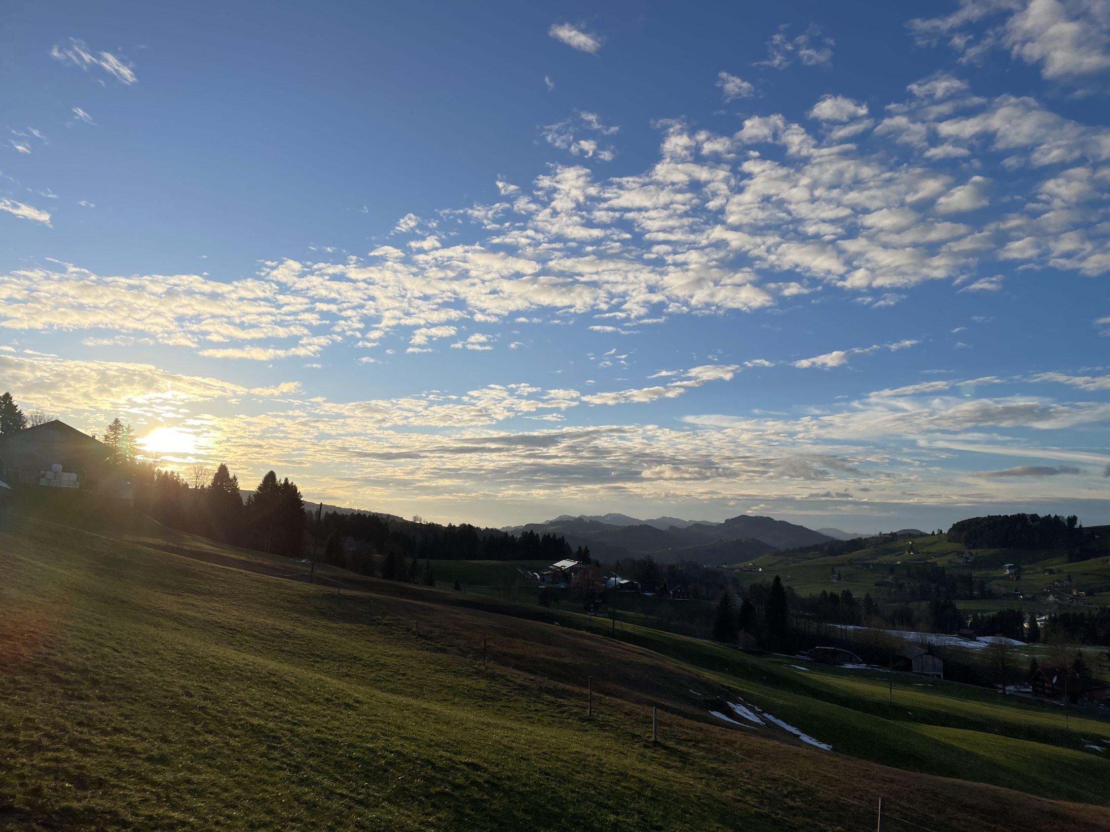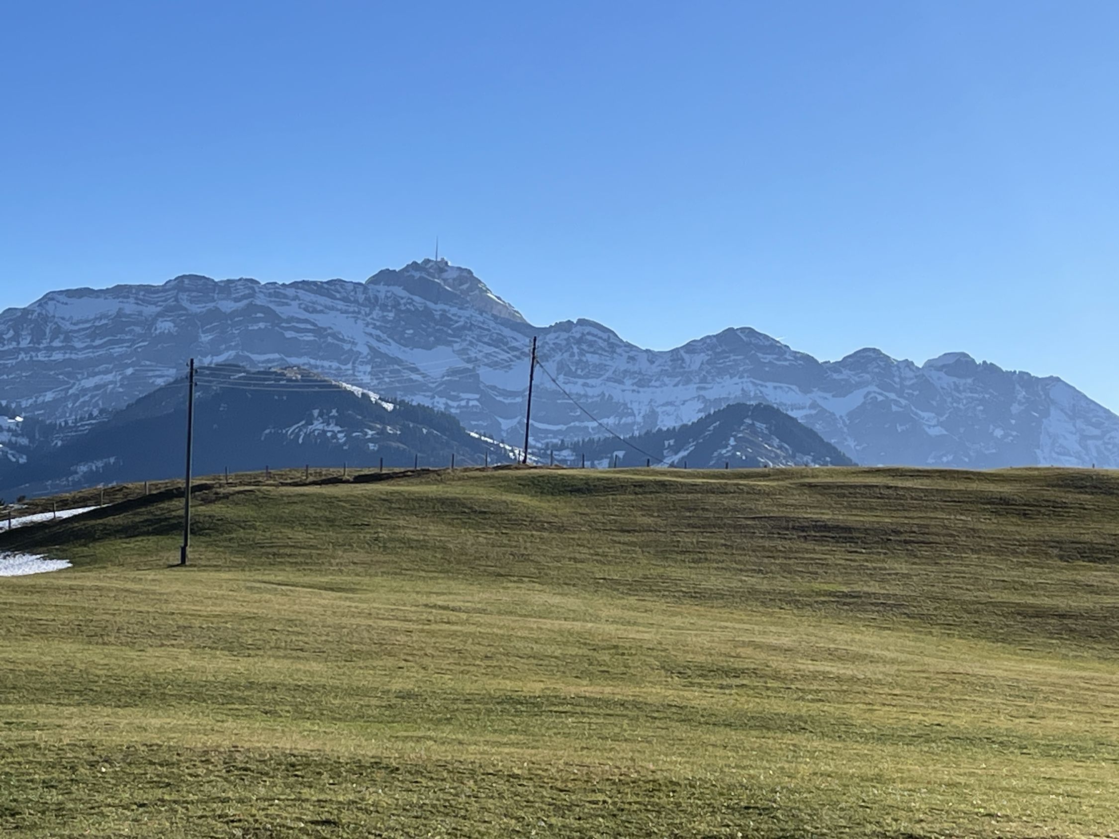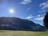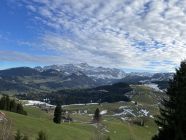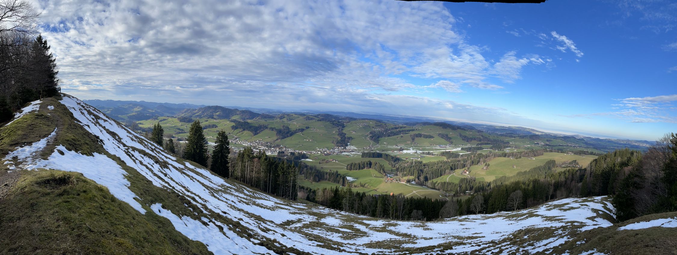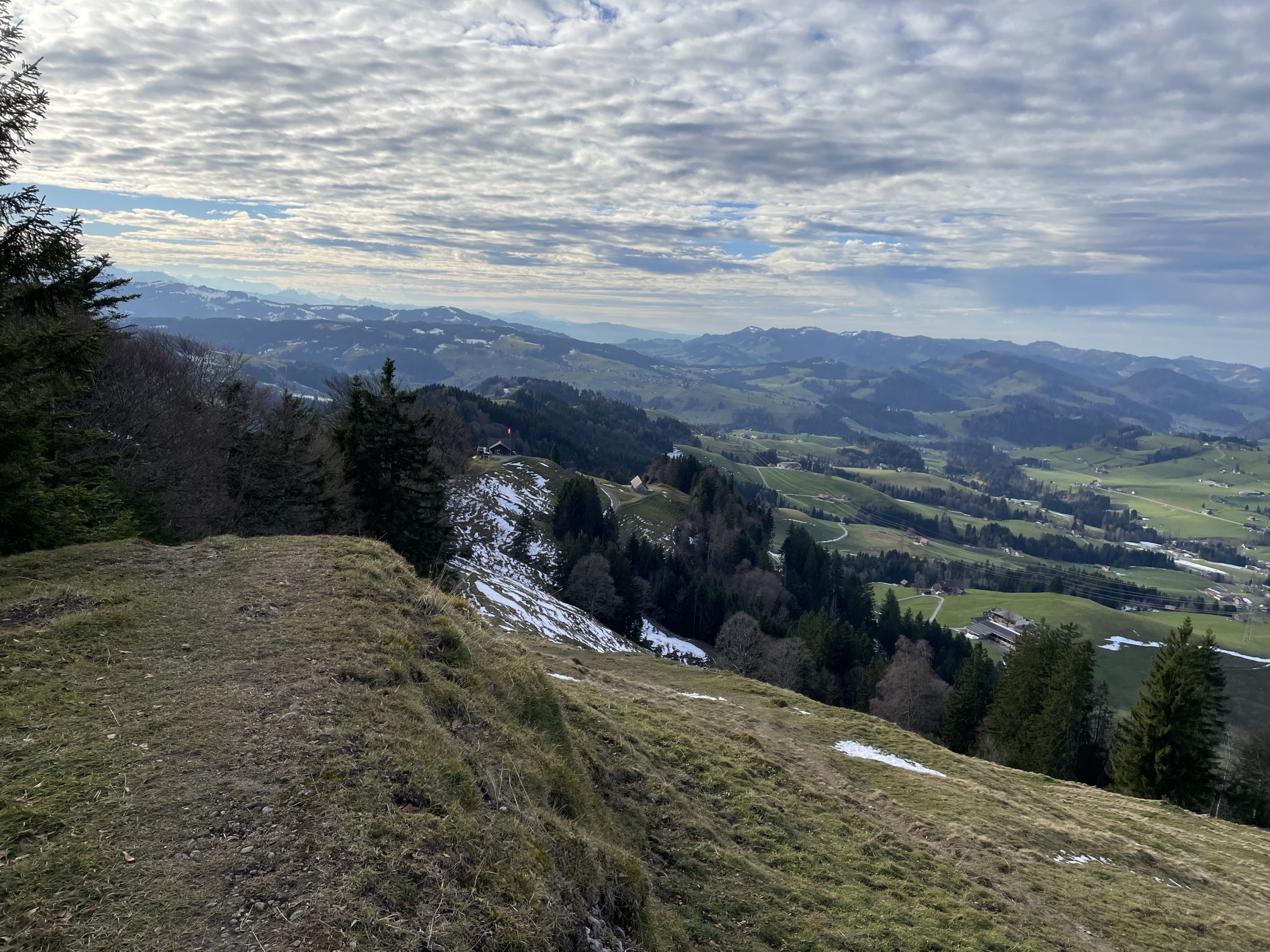Tourenbeginn um 10:35 Uhr bei 9°C unter blauem Himmel, während die Bodenseeregion unter dicker Nebeldecke lag. Auf dem Kretenweg lag noch Restschnee und der Weg war darum stellenweise etwas matschig.