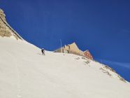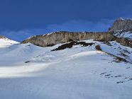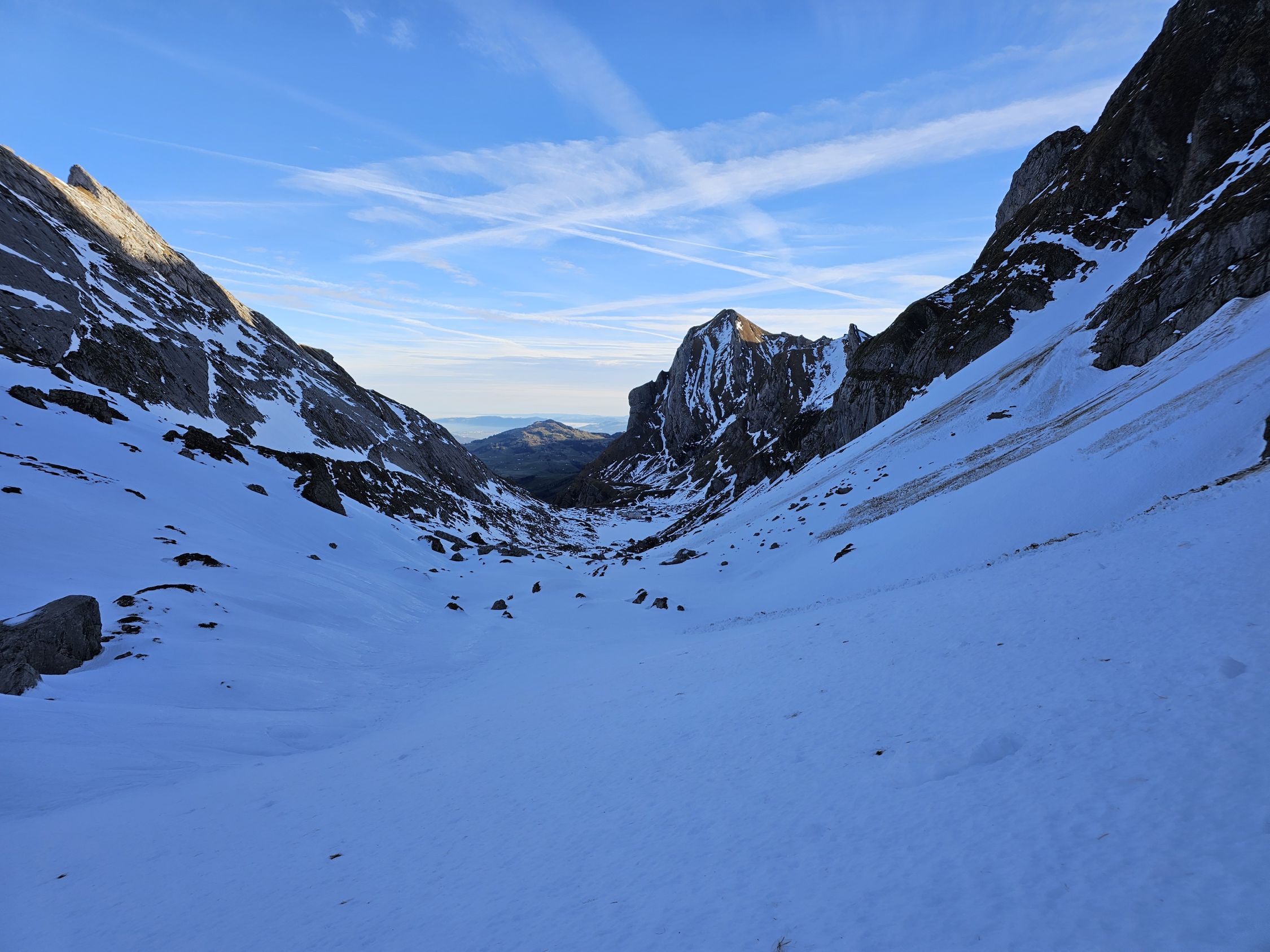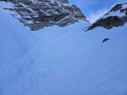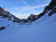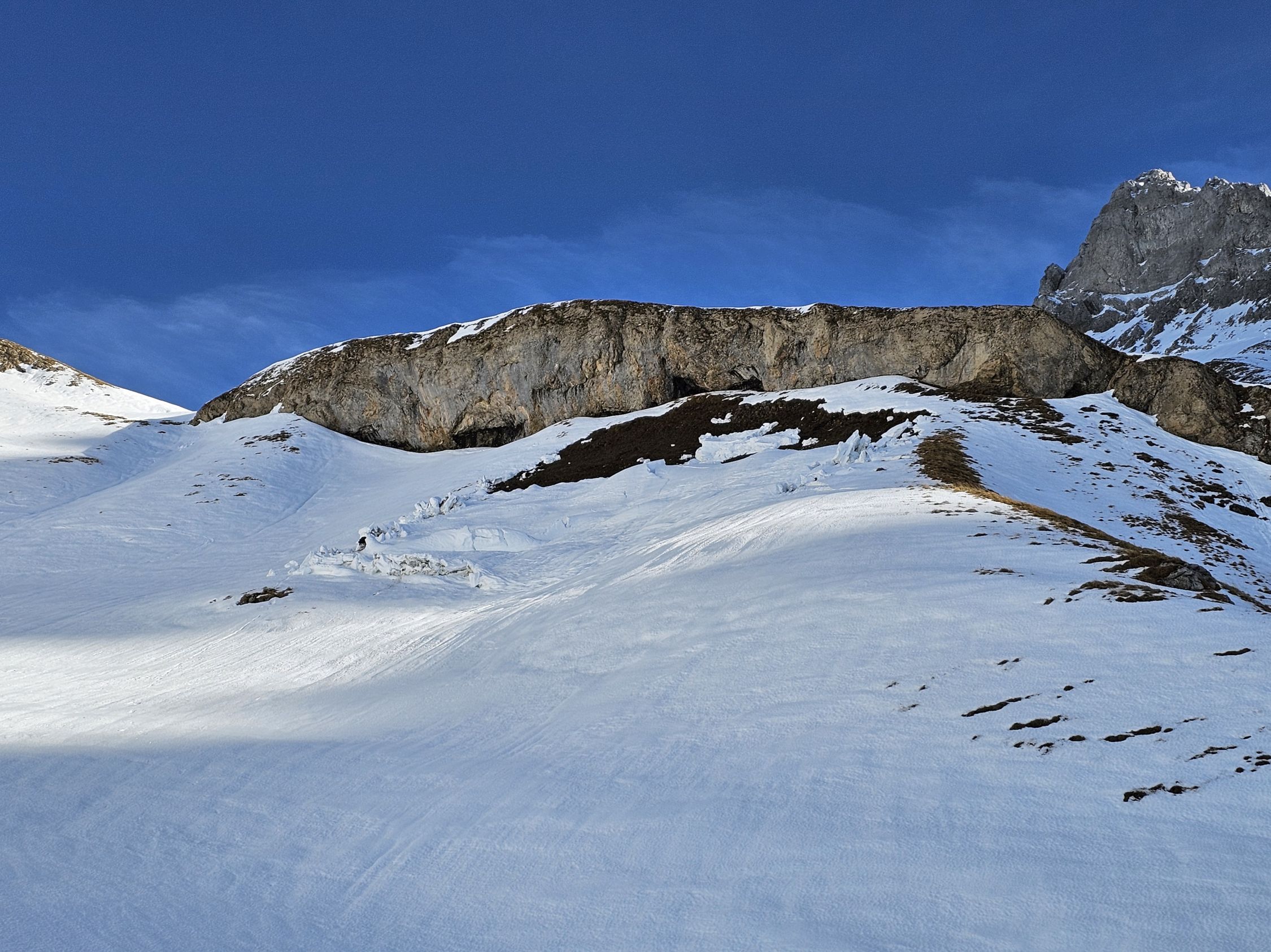 Aufstieg zum Rotsteinpass anspruchsvoller als üblich (hart gefrorene Lawinenablagerungen machen Harscheisen unerlässlich, einige Stellen steil.