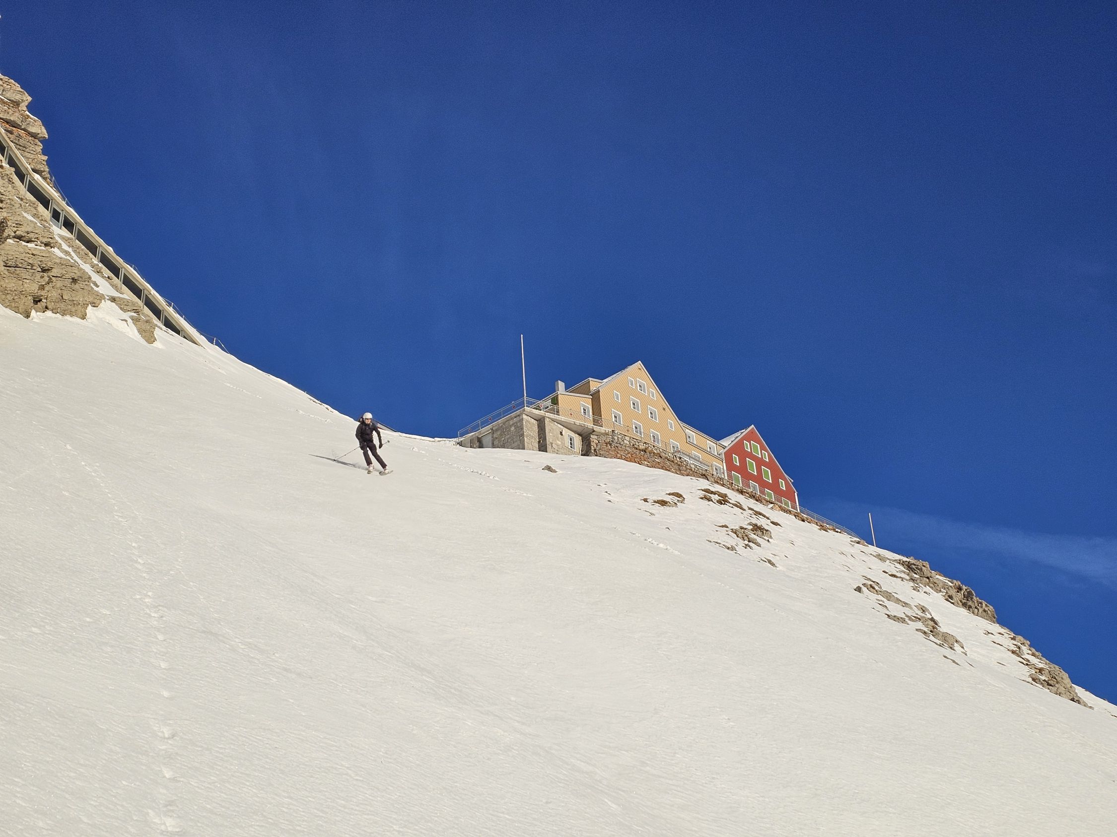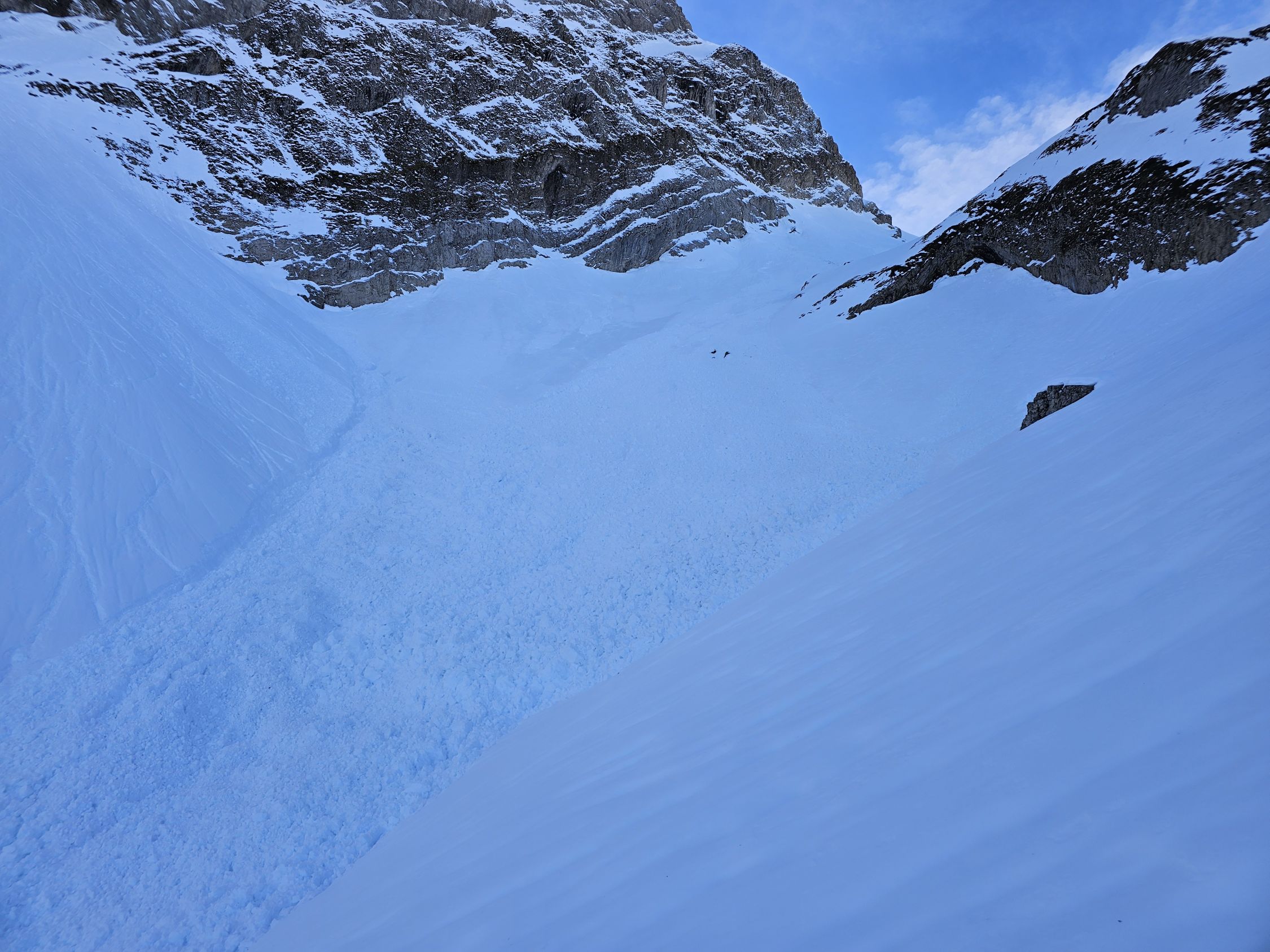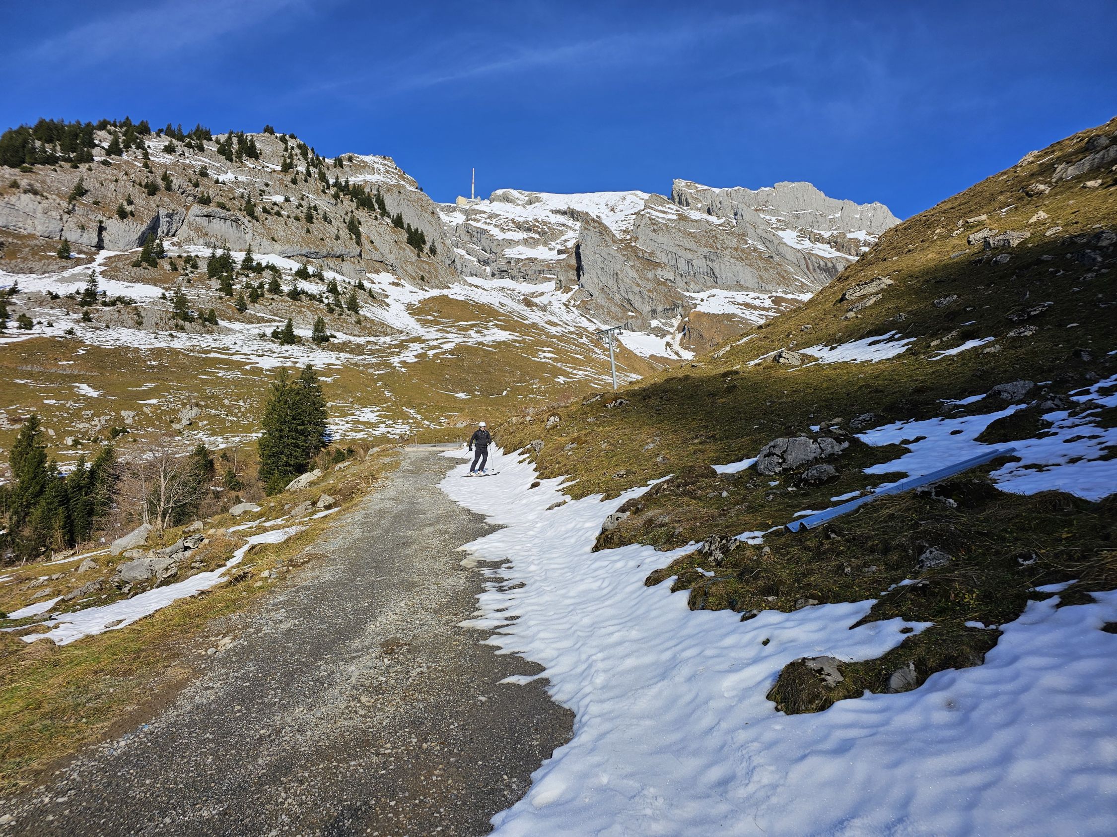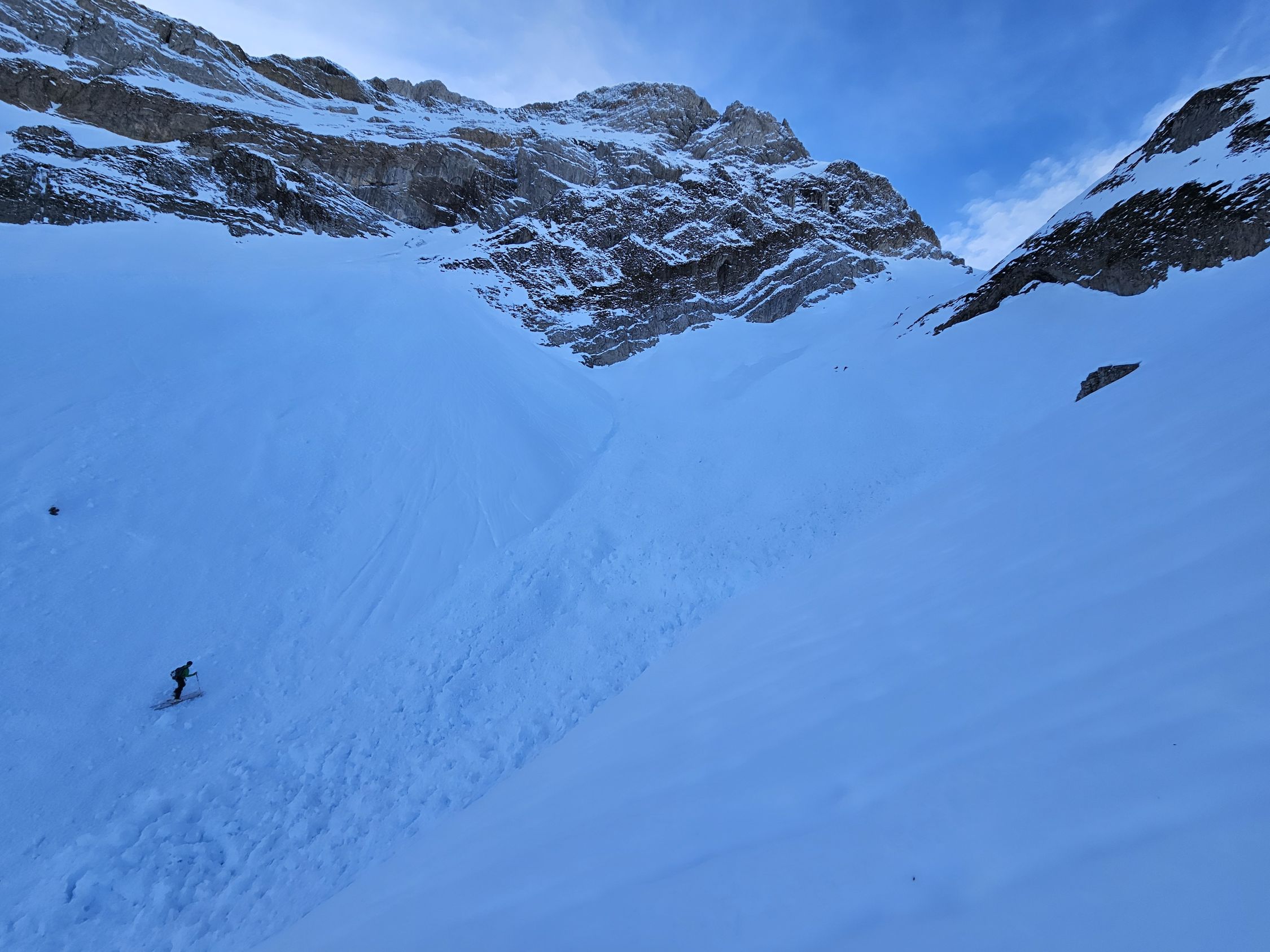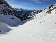Abfahrt ab Rotsteinpass zuerst an Südhang zu bevorzugen (Nordhänge voller Lawinenkegel), bis 1400 müM gut, teils ziemlich buckliger Schnee. Ab 1400 müM einige apere Stellen (Ski tragen), zuunterst nochmal ausreichend Schnee zum Fahren bis Parkplatz beim Alpli.