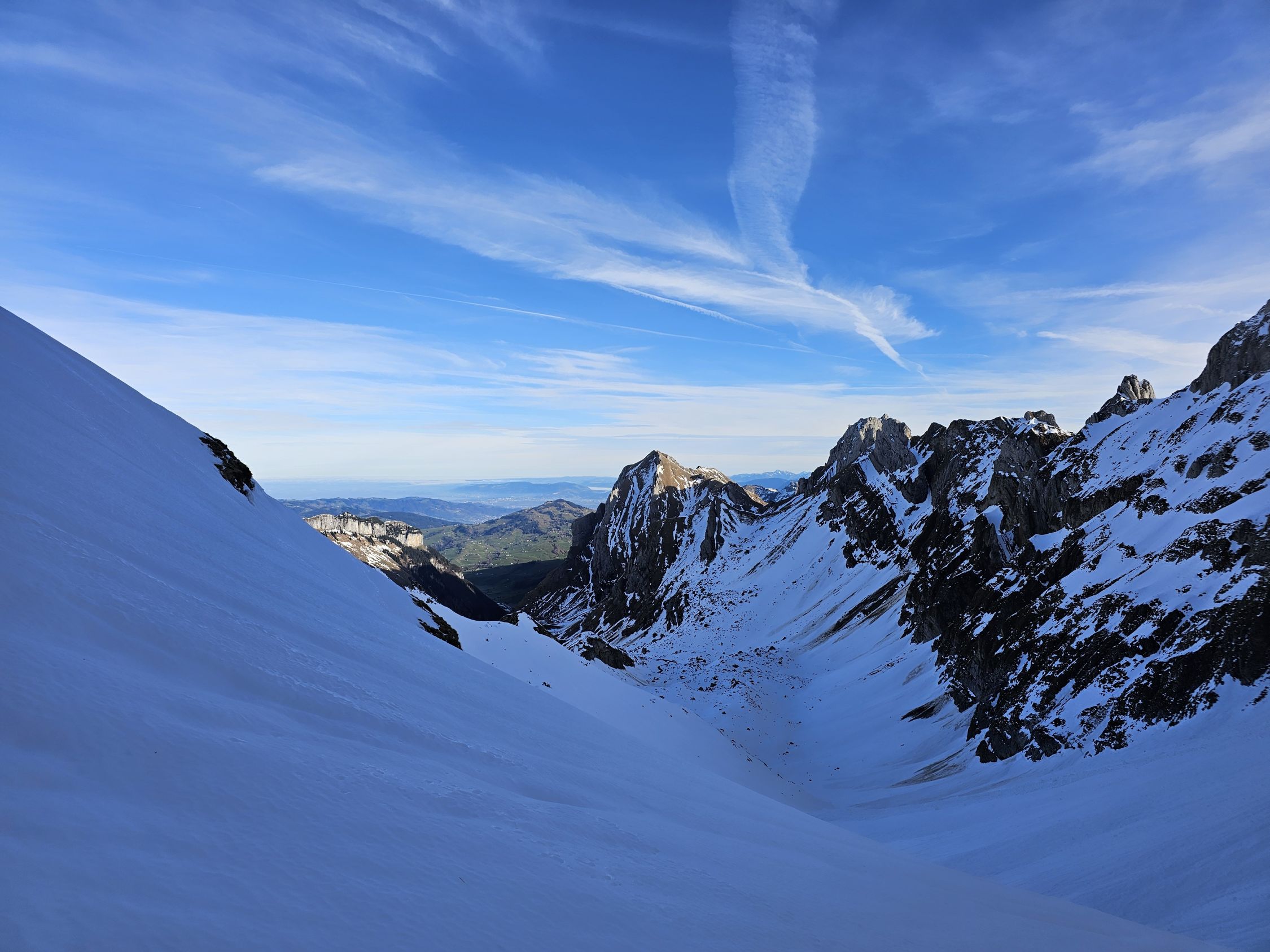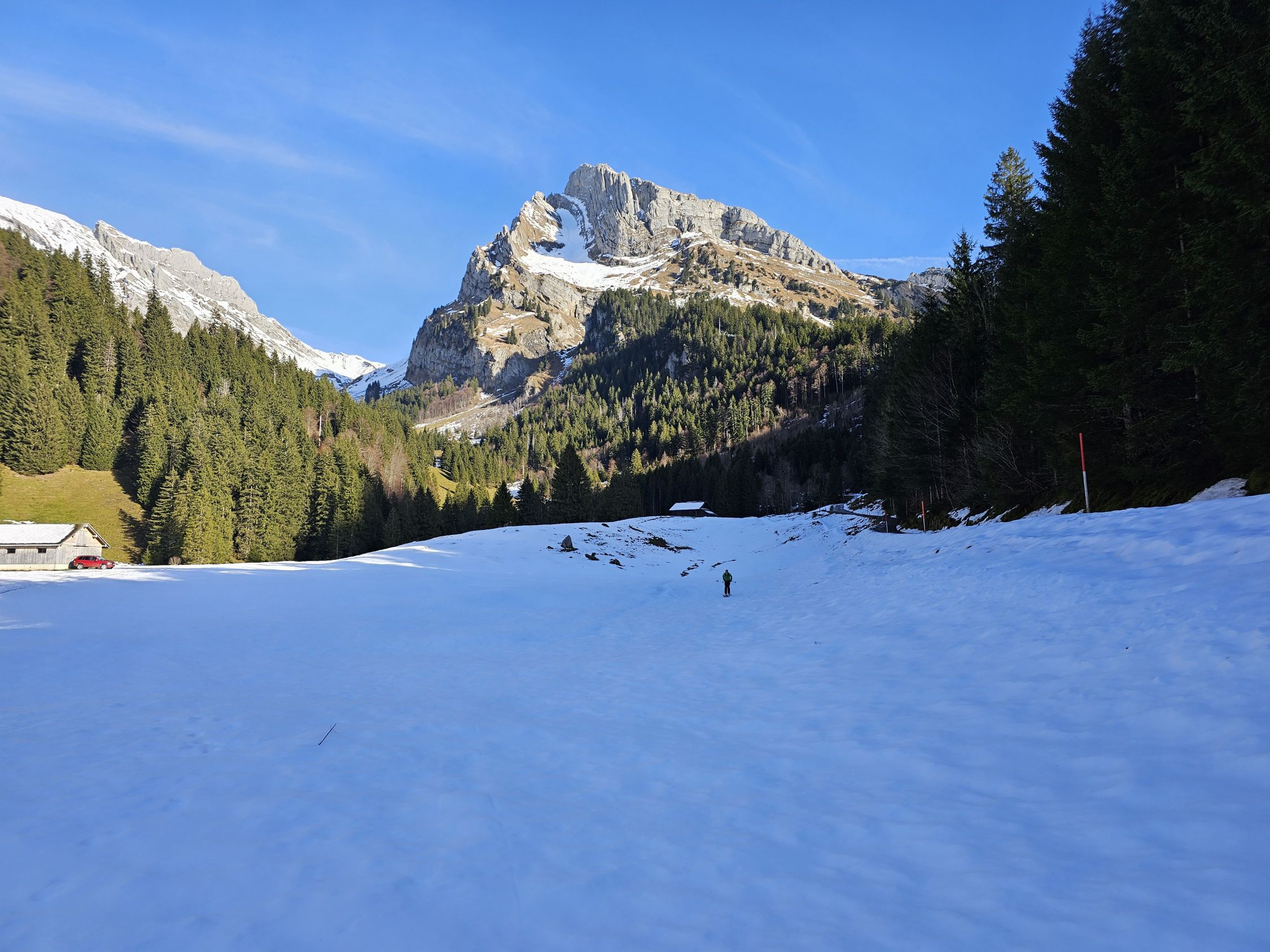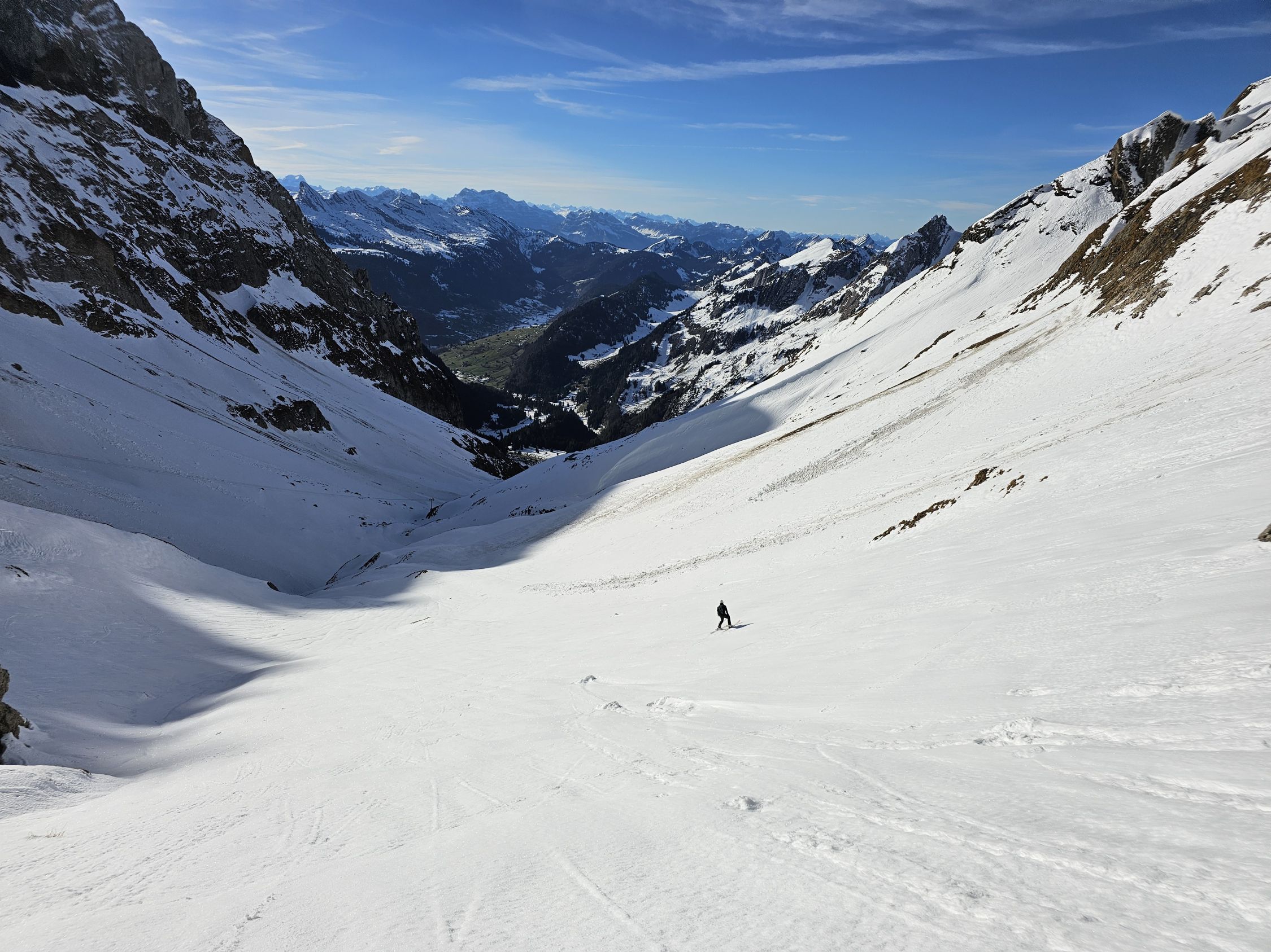 Start um 0900 Uhr auf dem Gipfel auf festem Harsch, oberflächlich am Ansulzen. Im Schatten pickelhart, Richtung Meglisalp bald auch etwas weichere Stellen, aber überall tragend, schneller und lauter Schnee. Zur Meglisalp ist gute Nase für Routenfindung gefragt (Felsenslalom).