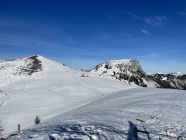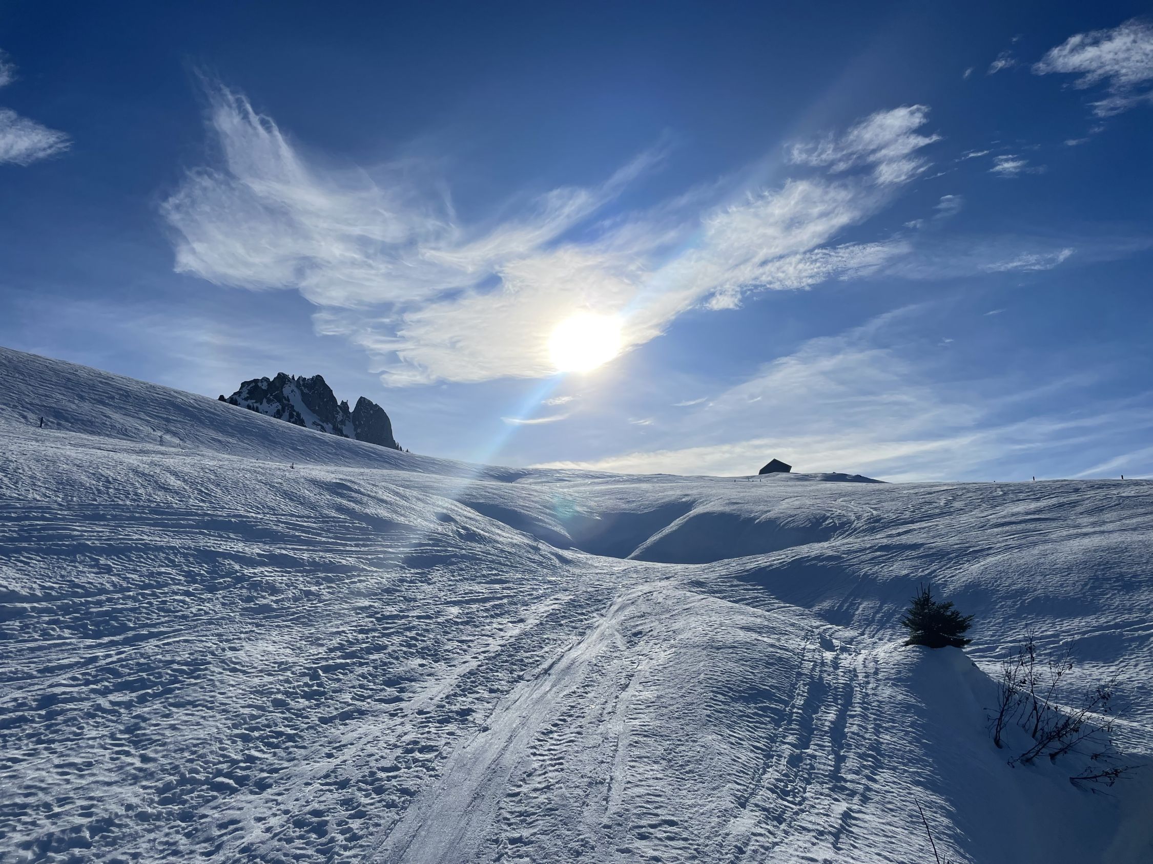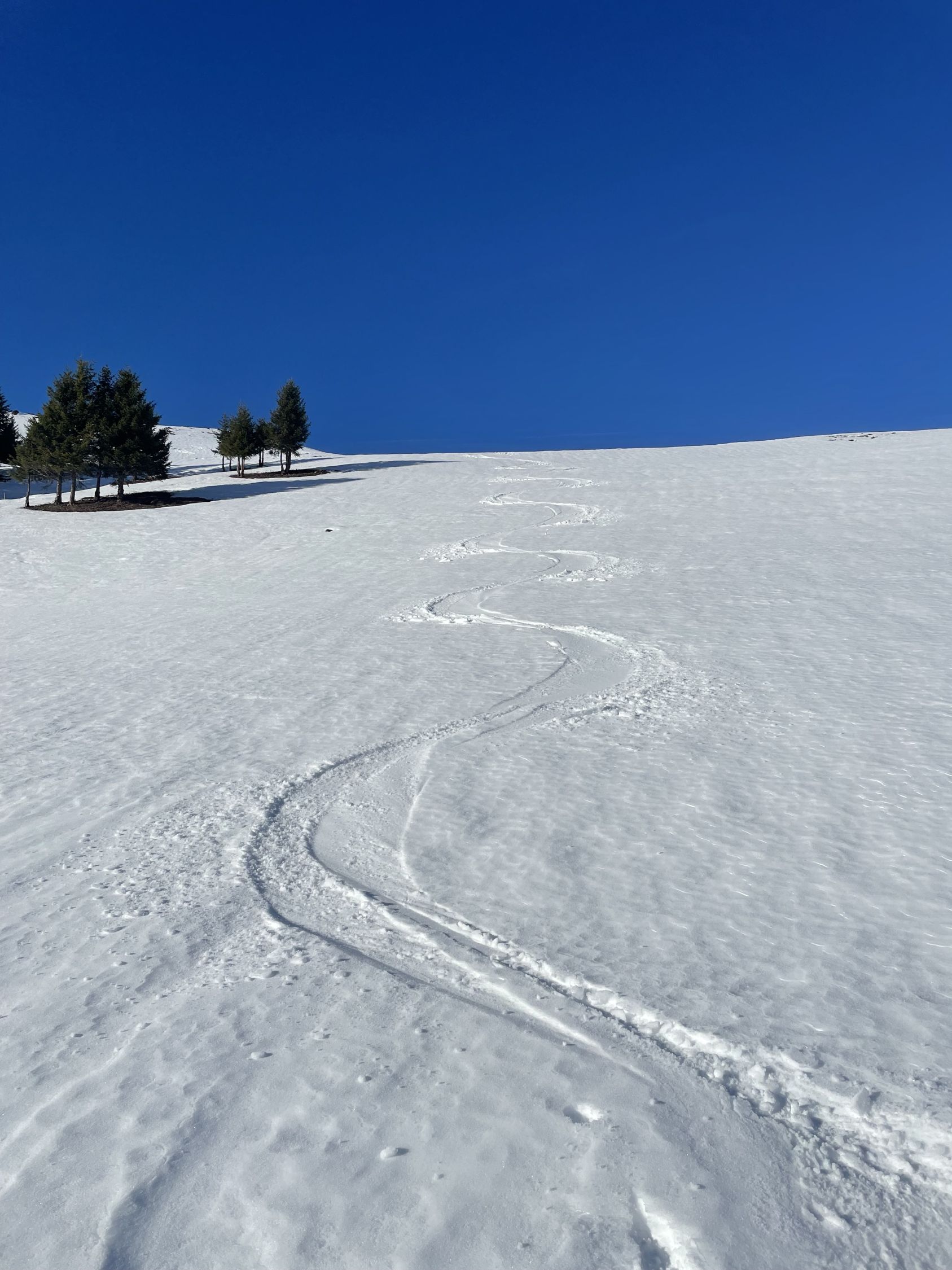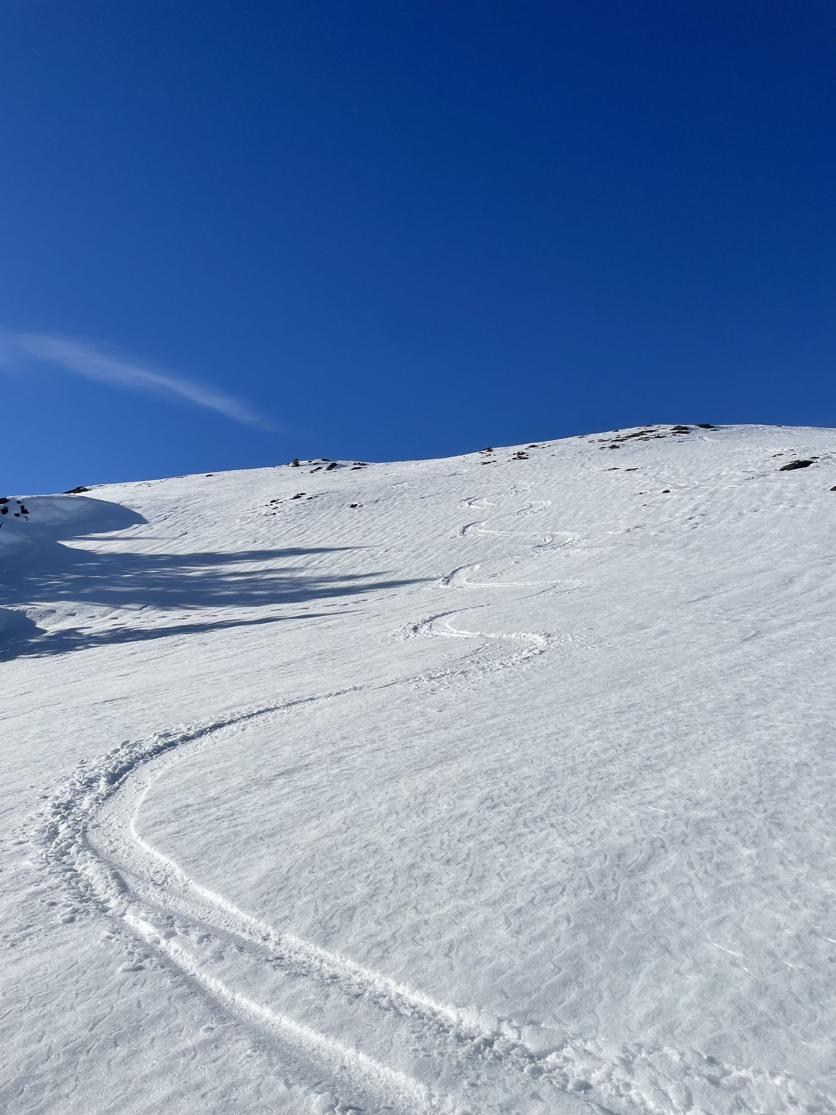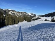Ich hatte sehr tiefe Erwartungen und geradezu Motivationsprobleme heute und dachte, aufgrund des verregneten Schnees werde die Abfahrt sicher nix. Der Aufstieg über die Alpstrasse bestärkte mich in dieser Meinung, eisig und mit vielen Löchern… naja, am Brätliplatz immerhin hübsch winterlich und natürlich tolles Wetter und angenehme Temperaturen. Könnte alles deutlich schlimmer sein! Weiterer Aufstieg problemlos bis zum höchsten Punkt. Hübsche Rast und Blick zum Lueglespitz, wo Abfahrtsspuren auf guten Sulz deuteten. Entsprechend fuhr ich statt nach Obergestele in die südwestliche Richtung nach obere Berg und das war ein Volltreffer: schöner Sulz und genüssliche Schwünge. Dann Wiederaustieg unter dem Geisshöri durch bis zum Puur und dort noch die Hänge probieren: nicht soo toll, aber immerhin knapp tragende Kruste. So weiter bis zum Brüggli auf 1599, das war deutlich besser als befürchtet! Die Strasse dann bis zum Brätliplatz ok, darunter schon seehr mässig.
