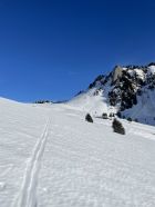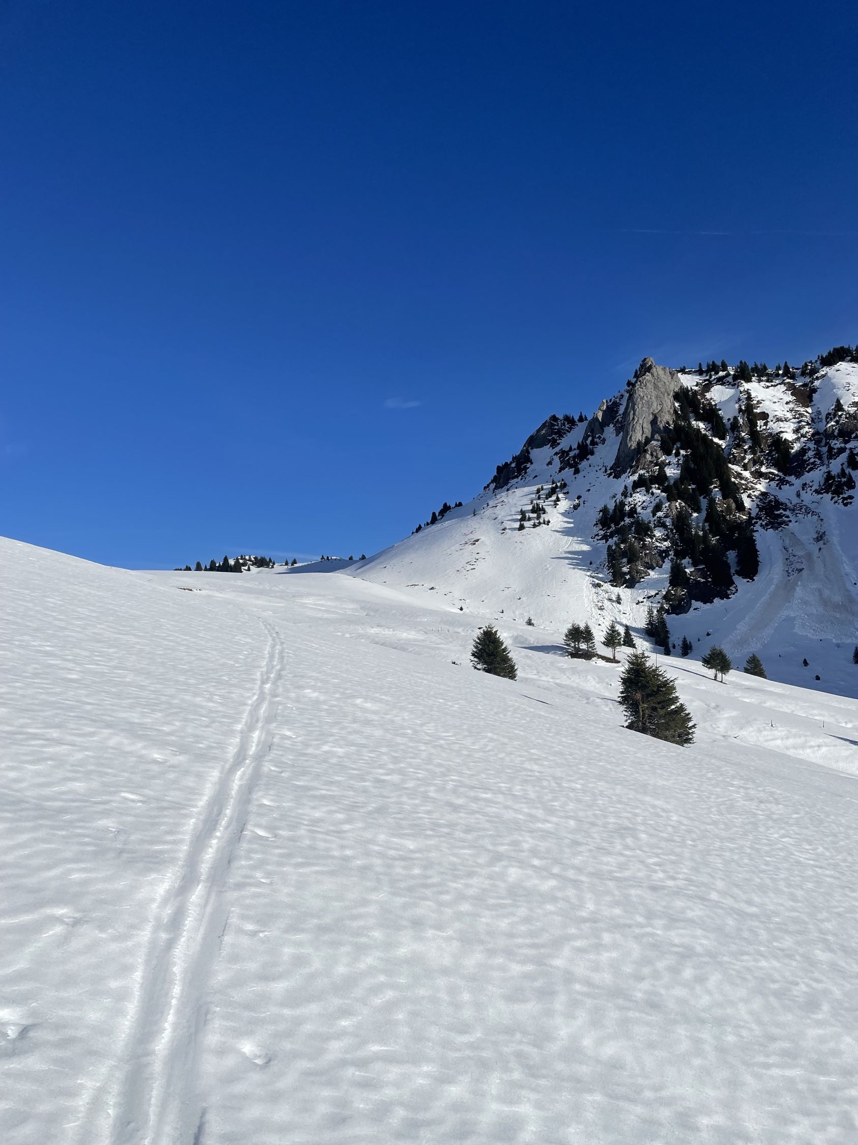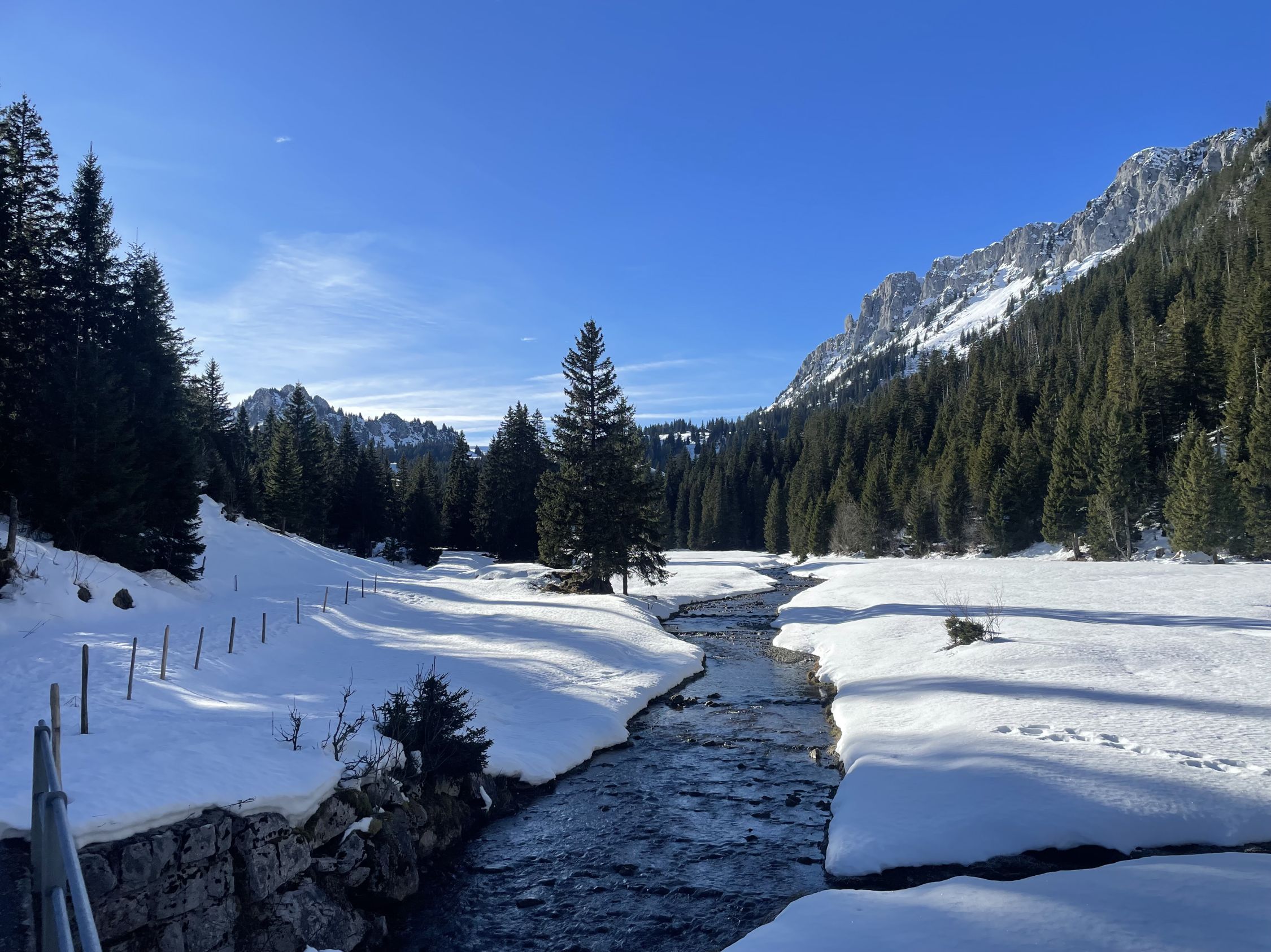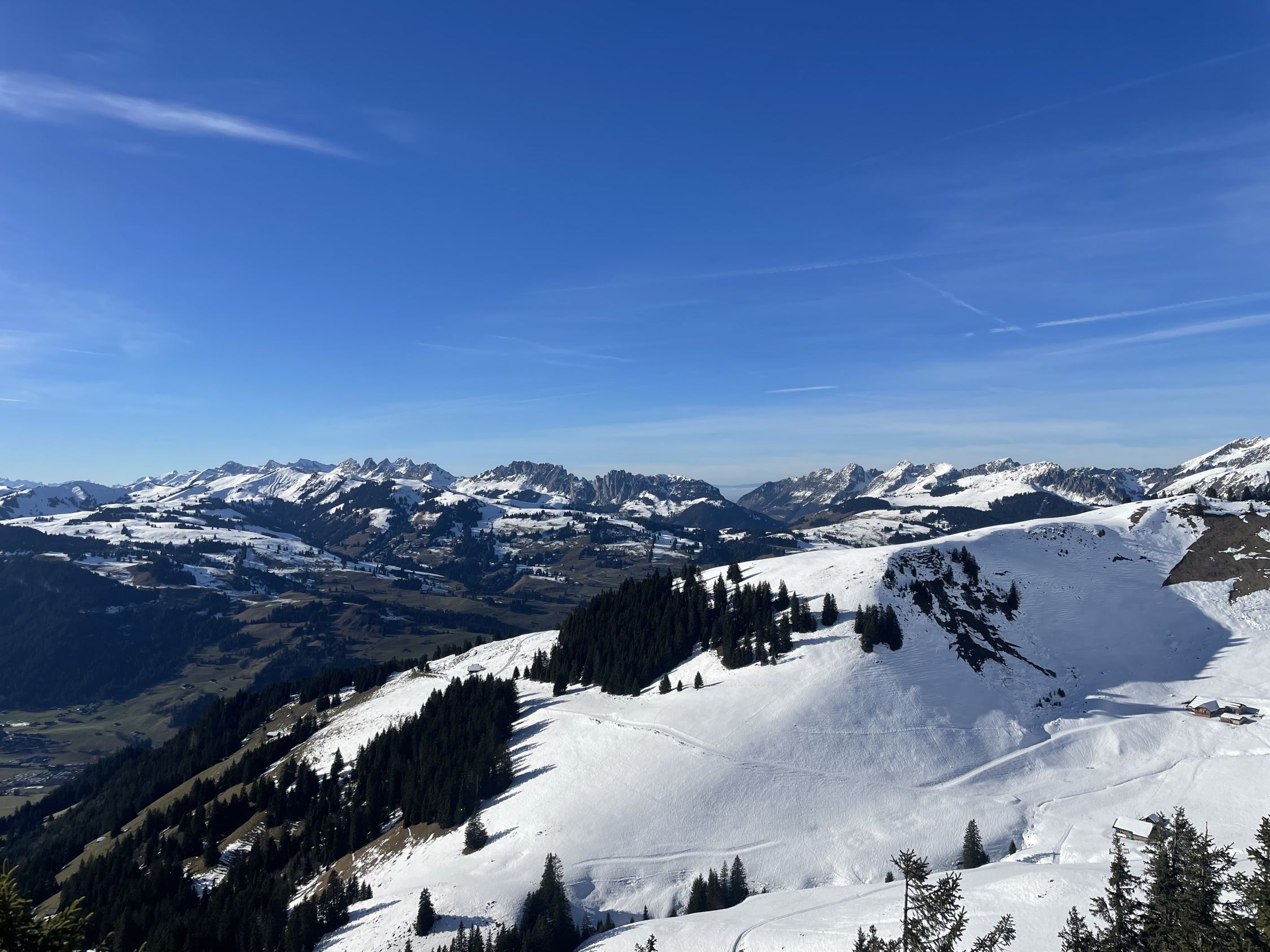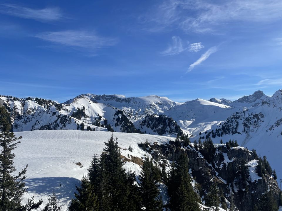 Ich hatte sehr tiefe Erwartungen und geradezu Motivationsprobleme heute und dachte, aufgrund des verregneten Schnees werde die Abfahrt sicher nix. Der Aufstieg über die Alpstrasse bestärkte mich in dieser Meinung, eisig und mit vielen Löchern… naja, am Brätliplatz immerhin hübsch winterlich und natürlich tolles Wetter und angenehme Temperaturen. Könnte alles deutlich schlimmer sein! Weiterer Aufstieg problemlos bis zum höchsten Punkt. Hübsche Rast und Blick zum Lueglespitz, wo Abfahrtsspuren auf guten Sulz deuteten. Entsprechend fuhr ich statt nach Obergestele in die südwestliche Richtung nach obere Berg und das war ein Volltreffer: schöner Sulz und genüssliche Schwünge. Dann Wiederaustieg unter dem Geisshöri durch bis zum Puur und dort noch die Hänge probieren: nicht soo toll, aber immerhin knapp tragende Kruste. So weiter bis zum Brüggli auf 1599, das war deutlich besser als befürchtet! Die Strasse dann bis zum Brätliplatz ok, darunter schon seehr mässig.