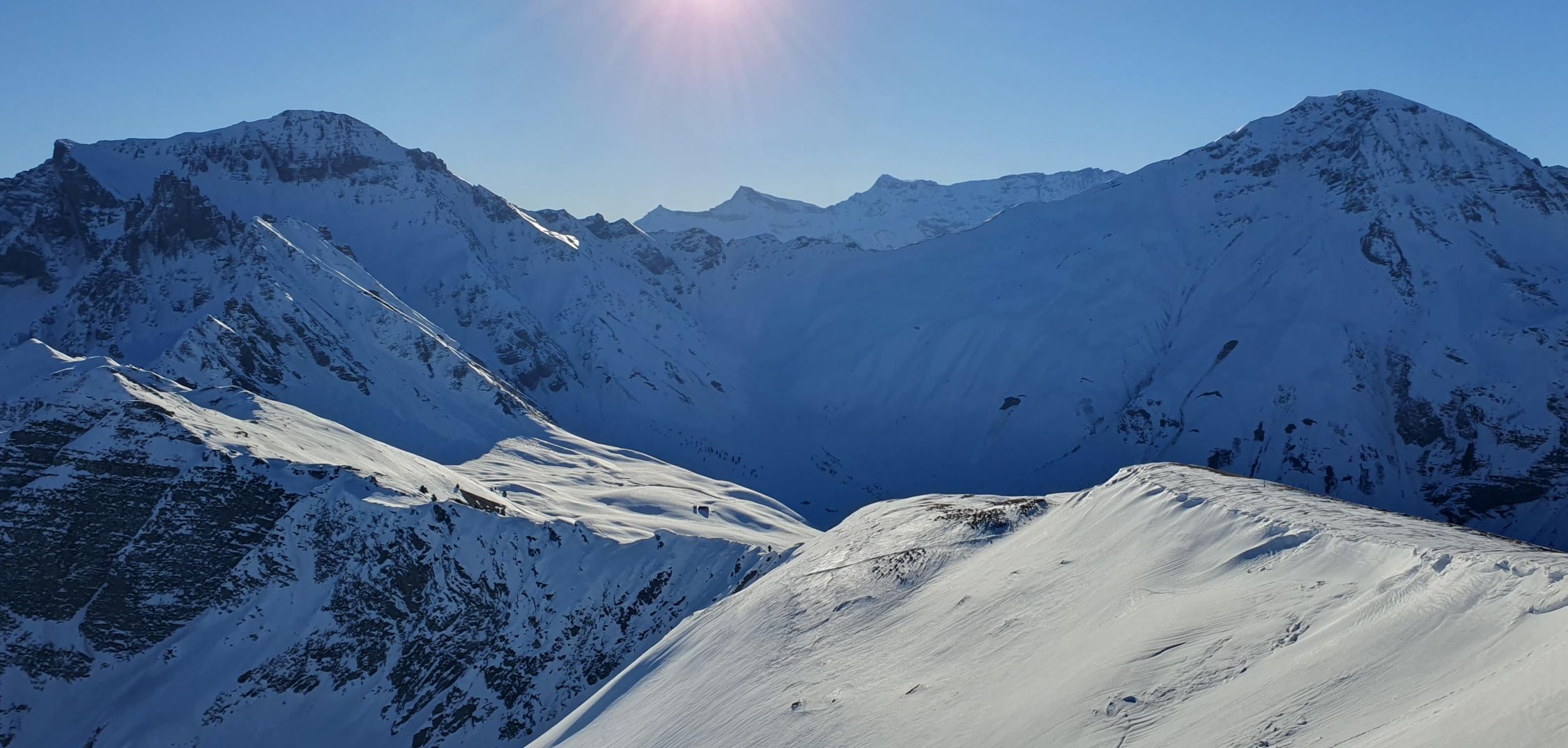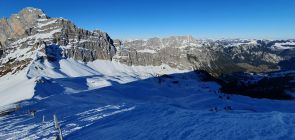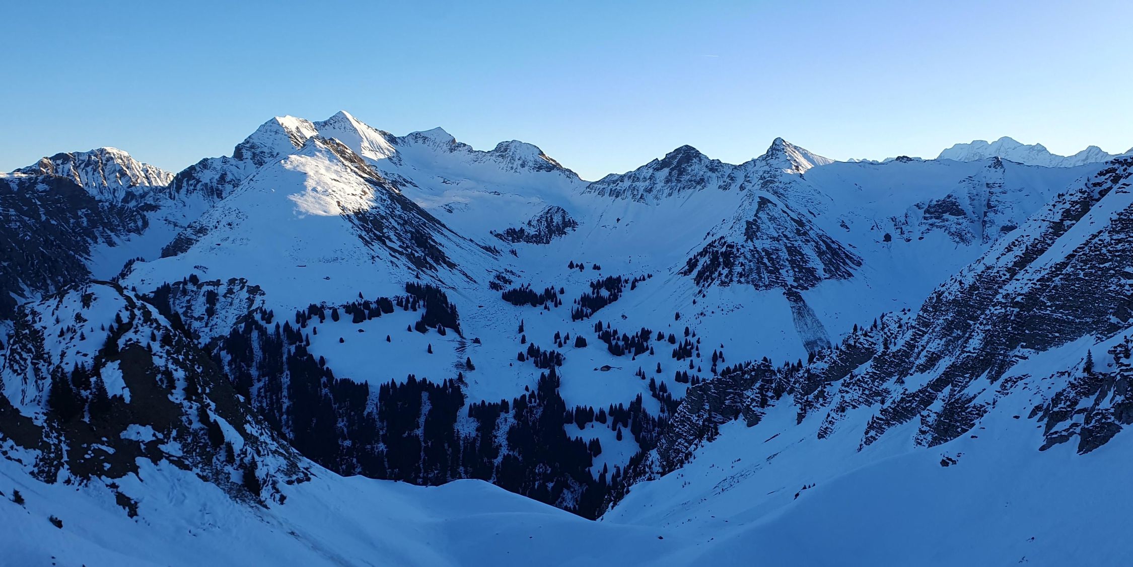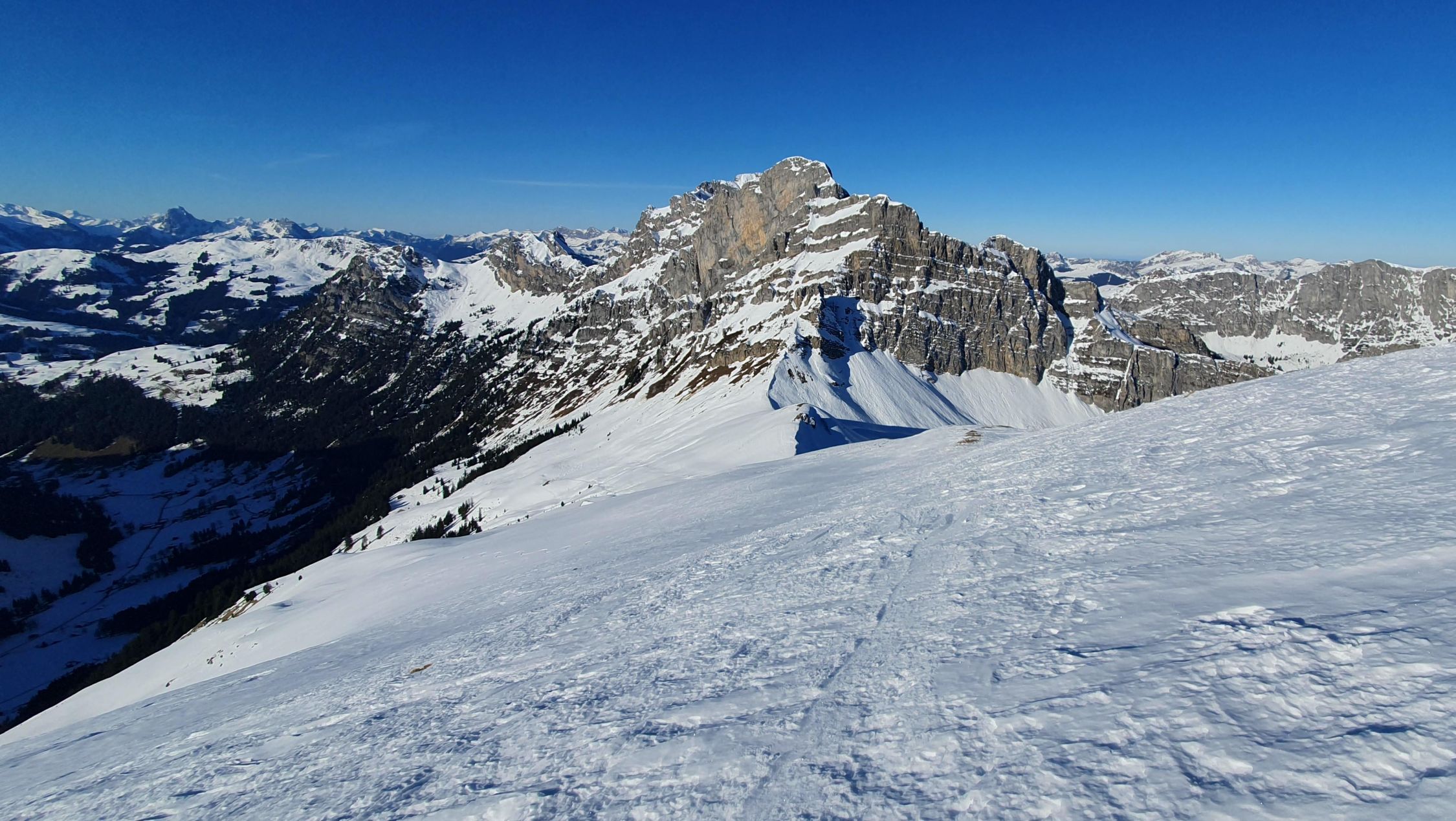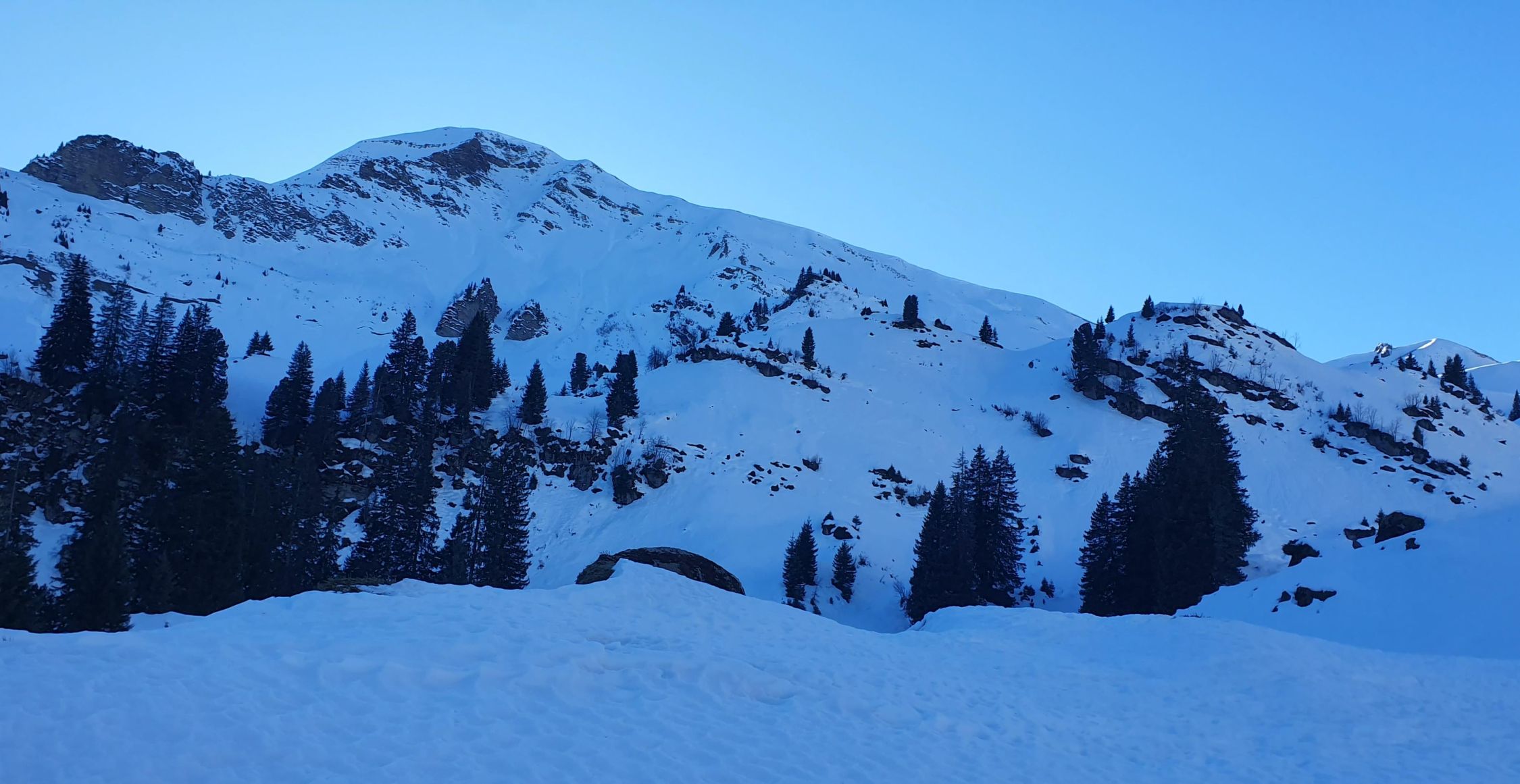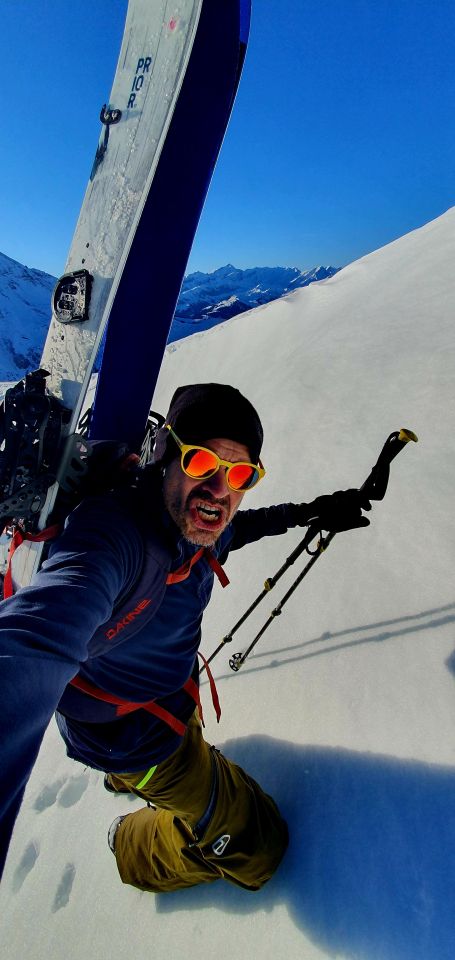 Ab 1850 m dann wieder besser. Rutsche können umgangen werden. Gipfelhang hart und bei so frühem Start "stürzen verboten - Terrain". Hatte heute keinen Kopf Ost abzufahren, drum Normalroute runter zur Grimmialp. Oben besser als erwartet. Wanderwege unten raus etwas ein Geeiere. Nicht mehr durchgehend Schnee, aber nur kurze Tragstellen.