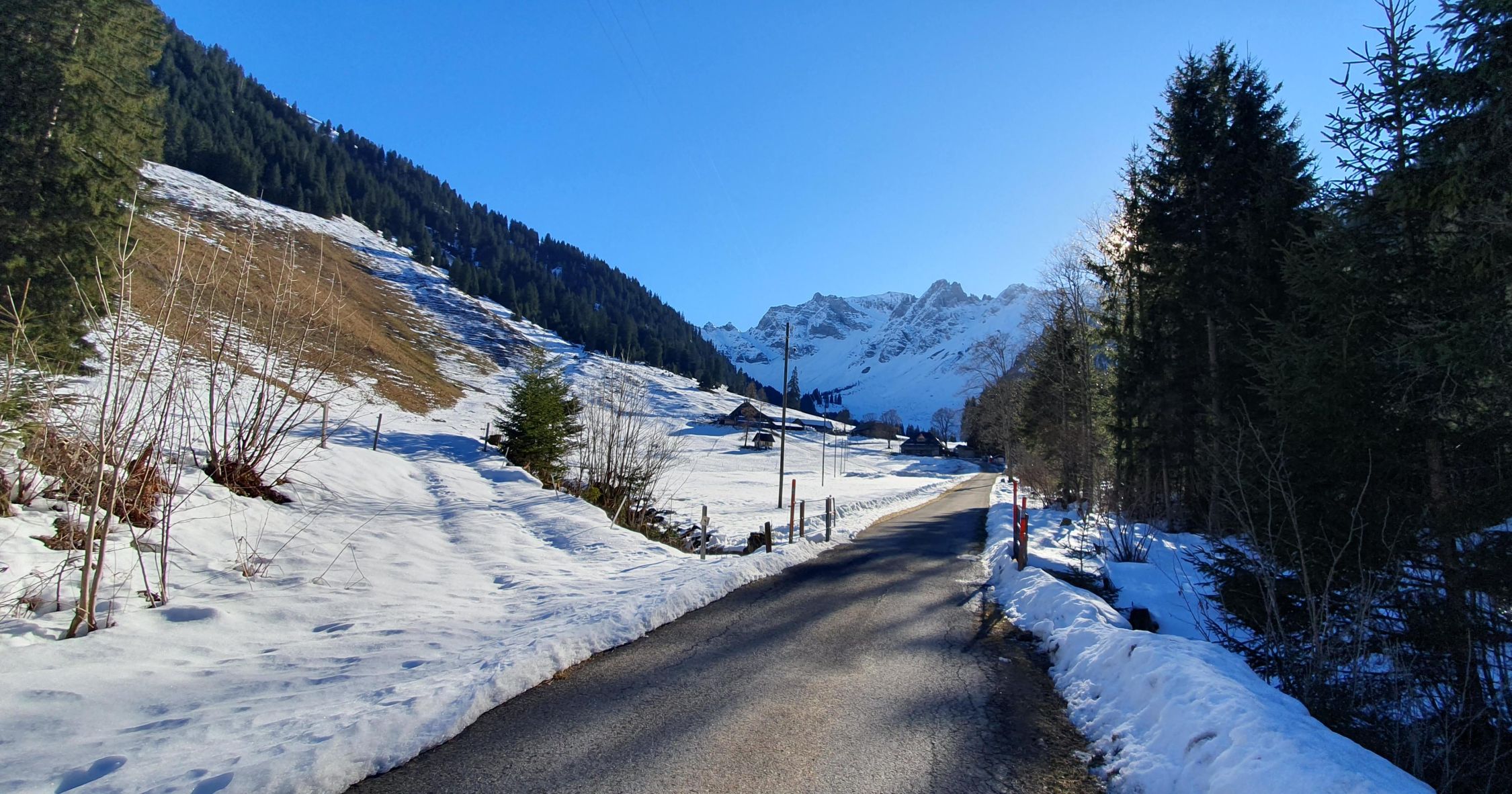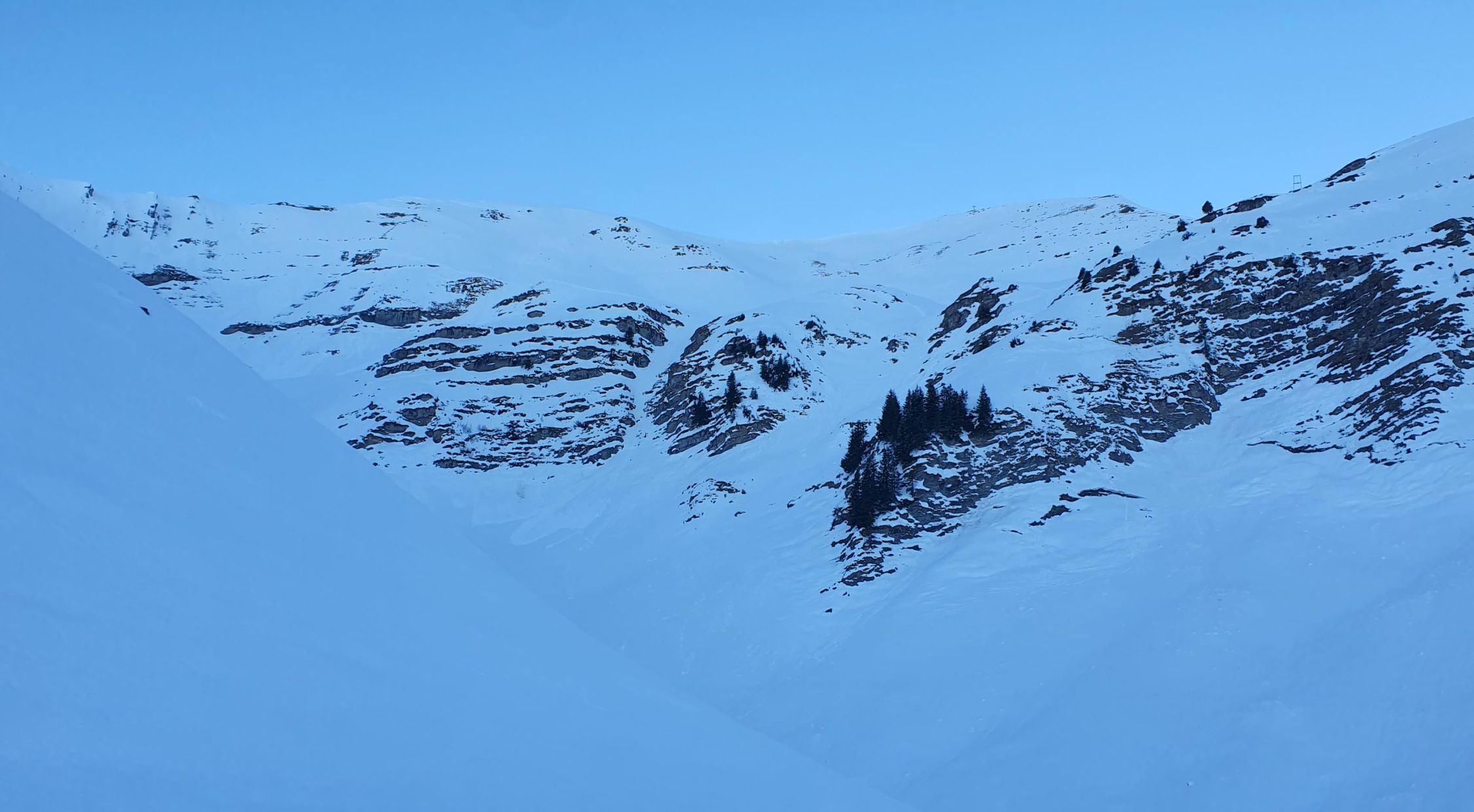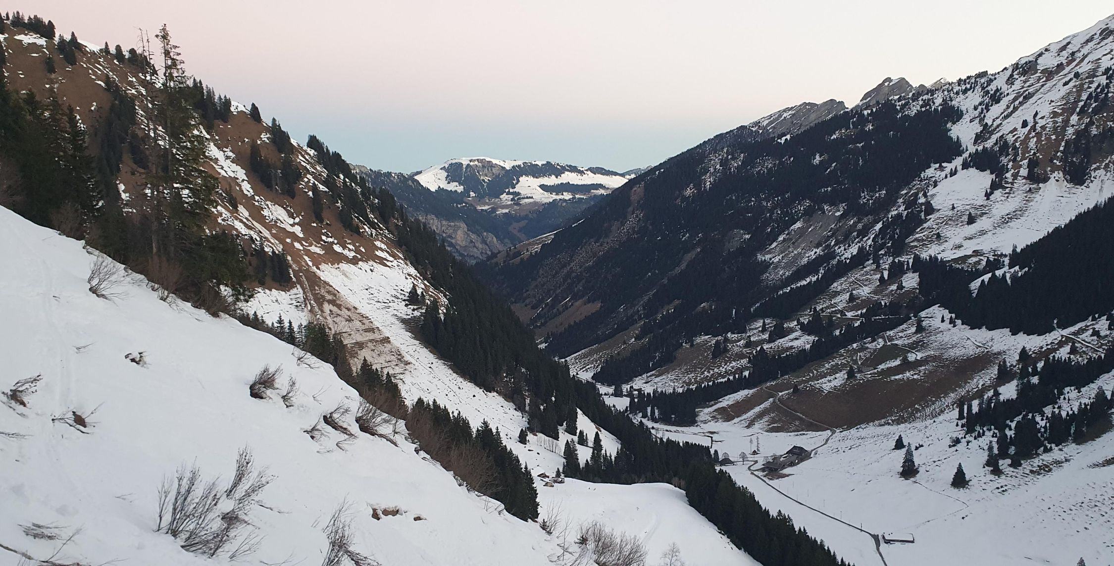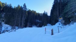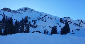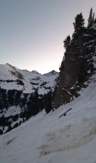 Start um 6.15 Uhr Parkplatz Fildrich bei -2 Grad. Auf Alpstrasse einige kleine alte Nassschnee-Rutsche zu queren. Ab der Alp Pkt. 1617 dann übler. Split tragen durch die Rutsche. Alte Spur durch Rutsche verschüttet. Querung gefrorene Rutschoberfläche mit Softboots mehr als grenzwertig...