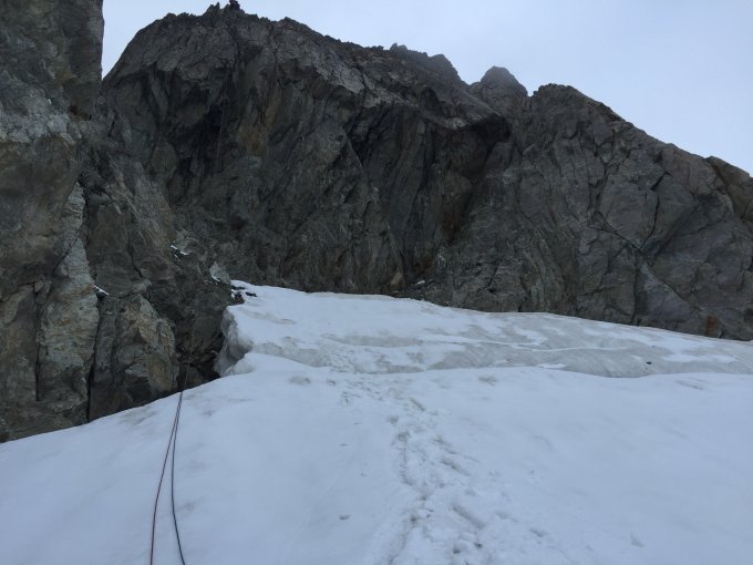 Ideale Verhältnisse. Im Zustieg sind die Schneefelder gut begehbar. Winzige Schneeflecken in der Route die aber - bis auf eine Stelle in der man leider Stand im Schnee machen muss - gut umgangen werden können. Im Abstieg sind Pickel und Steigeisen zwingend notwendig, da der Gletscher aper und steil ist. 2x60m Doppelseil haben sich für uns ausgezahlt, da wir so direkt gesichert über die recht morsch aussehenden Schneebrücken am Bergschrund abseilen konnten.