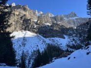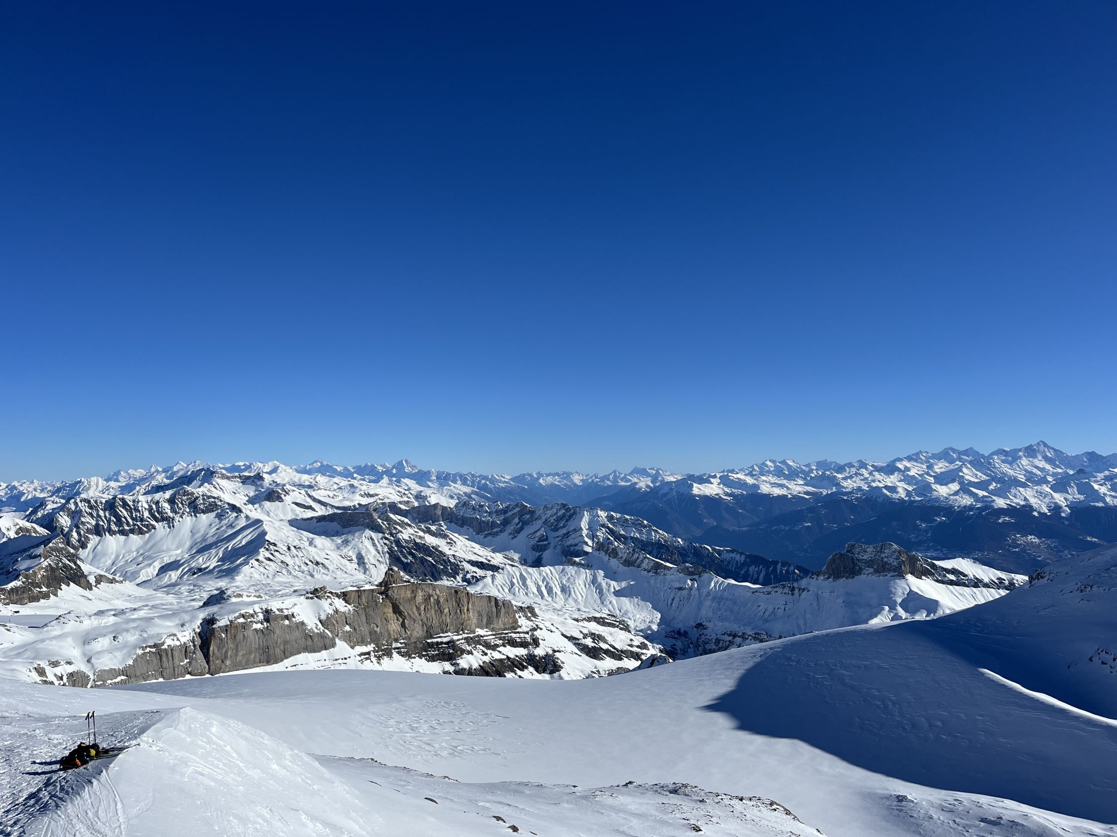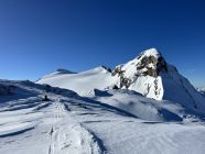 Aufstieg ab Parkplatz gut machbar, minimale Tragestellen auf dem Fahrweg. Ab Talstation Oldealp-Sessellift auf der Skipiste statt auf der Skiroute, daher Aufstieg etwas mühsam an den steileren Stellen der frisch gewalzten Piste, teils ausgewichen an den Rand oder kurz die Ski getragen. Ab Oldesattel weiter auf der flachen Piste. Die Fixseile vom Dome zum Abstieg auf den Diableretsgletscher sind frei und der Übergang auf den Gletscher problemlos. Dieser ist gut eingeschneit, keine Spalten sichtbar.