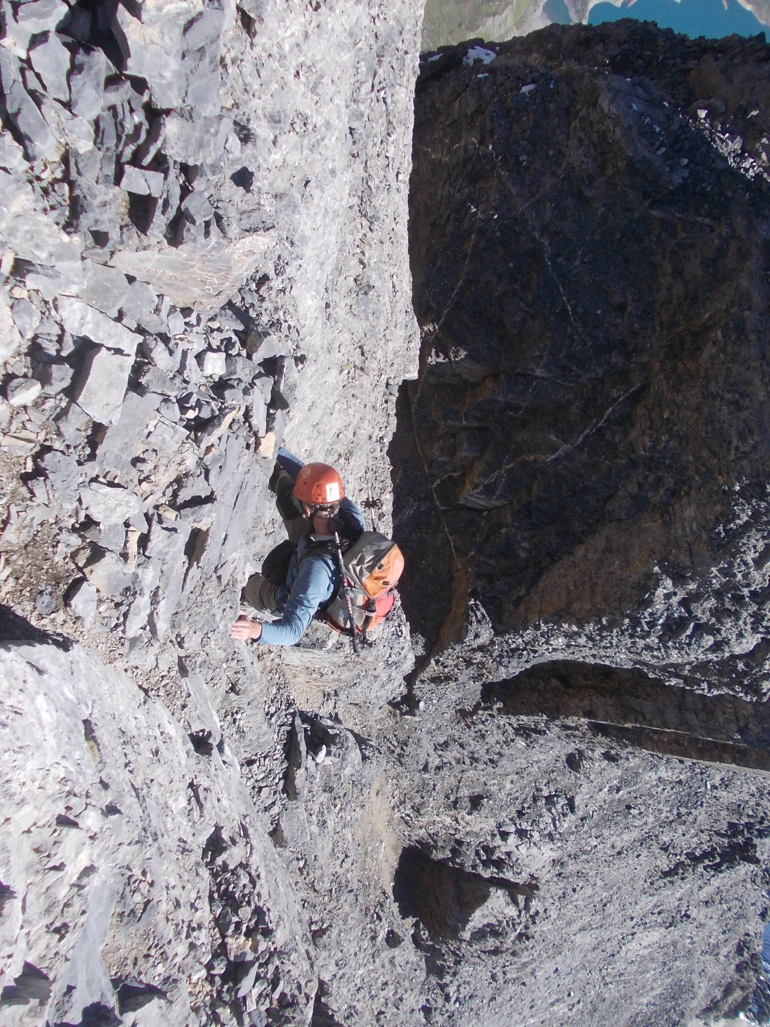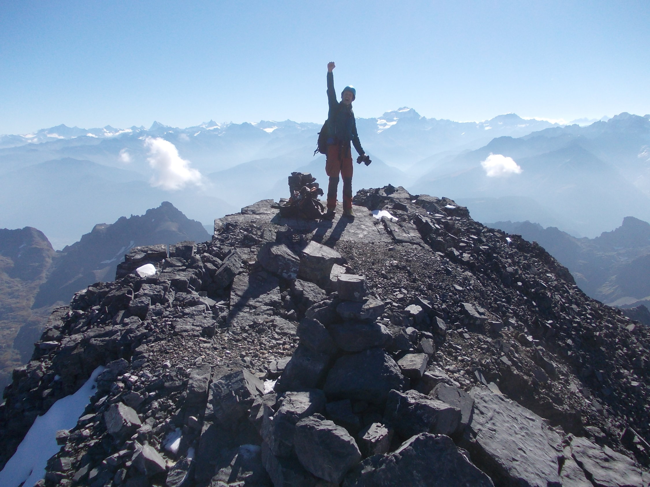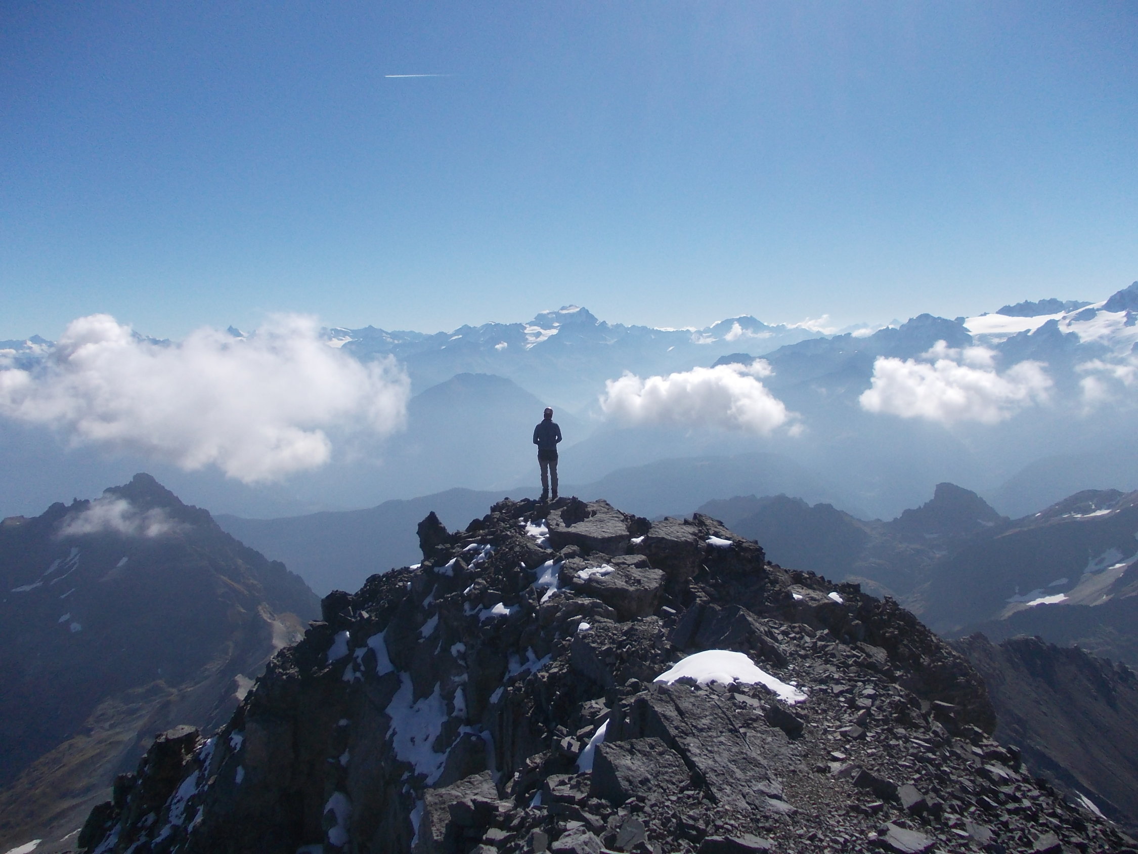 Alles bestens, bis auf die Tatsache, dass an diesem eigentlich selten begangenen Berg noch zwei weitere Gruppen unterwegs waren. Ein gleichzeitiger Aufstieg von der Epaule aus zum Gipfel wäre verheerend! Da wir mit der vor uns steigenden Dreiergruppe keinen verbalen Kontakt hatten, kam es prompt zum Missverständnis: als wir sahen, dass die Drei kurz vor dem Gipfel waren, gingen wir von der Schulter aus zügig los, in der Hoffnung, dass die Gruppe am Gipfel warten würde, bis auch wir oben sind. Unterwegs vernahmen wir plötzlich klackende Steinschlaggeräusche und Stimmen. Wir konnten gerade noch rechtzeitig in Deckung gehen, als es auch schon Steinbrocken hagelte. Wir verharrten dann unter einem Felsvorsprung, bis die Gruppe bei uns war. Sie hatten ihren Gipfelaufenthalt auf ein Minimum beschränkt, um gleich wieder abzusteigen und uns so den Weg freizumachen. Als wir weiterstiegen, konnten wir eine weitere Dreiergruppe im Aufstieg beobachten. Wir lagen gut in der Zeit, Wetter und Panorama waren perfekt, also warteten wir, bis diese Gruppe den Gipfel erreicht hatte. Wir erbaten uns dann für den Abstieg einen Vorsprung.