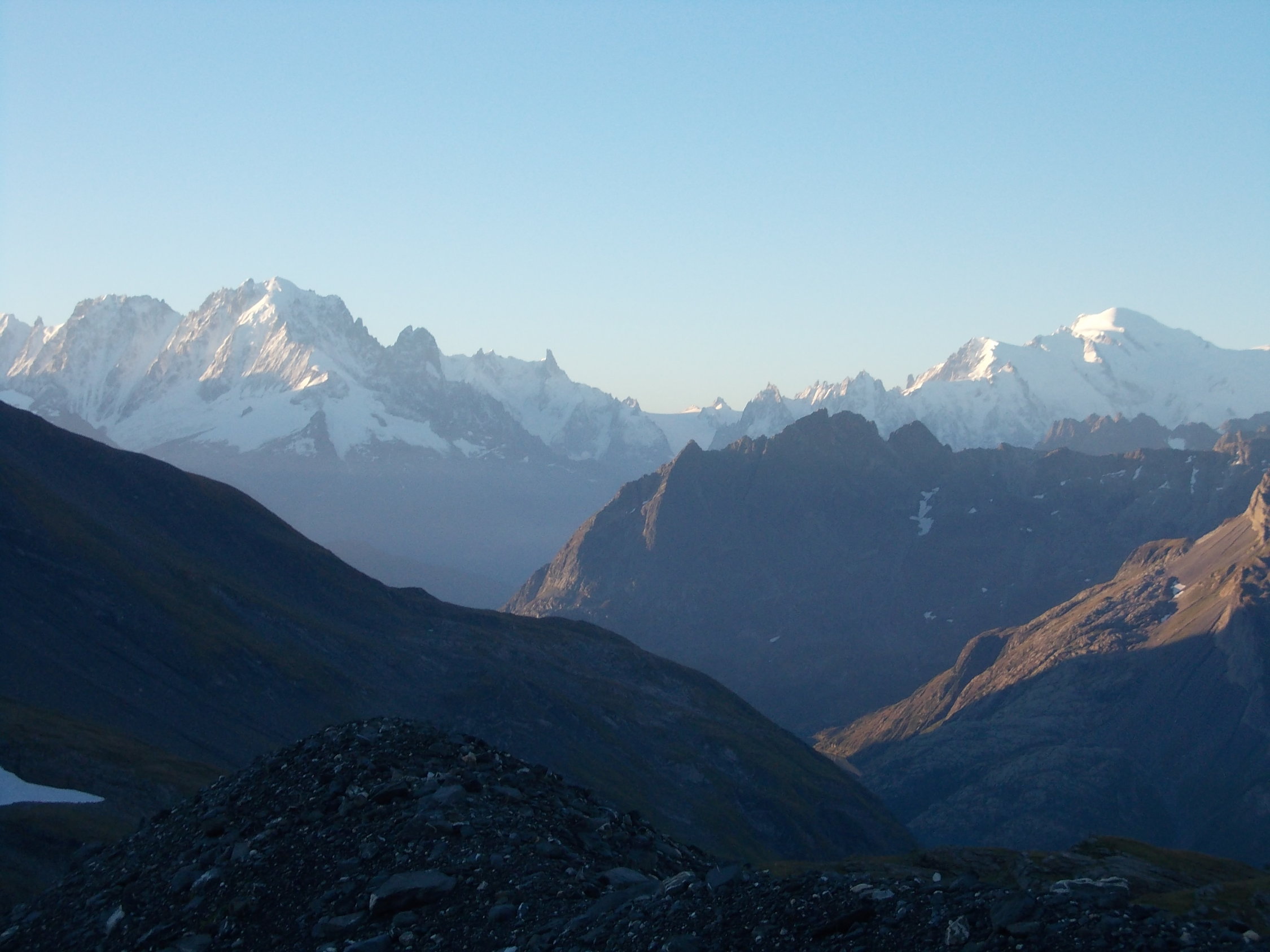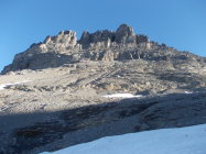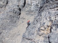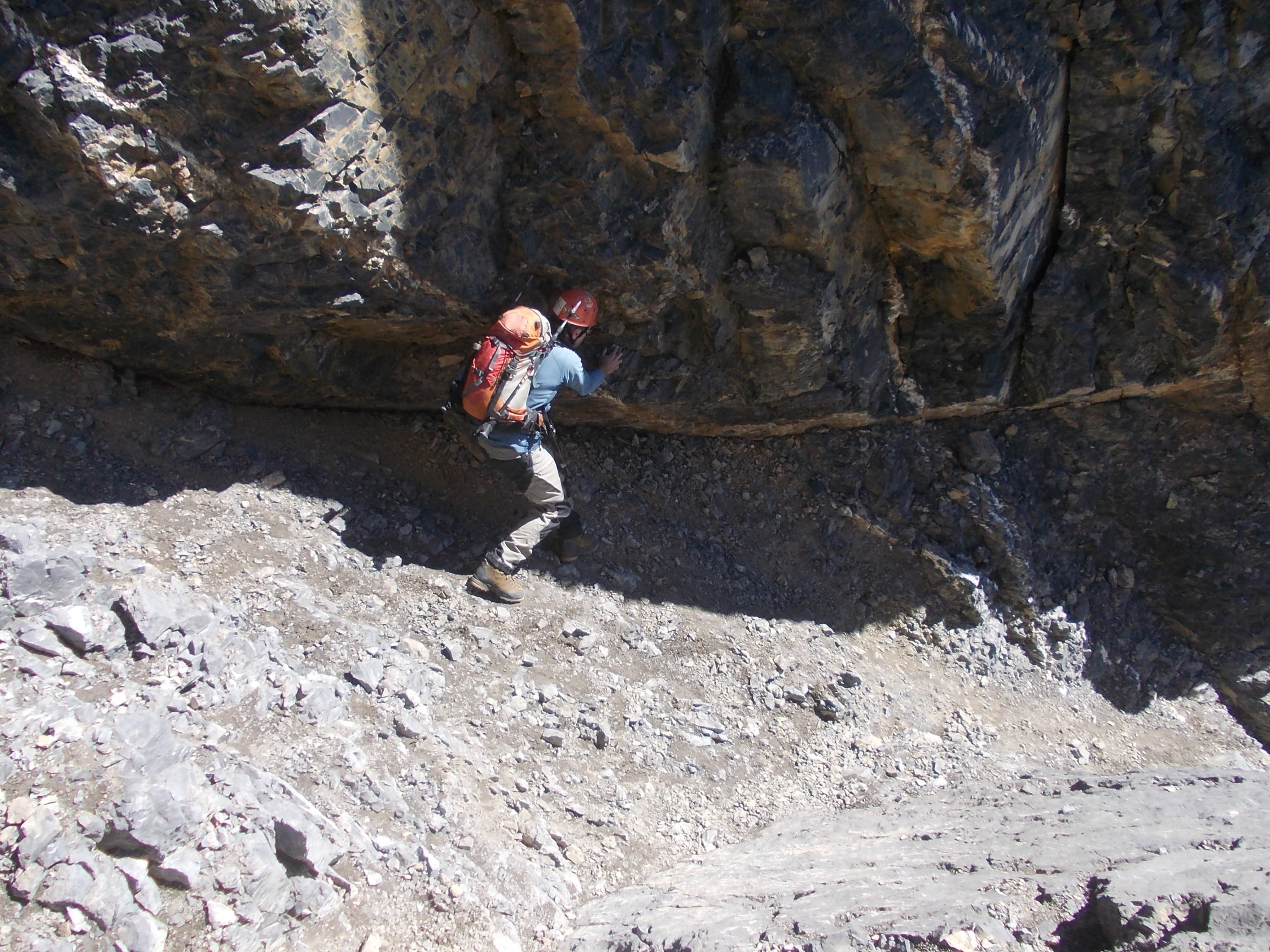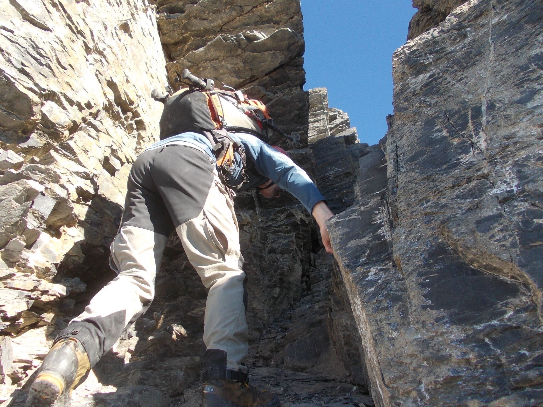 Alles bestens, bis auf die Tatsache, dass an diesem eigentlich selten begangenen Berg noch zwei weitere Gruppen unterwegs waren. Ein gleichzeitiger Aufstieg von der Epaule aus zum Gipfel wäre verheerend! Da wir mit der vor uns steigenden Dreiergruppe keinen verbalen Kontakt hatten, kam es prompt zum Missverständnis: als wir sahen, dass die Drei kurz vor dem Gipfel waren, gingen wir von der Schulter aus zügig los, in der Hoffnung, dass die Gruppe am Gipfel warten würde, bis auch wir oben sind. Unterwegs vernahmen wir plötzlich klackende Steinschlaggeräusche und Stimmen. Wir konnten gerade noch rechtzeitig in Deckung gehen, als es auch schon Steinbrocken hagelte. Wir verharrten dann unter einem Felsvorsprung, bis die Gruppe bei uns war. Sie hatten ihren Gipfelaufenthalt auf ein Minimum beschränkt, um gleich wieder abzusteigen und uns so den Weg freizumachen. Als wir weiterstiegen, konnten wir eine weitere Dreiergruppe im Aufstieg beobachten. Wir lagen gut in der Zeit, Wetter und Panorama waren perfekt, also warteten wir, bis diese Gruppe den Gipfel erreicht hatte. Wir erbaten uns dann für den Abstieg einen Vorsprung.