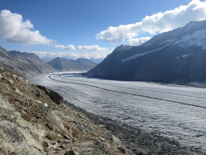 Wir sind von Fiescheralp gestartet, zum Marjälensee, dann Aufstieg über den Großen Aletschgletscher. Weder der Zugang noch der Ausstieg von der zweiten Moräne sind leicht zu finden. Wir sind ein wenig unter der Konkordiahütte vom Gletscher hinausgequert. Den Hüttensporn kann man unterhalb über Geröllfelder umrunden, ohne den Weg hoch- und die Treppen wieder herunter zu steigen.