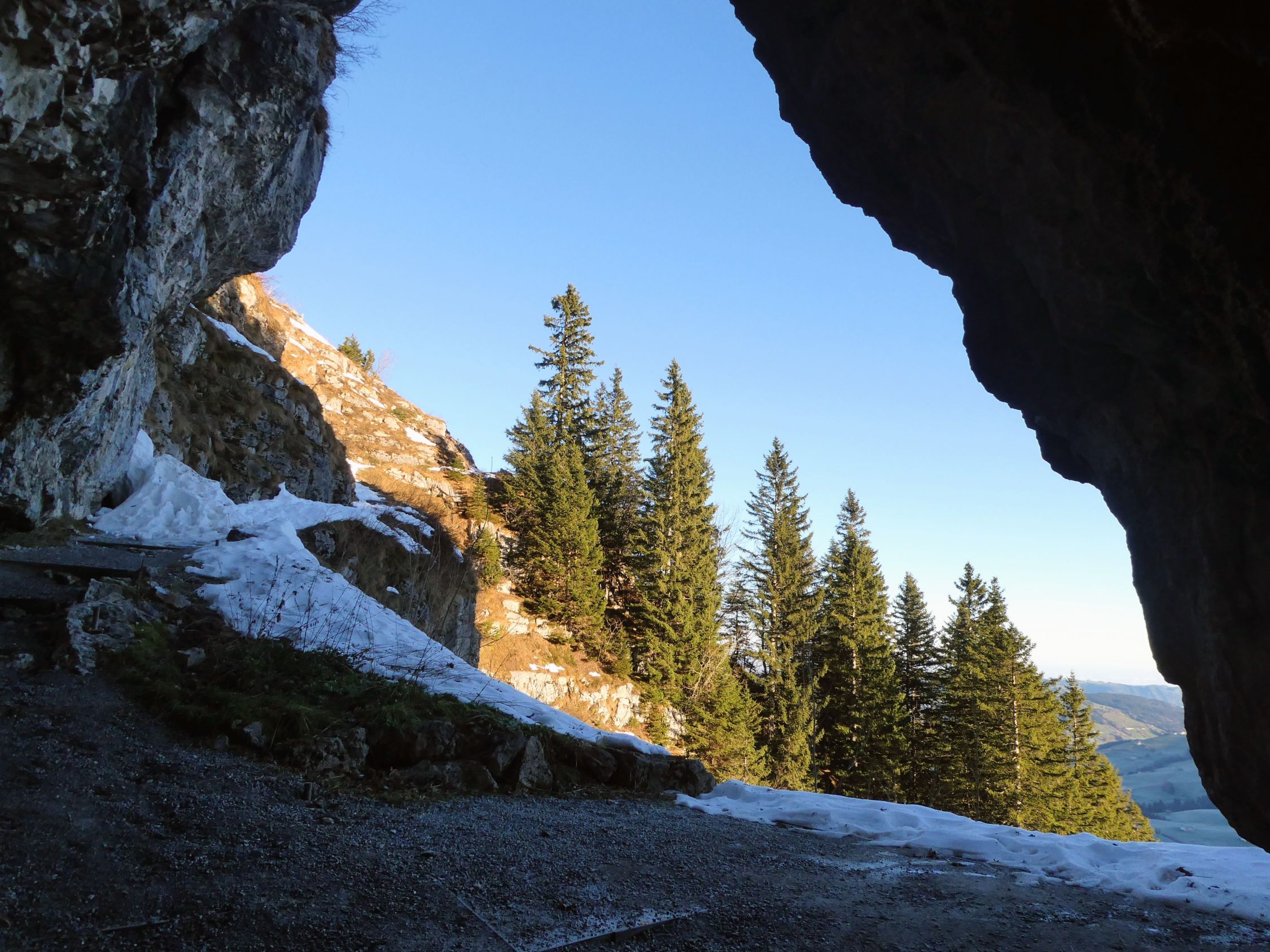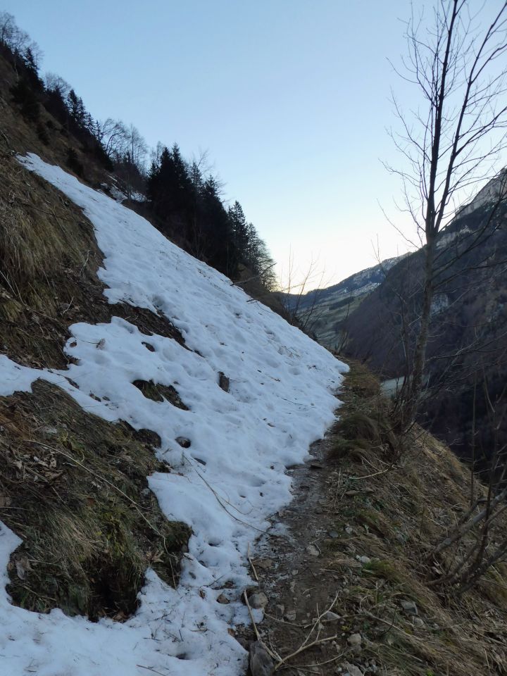 Auf dem Äscherweg oberhalb von Chlus liegen momentan erste harte Schneefelder, die gespurt sind, aber doch etwas Vorsicht verlangen.