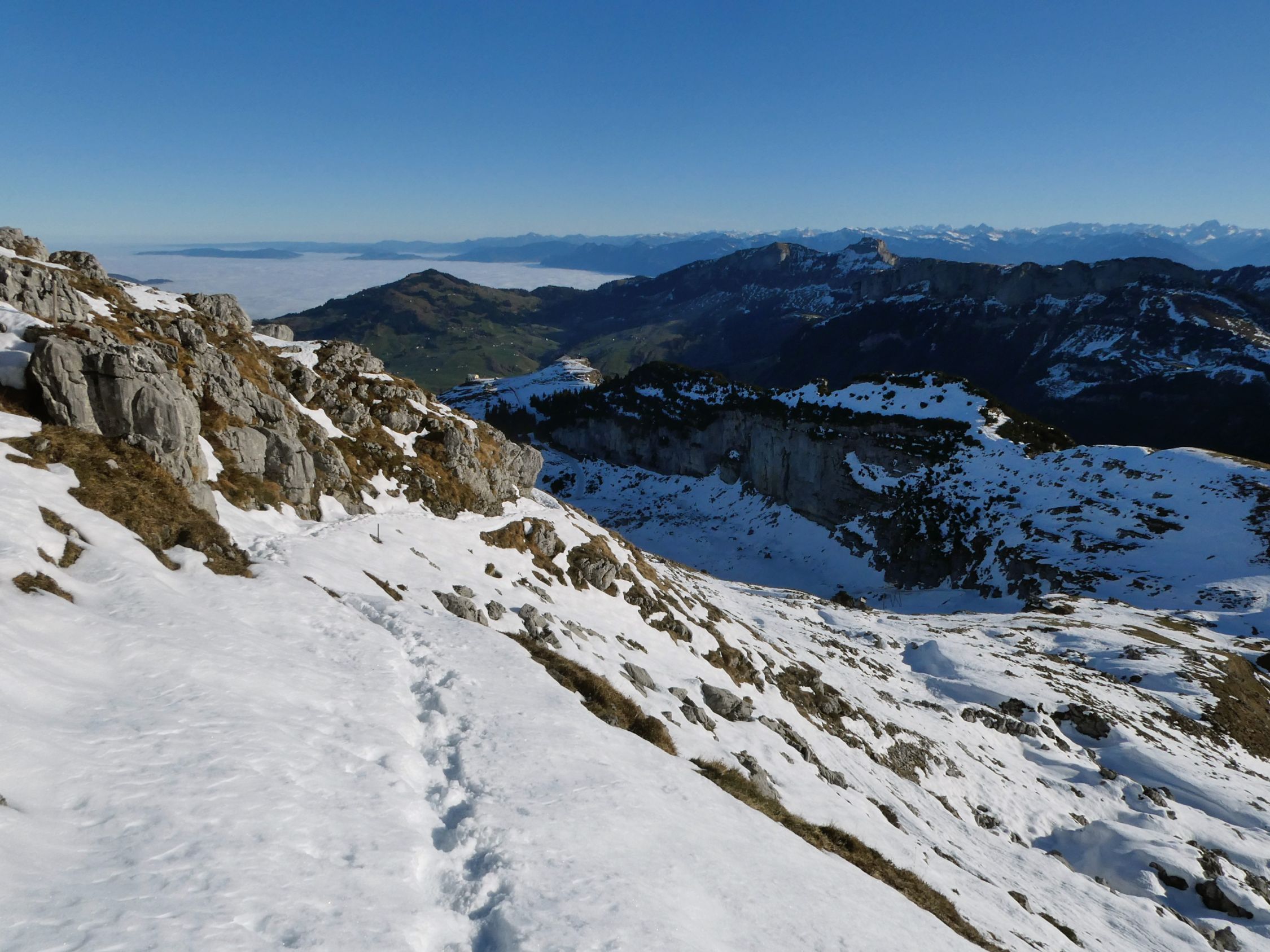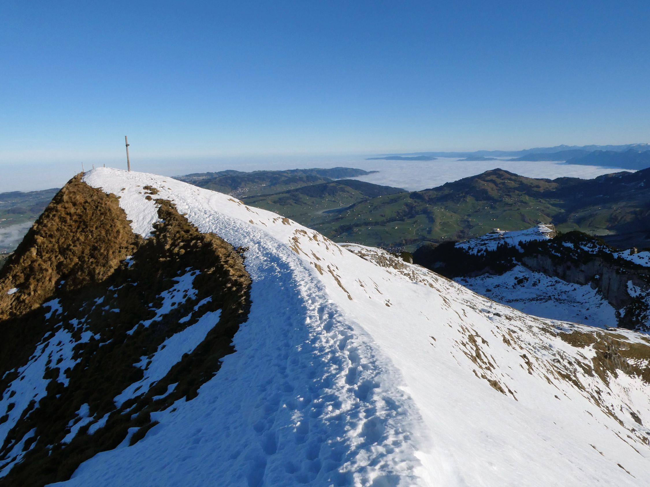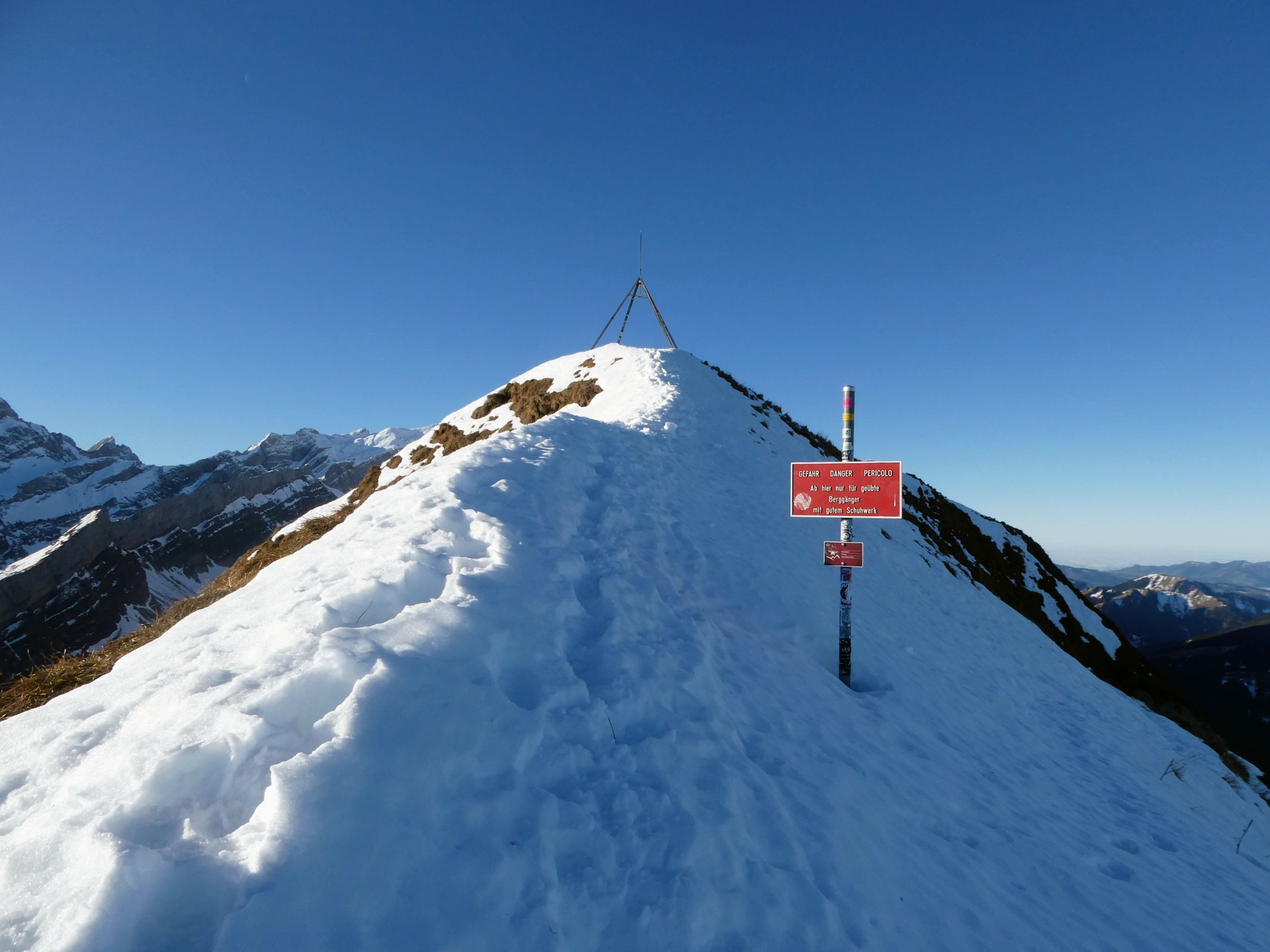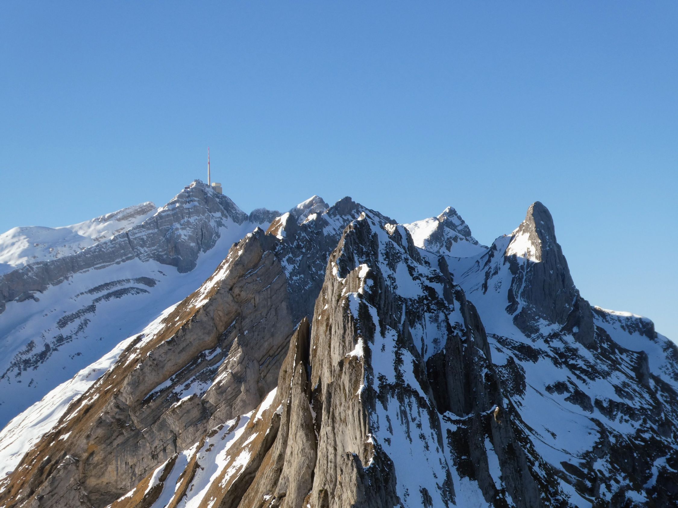 Heute traf ich mal wieder keine Menschenseele bis zum Gipfel. Erst zwischen Füessler und Äscher war mehr los; dort waren rund 15 Kletterer in ihrem Element. Unter dem Äscher kam mir noch eine handvoll Wanderer entgegen.