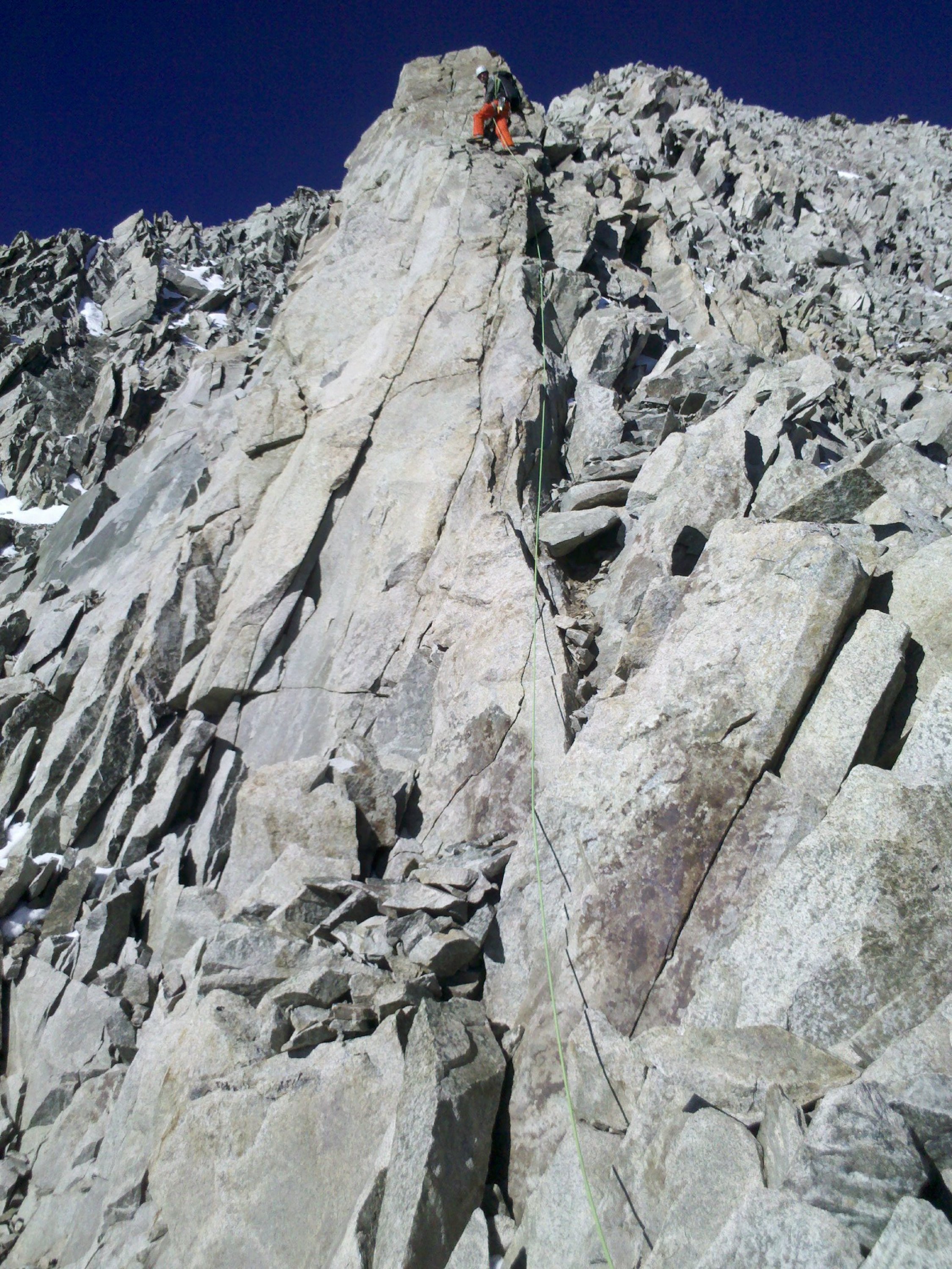 Top Verhältnisse. Wenig Schnee auf dem E-Sporn, Gletscher gerade genug eingeschneit, teils spaltig, i.A. aber vernünftig querbar. Westgrat oben mehr Schnee, plattige Stücke teils nicht so schön mit Schnee. Mittelteil des Westgrates doch recht schuttig ;) . E-Sporn dafür sehr schöne Kletterei und Fels, grösstenteils recht kompakt.