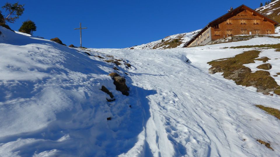 Motiviert, so um 11 Uhr (kurz entschlossen und für Langschläfer perfekt), geht´s also los. Recht bockig ist dann der erste steilere Hang. Alles pickelhart mit Gräben und tiefen Stapfen. Aber halb so wild. Kurzer Fussmarsch und schon sind die Skier wieder am Bein. Der Rest ist Genuss ! Bei Sonne pur geht´s vorbei an der Ragazalpe in die teils aufgefirnten Südhänge unter dem Ragazer Blanken, dann querend hinüber und über den schönen Gipfelhang auf den Sünser Kopf.