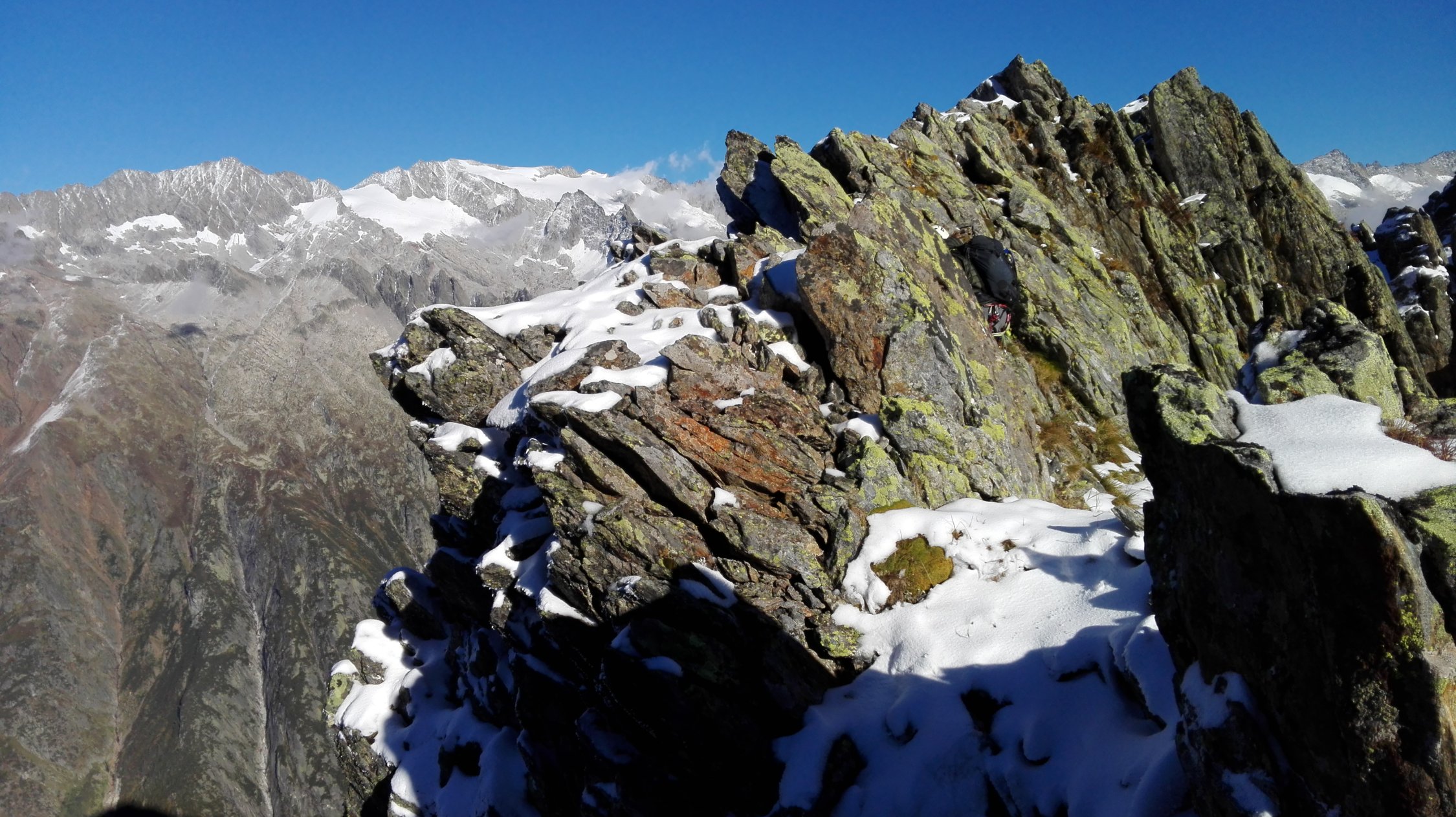 Die Verhältnisse waren der Jahreszeit entsprechend. Am Montagmorgen lag ab 2000m Neuschnee, welcher über das Wochenende gefallen war. Sonnenseitig schmolz dieser im Laufe des Tages bis in höhere Lagen (über 3000m) ab. NW-NO seitig blieb der Neuschnee weitgehend liegen. Auf dem Grat ergaben sich denn auch realtiv anspruchsvolle Verhältnisse; südseitig trocknete der Felsen erst am Nachmittag aus und in Kammlage sowie nordseitig waren Griffe und Tritte vom Schnee freizuwühlen. Keile & Friends sind äusserst hilfreich bei solchen Bedingungen in einer Route, wo nicht jeder Stein fest sitzt.