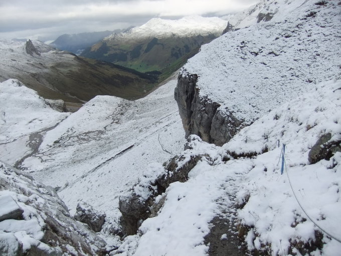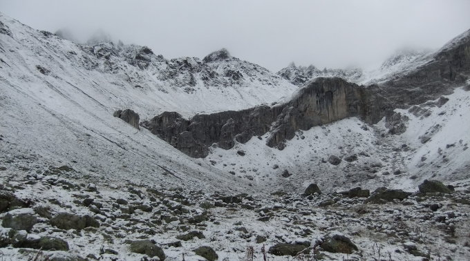 Alle Gipfel und Regionen über 2200 m weiß eingezuckert. Der Tag war wettermäßig flexibel. Graupelschauer und Sonne wechselten sich wenigstens ein Dutzend mal ab. Kontinuierlich blieb nur der Nebel in den Gipfelregionen. So daß mir leider Tief- und Fernblicke vorenthalten blieben.