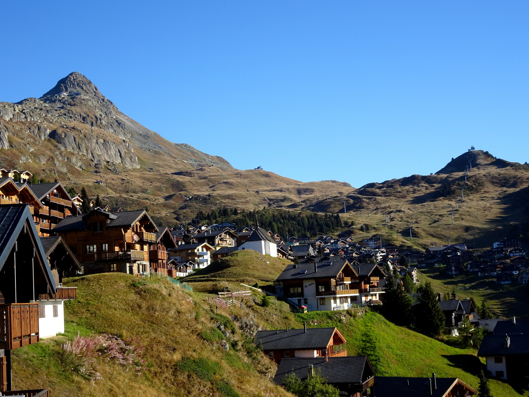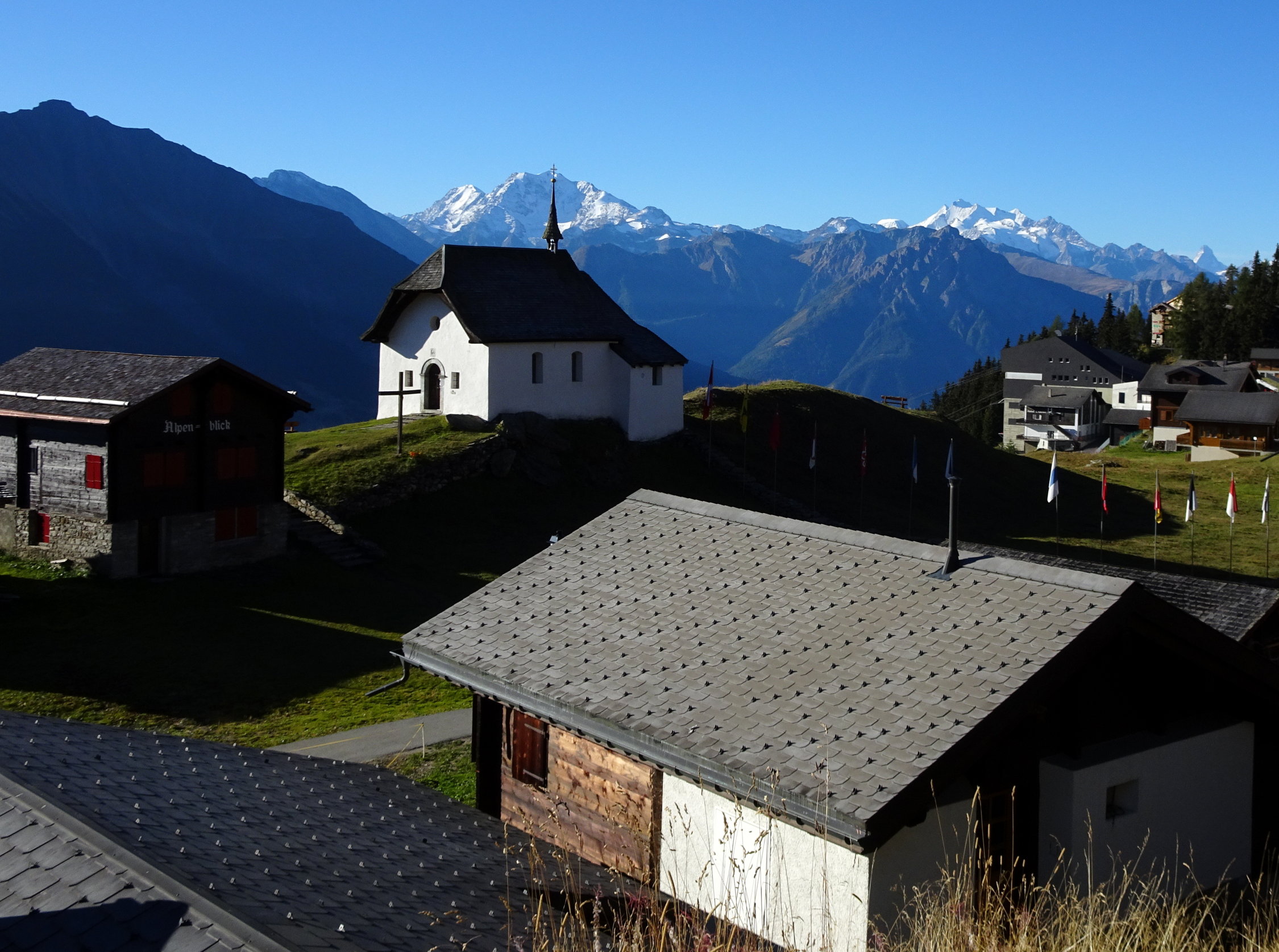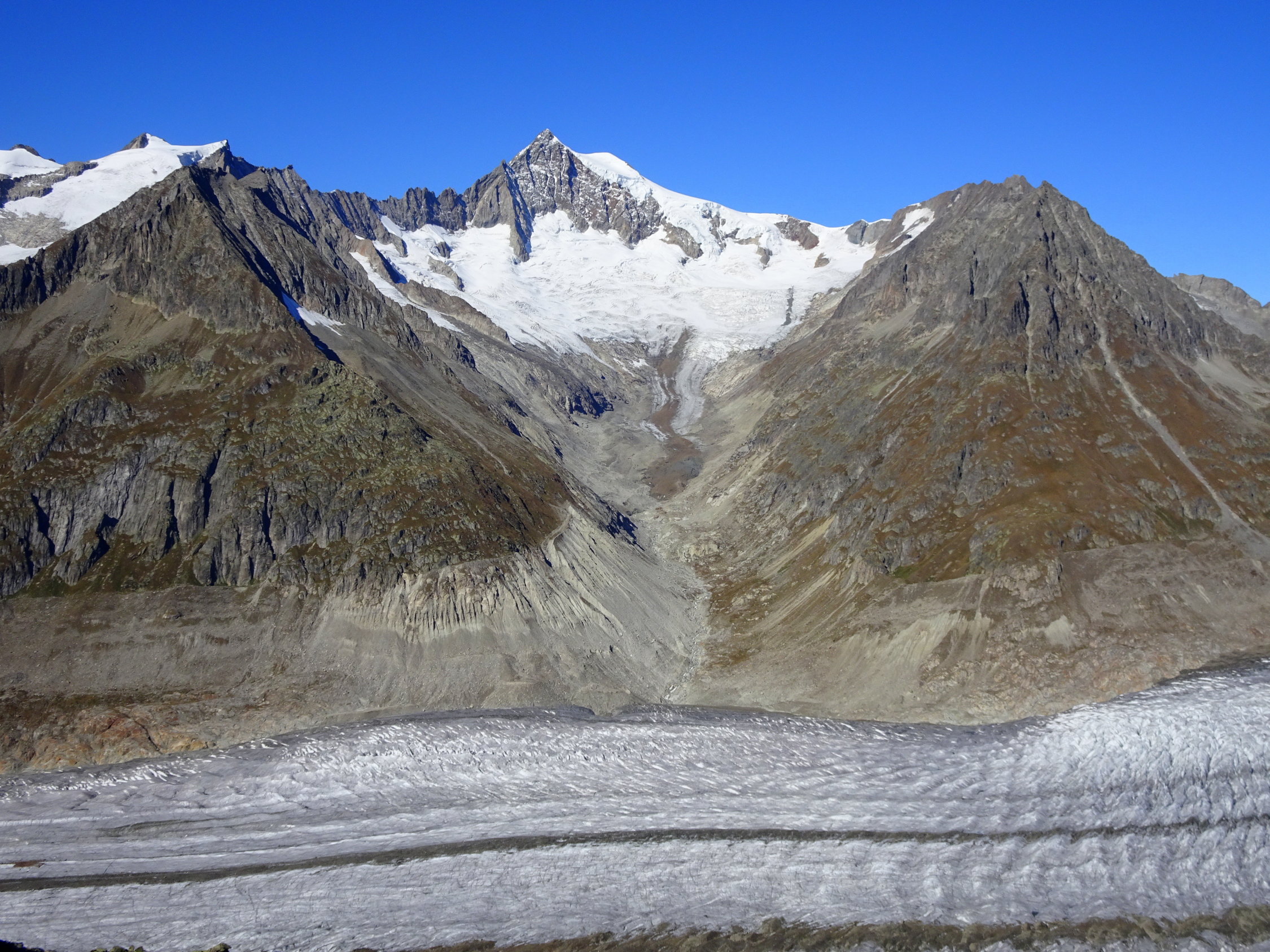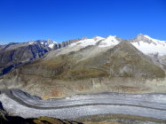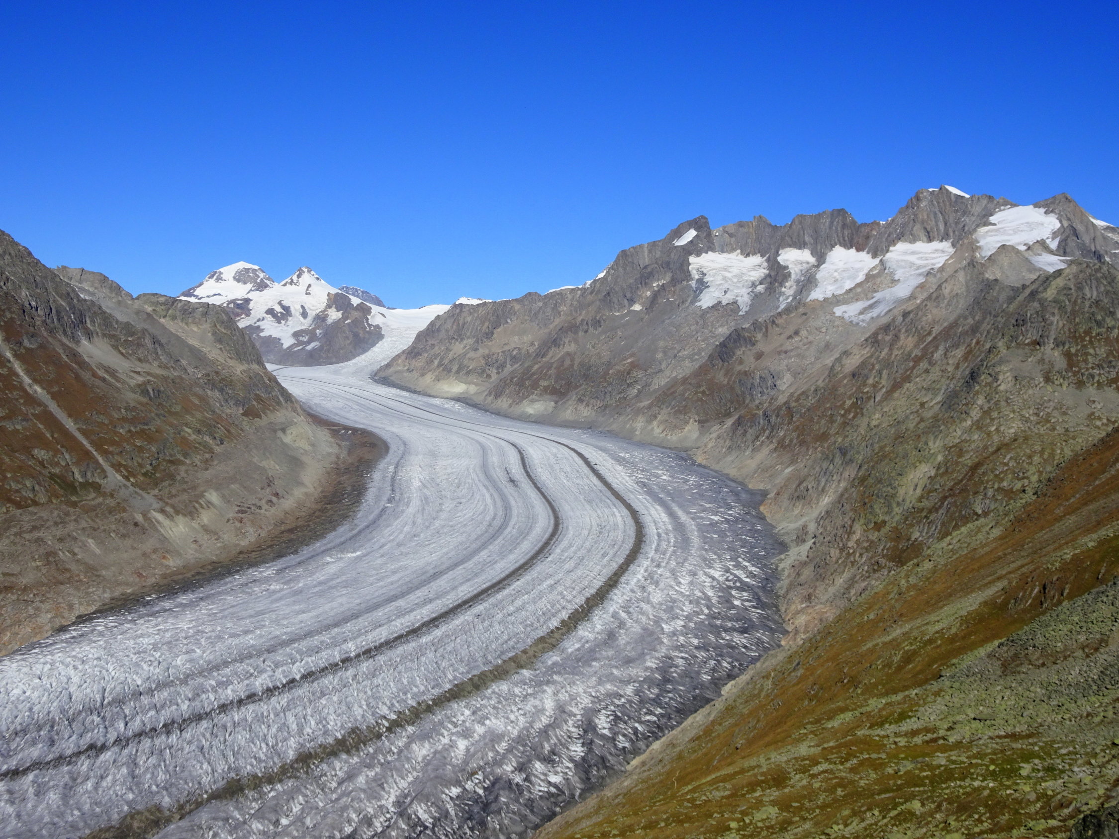 Wir wollten den gemütlichen Weg von der Station Bettmerhorn über dem Aletschwaldrücken und Moosfluh zur Riederfurka und Riederalp gehen. Eine landschaftlich wunderbare Tour und ohne Aufstieg. Beim Kaffee in der Notbar (Das Restaurant wird umgebaut) kam uns die Idee, das kurze Stück von ca. 220 Hhm. zum Bettmerhorn zu gehen, um eine bessere Aussicht zu haben. Und erst noch einen Gipfel. Die Geschichte entwickelte sich folgendermassen: Auf dem Bettmerhorn Gipfel hatten wird das Gefühl, man sehe zu wenig vom Aletschgletscher, also gingen wir in leichter Steigung weiter bis zur nächsten Spitze. Diese stellte sich als zu wenig Hoch und ergiebig aus, da gingen wir weiter bis der Fotograf zufrieden war. Mit dieser Methode der kleinen Schritte fanden wir uns plötzlich auf halbem Weg zwischen Bettmerhorn und Eggishorn. Nach kurzer Beratung wurde beschlossen, dass der Weiterweg zur Elselicka kürzer und schöner sei als den zur Bettmerhorn Station zurück. Bei der Elselicka gab es keine Diskussion, den Klettersteig hatten wir nicht im Programm, eine Skipiste hinaufwandern noch weniger, so stiegen wir nach Kühboden hinunter, wobei wir einer optischen Täuschung erlagen. Der Abstieg zur Station Kühboden ist weiter als es von oben aussieht.
