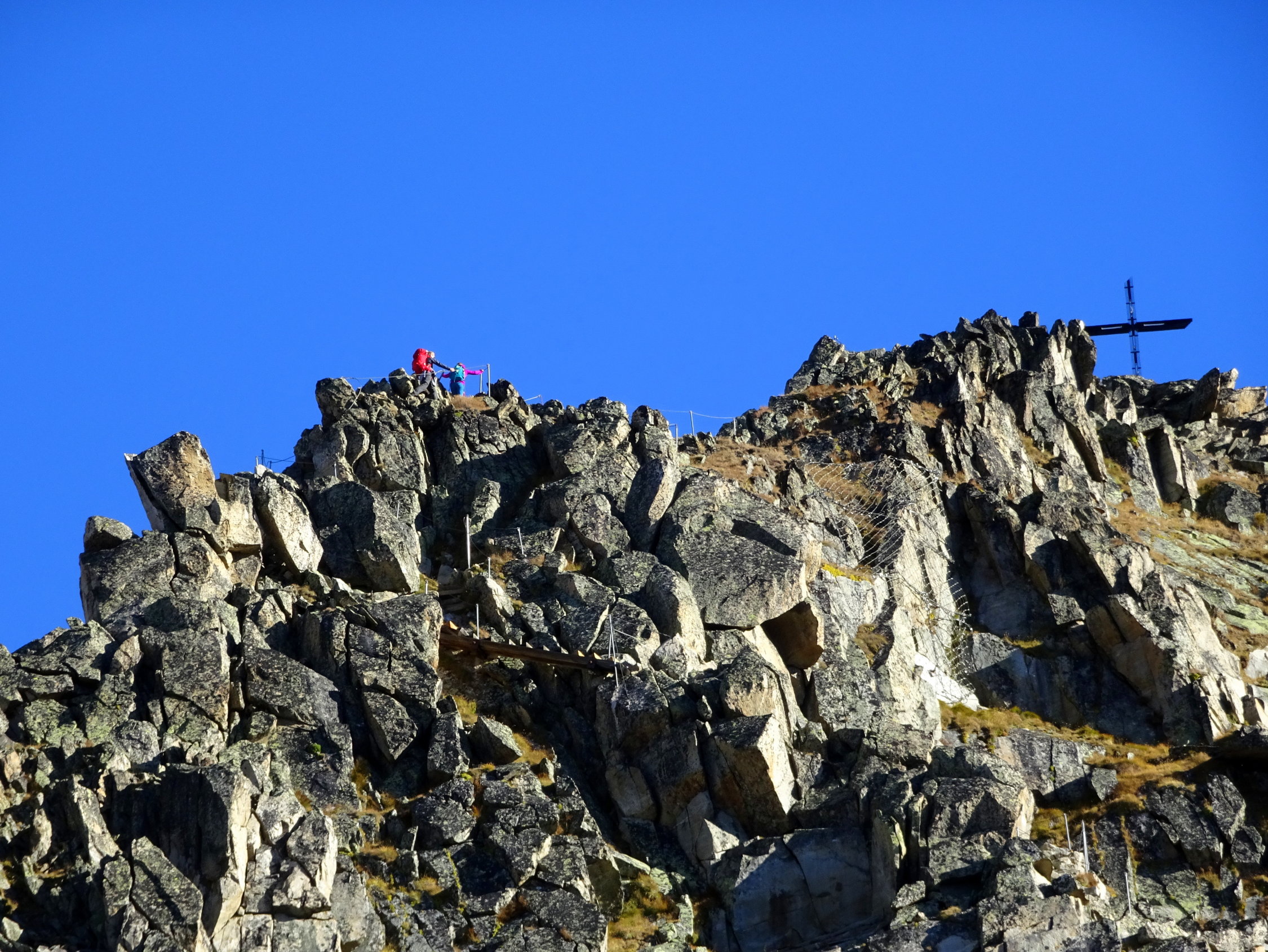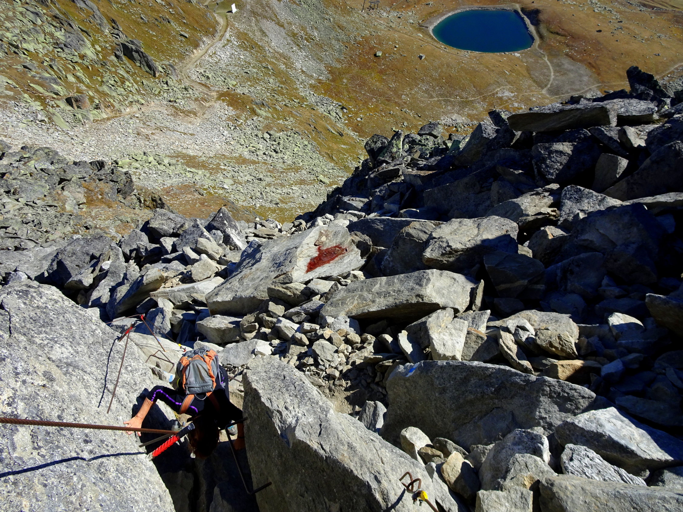 Nach Regen wird der Grat schnell trocken. Erstaunlicherweise sind die Blockplatten sehr solide und haben nicht die Gewohnheit im dümmsten Moment zu wackeln und Verletzungen zu verursachen. Die Wegerbauer und die vielen Wanderer haben den ganzen Weg sozusagen verfestigt. Man sollte trotzdem achtsam sein. Die Orientierung ist sehr einfach, man könnte sogar bei Nebel durchgehen. Nur den unzähligen Farbzeichen nach.