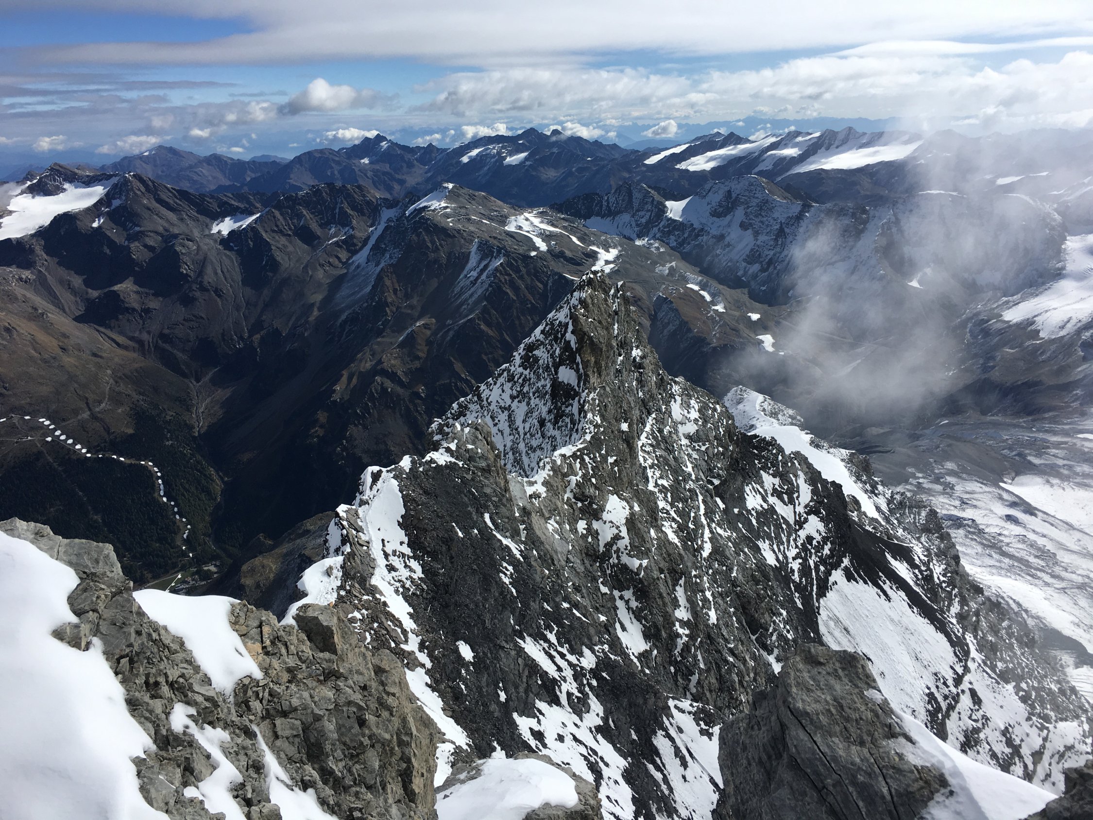 Hütten sind geschlossen und es ist wenig los im Gebiet. Eine Seilschaft kletterte den Südgrat auf den Ortler und stieg den Normalweg hinunter, der ganz anständig aussah (aus der Luft...)