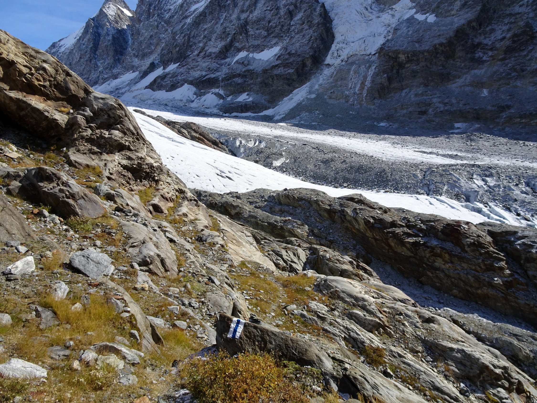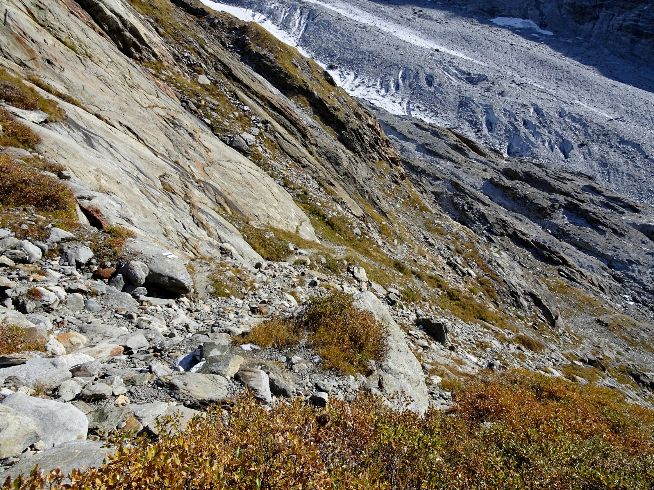 Ich bin dem "Glacier" Hinweis gefolgt. Auf der Schulter wo der Weg zu Ende ist, wollte ich nicht auf selbem Weg zur Abzweigung zurück, so habe ich eine Variante gemacht, die bereits von oben als interessant ausgeschaut hat. Dank dieser Variante, bin ich wieder beim Gletscherweg gelandet, ca 150 m. unterhalb der Abzweigung.