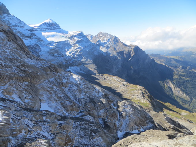 beim Start um 9 Uhr noch ziemlich nebelverhangen über les Diablerets, dieser lockerte sich zum Glück schnell auf so dass wir beim 'Pausenbänkli' auf dem Sentier de Drudy die ersten Strahlen geniessen konnten. Ansonsten ziemlich kühler Start bei nur ein paar Grad über dem Gefrierpunkt. Unterhalb Ref. Pierredar trafen wir auch auf die ersten Schneeresten (Schneefall vom Montag), auch oberhalb der Hütte auf dem Zustieg zum Klettersteig mussten ein paar Schnee/Eispassagen überquert werden. Der Klettersteig Dames Anglaises ist südseitig gelegen und schneefrei.