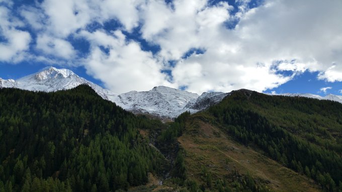 In den Nordhängen unter dem Bietschjoch fühlt man sich bereits wie im tiefsten Winter. Kaum über den Kamm gestiegen, begann das Schwitzen und wäre das Bietschtal nicht herbstlich eingefärbt, hätte man sich an einem Spätsommertag gewähnt.