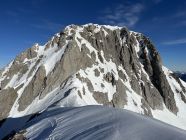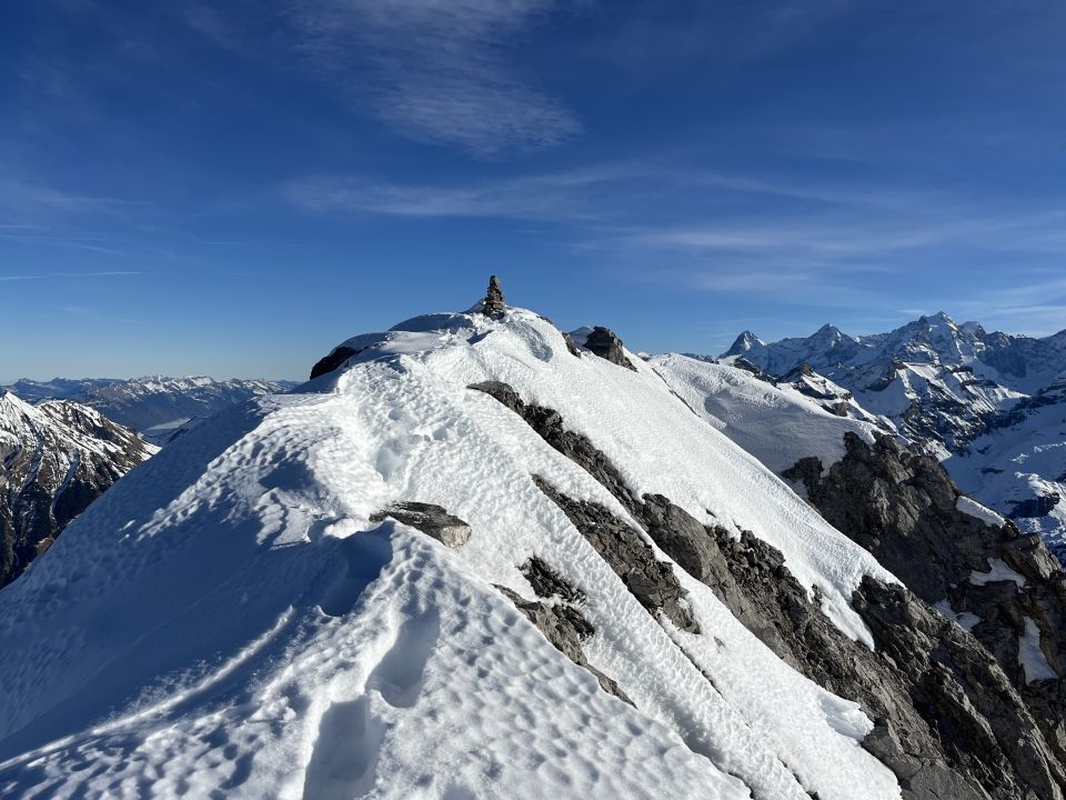 Kaum Schnee bis Giesene, dann meist tragend. Rücken zwischen Ä‘chnubel und Ä‘Horn abgeblasen, wie fast immer. Gipfelaufstieg ab dieser Stelle zu Fuss problemlos. Das Fixseil ist nicht mehr vorhanden.