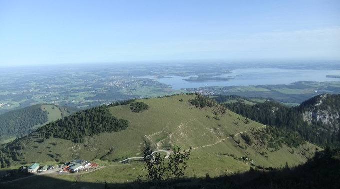 Vom Gipfel blickt man rundum: In nahes Priental, auf die Chiemgauer Seenplatte mit dem nahem „Bayerischen Meer“ (Chiemsee) mit seiner Herren-, Frauen- u. kleinen Krauter-Insel im Norden. Im Süden präsentieren sich die Hohen Tauern, der Großglockner, Großvenediger, davor der Wilde Kaiser und die Loferer Steinberge, im Osten die Berchtesgadener Alpen.