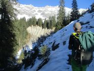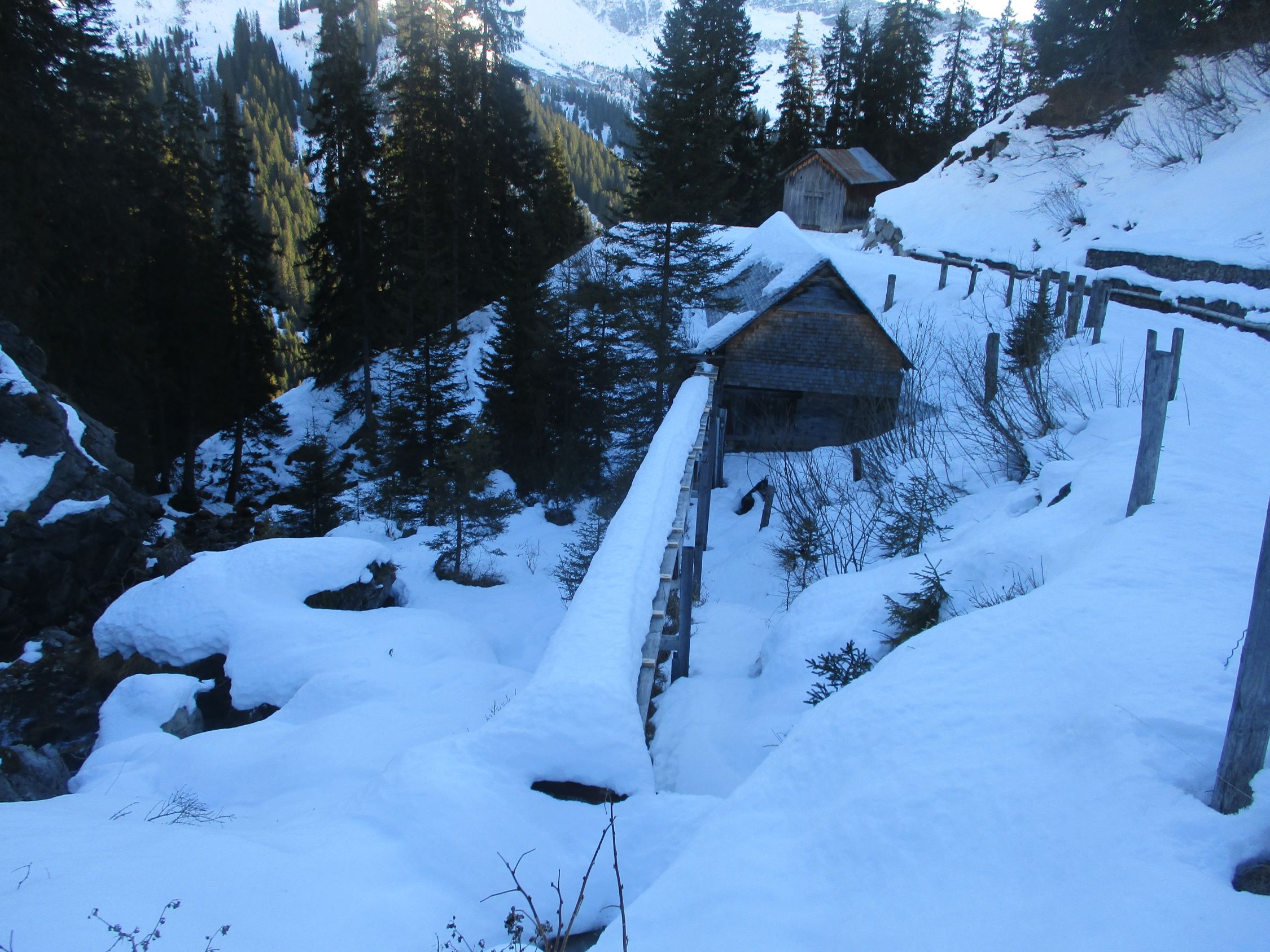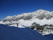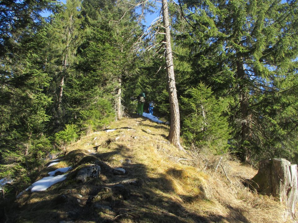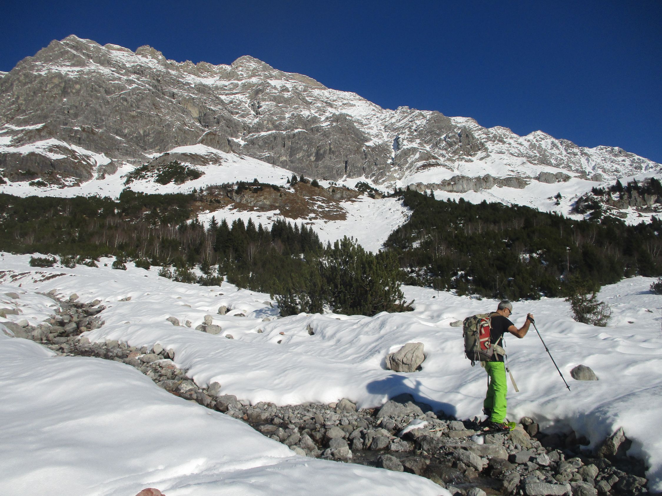 Mühsames Spuren durch Bruchharsch. Diese Verhältnisse wiederum waren dann günstig für den Abstieg - keine Rutschereien, auch nicht in den steileren Hangpartien. Insofern auch keine Steigeisen für den Abstieg nötig, die aber als Redundanz auf alpinen Schneeschuhtouren stets dabei sein sollten.