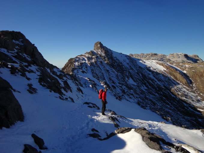 Südwandsteige komplett schneefrei, Südwestflanke zum Gipfel wenig Schnee und weich. In der nordseitigen Querung unterhalb der Schafköpfe Trittschnee und ebenfalls gut zu begehen. Alternativ können (etwas anspruchsvoller) die Schafköpfe überschritten werden.