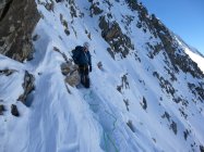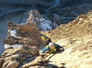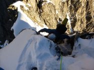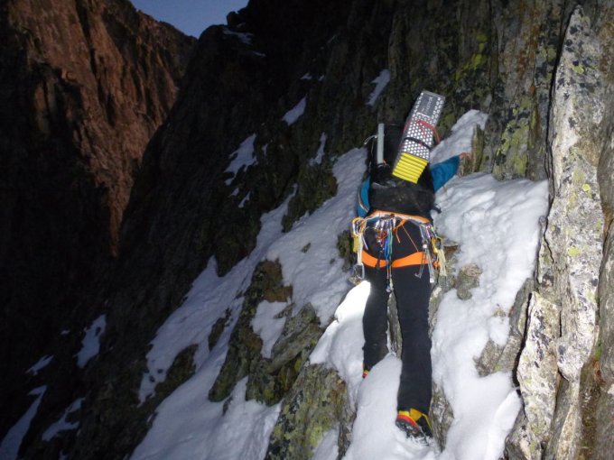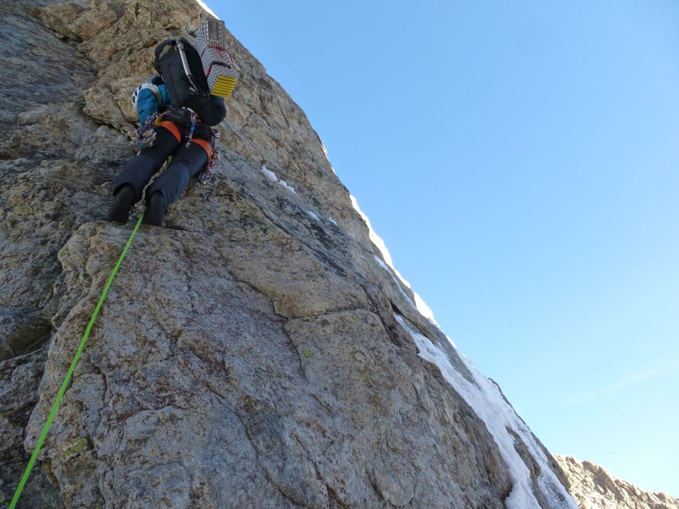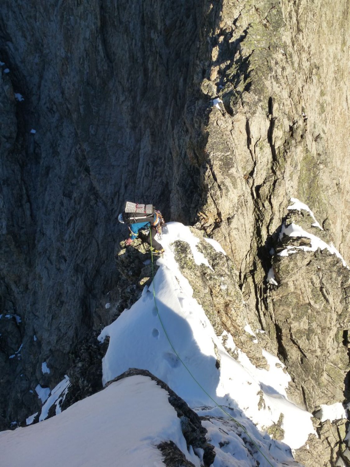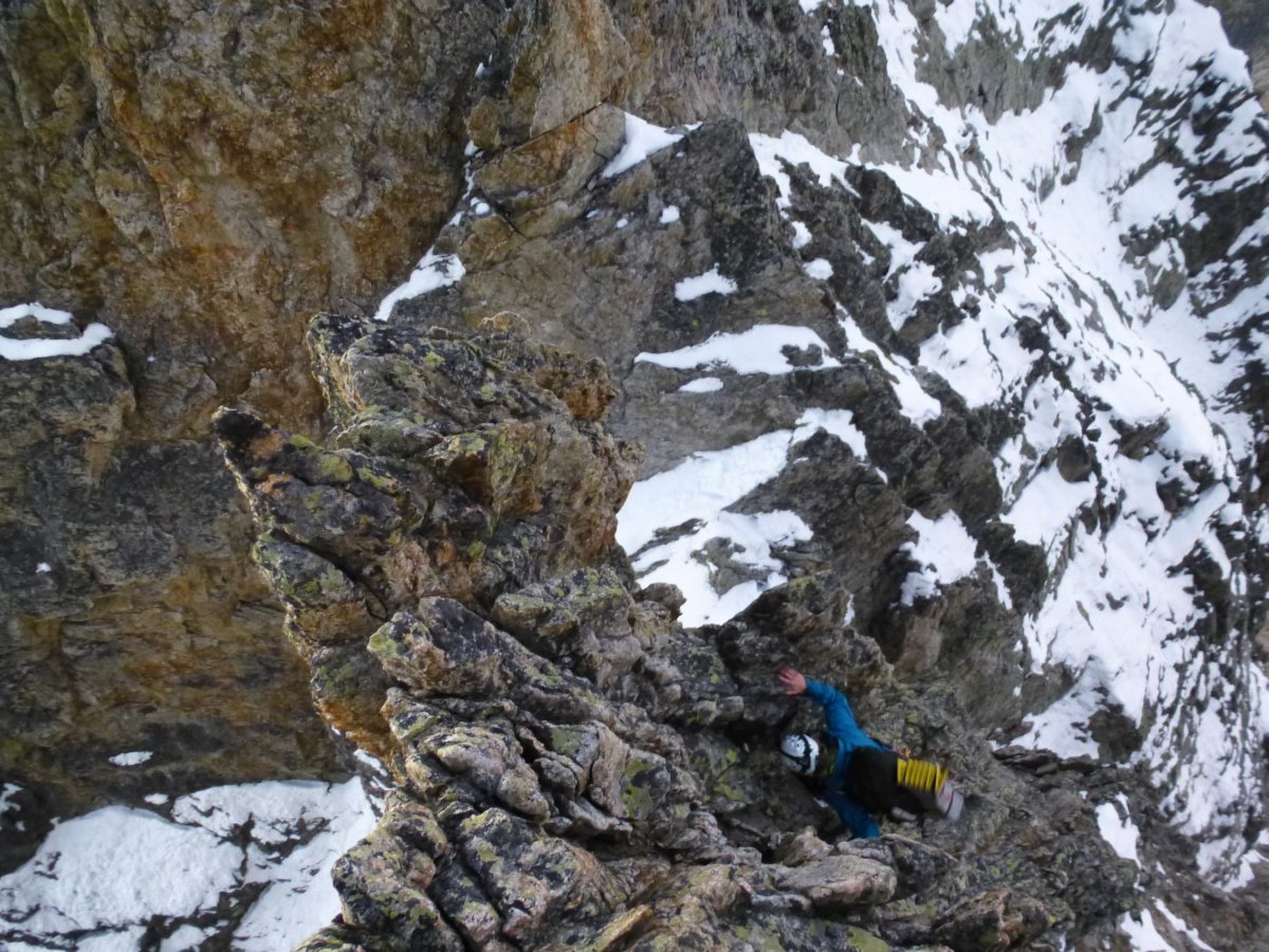Beim Abstieg über den Ostgrat taucht man derzeit auch ganz nett in den Winter ein. Selbes Spiel. Jeder Tritt in den Schnee eine Überrauschung. Also wieder Sicherung nötig und zeitaufwenig.