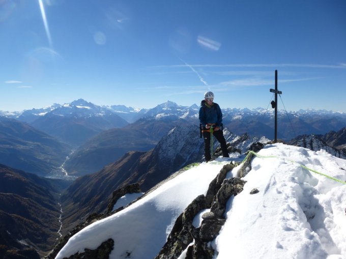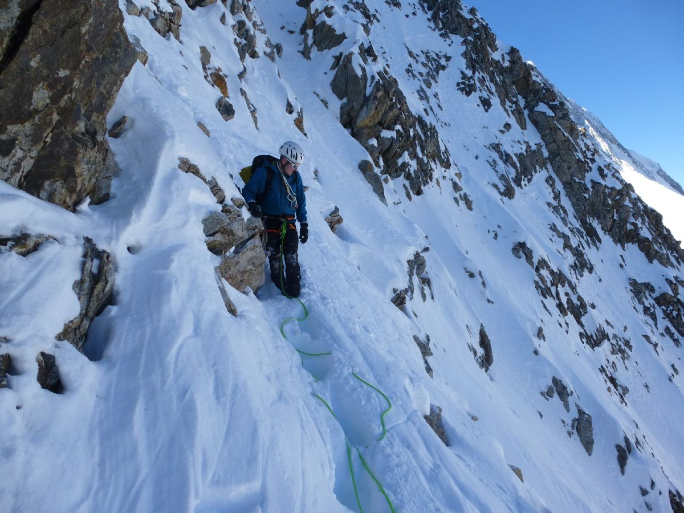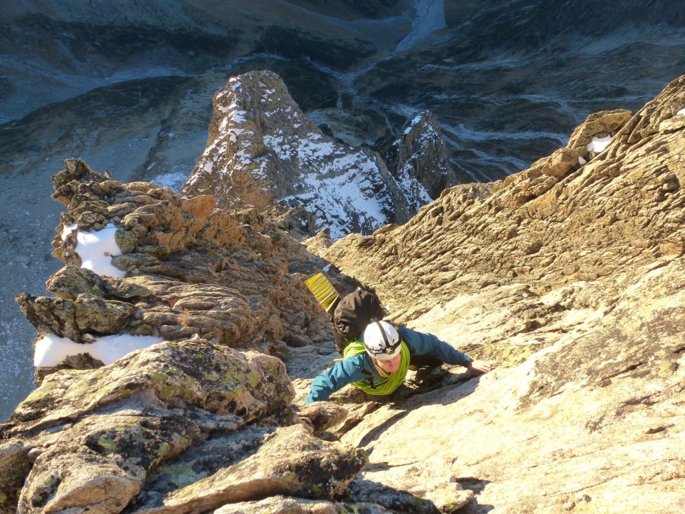 Am Stockhorn Südgrat zwei Gesichter: Südseitige Abschnitte alles bestens und trocken. Alle anderen Expositionen und insbesondere die Abstiege in die Scharten zwischen den Türnem verschneit. Diese Abschnite sind derzeit teilweise gar nicht so easy zu begehen und Zeit aufwendig. Der Schnee ist ohne jede Bindung, pulvrig und ohne Grundlage einfach auf den Felsen. Jeder Tritt in den Schnee eine Überraschung!