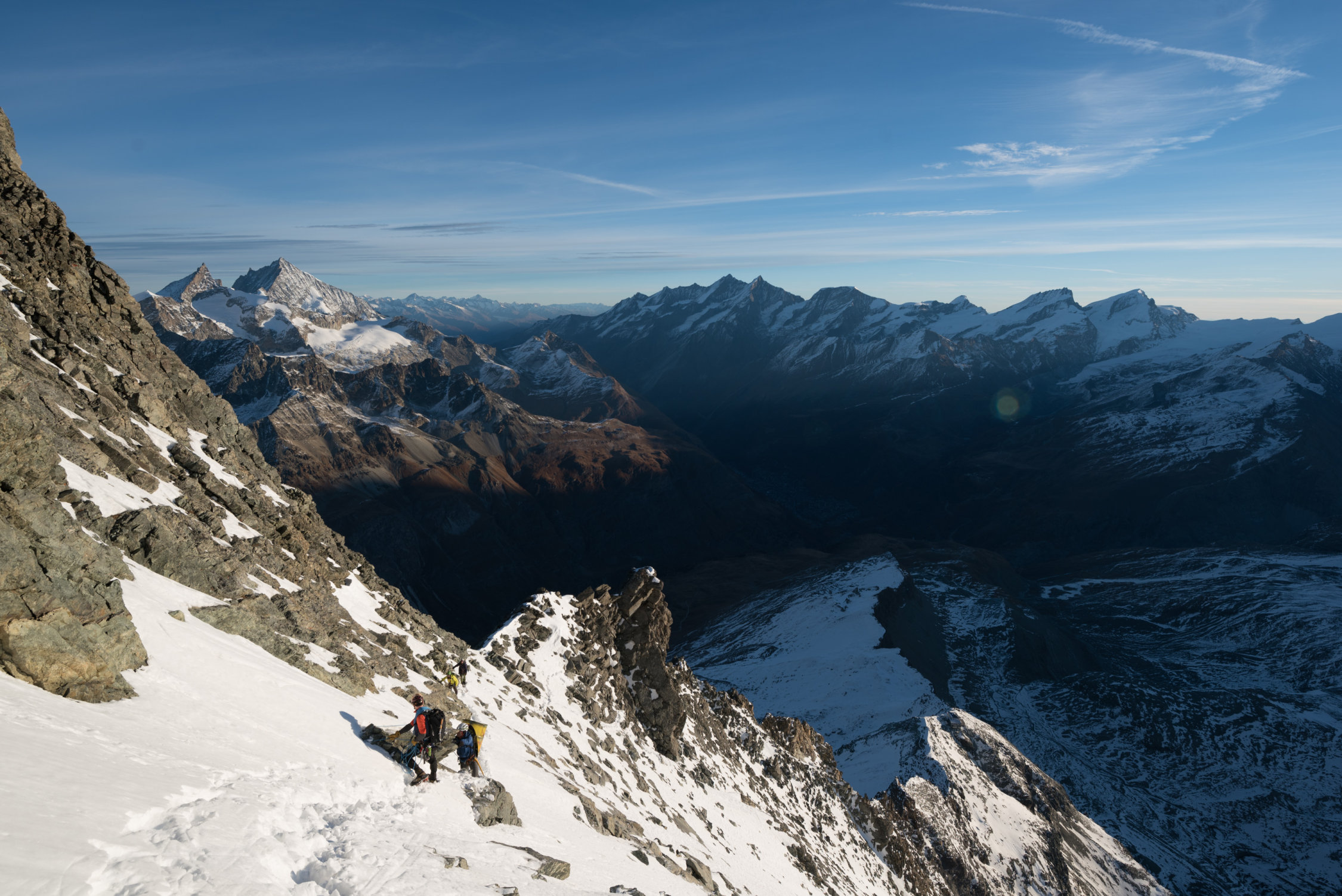 Die letzt Niederschlagsperiode hat ihre Spuren gelassen. Einiges an Schnee auf dem gesamten Grat, welchen wir ab der Hörnlihütte mit den Steigeisen auf und abgeklettert sind. Dafür war die Wegfindung etwas einfacher, da bis zur Solvayhütte ziemlich gespurt war (aber zwischendurch sieht man auch Verhauer - nicht jeder Spur trauen!). Ab Solvay dann keine frischen Spuren, auch die Fixseile mussten ab und zu etwas herausgerupft werden. Das Gipfelfirnfeld nahezu blank, dort mag der Neuschnee nicht mehr liegen bleiben.
