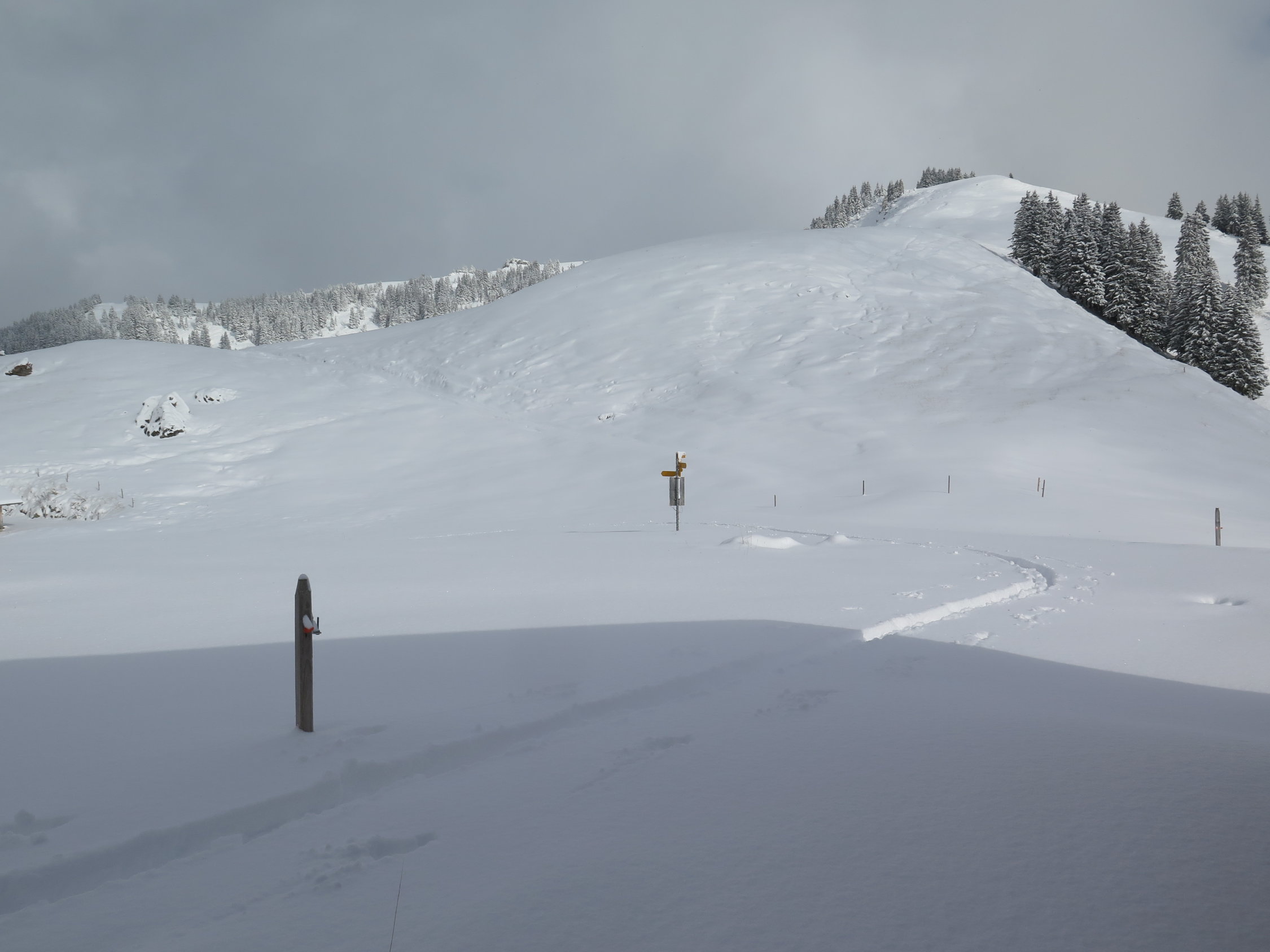 Verhältnisse in etwa gleich wie gestern siehe Eintrag von Adrian Zeller. Heute noch ein bisschen zusätzlicher Schnee. Für die Abfahrt ist keine Unterlage, darum immer noch ruppig zu fahren mit der nötigen Vorsicht vor den Löchern.