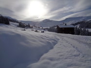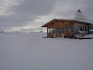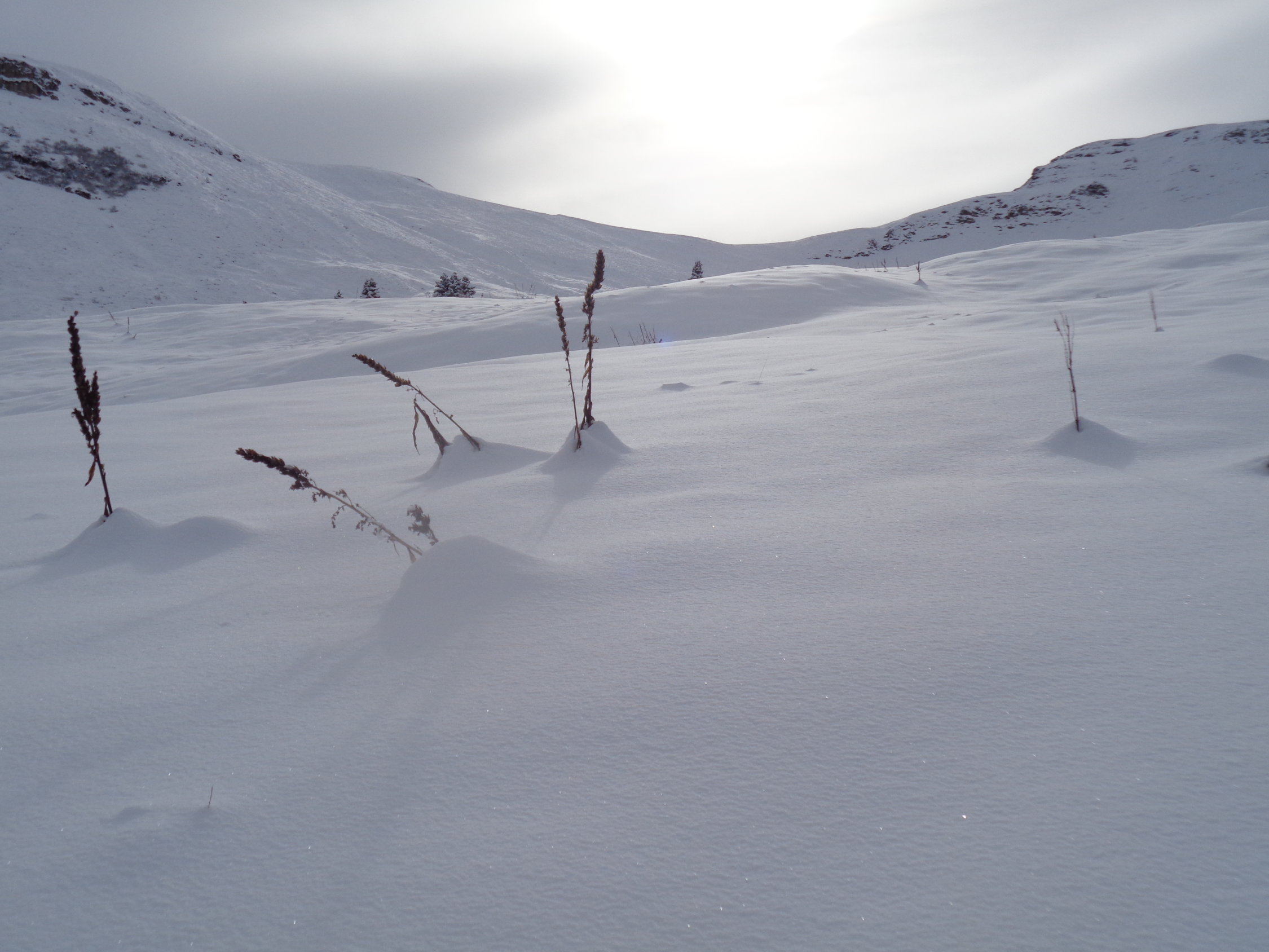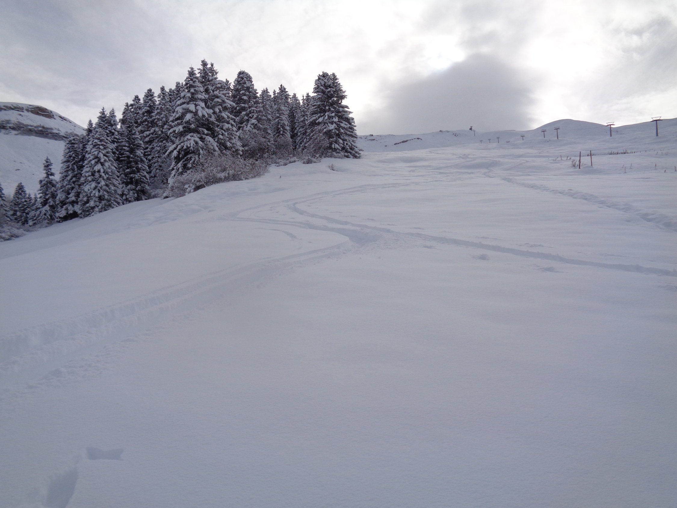 Heute war ich - man ahnt es - völlig allein in der Stille der Bergwelt. Obwohl erst Anfang Winter, hat es massig Schnee (ab Wali ca. 30-50cm). So viel, dass es in der Abfahrt in flacheren Strecken fast nicht möglich war, voranzukommen. Unterhalb der Bergstation ist der Untergrund ruppig und bucklig, hier ein paar Mal Bodenkontakt, sonst auf bestem Pulver runtergeschwebt (hatte meine fettesten Ski dabei, war genau die richtige Wahl).