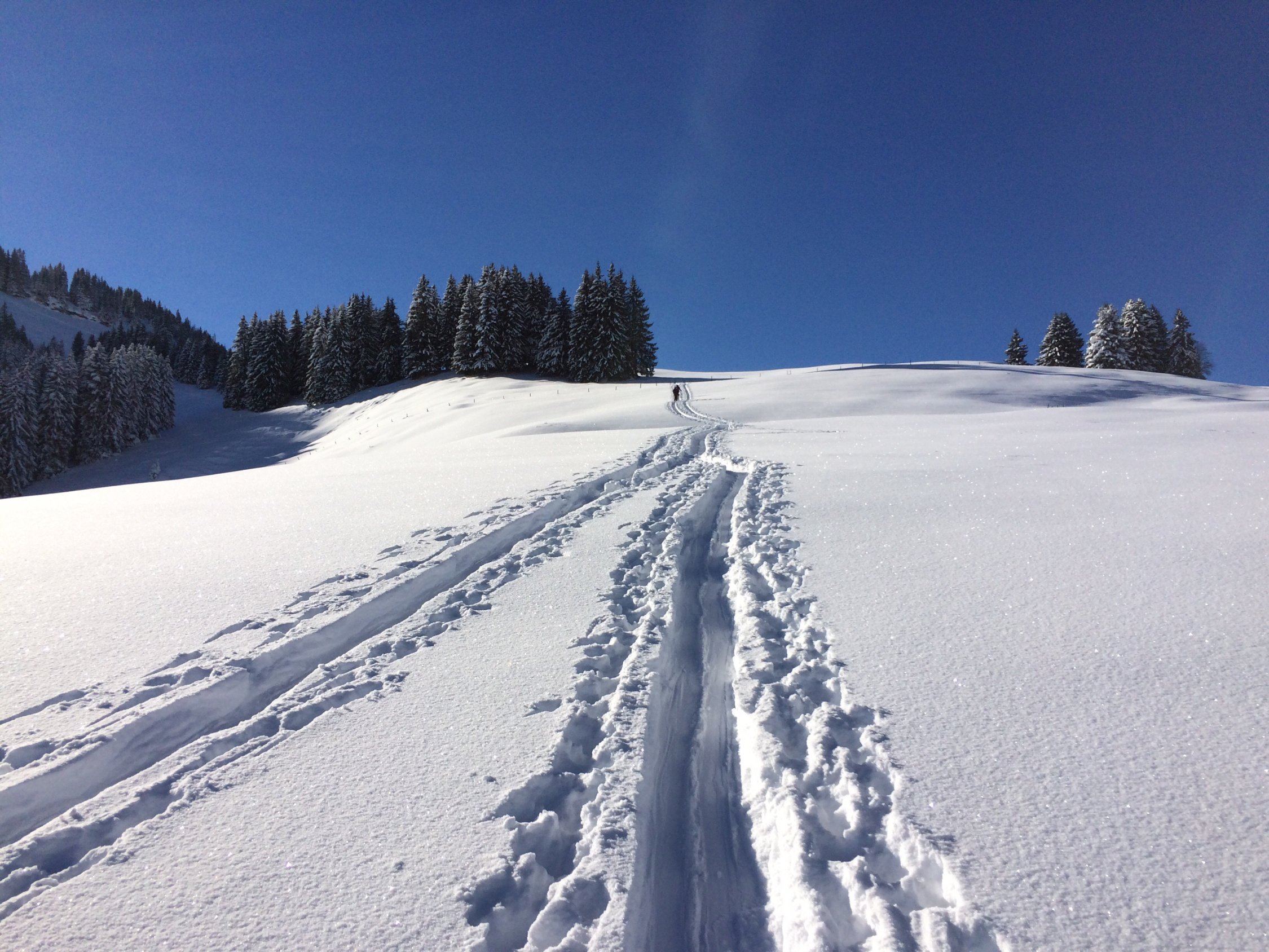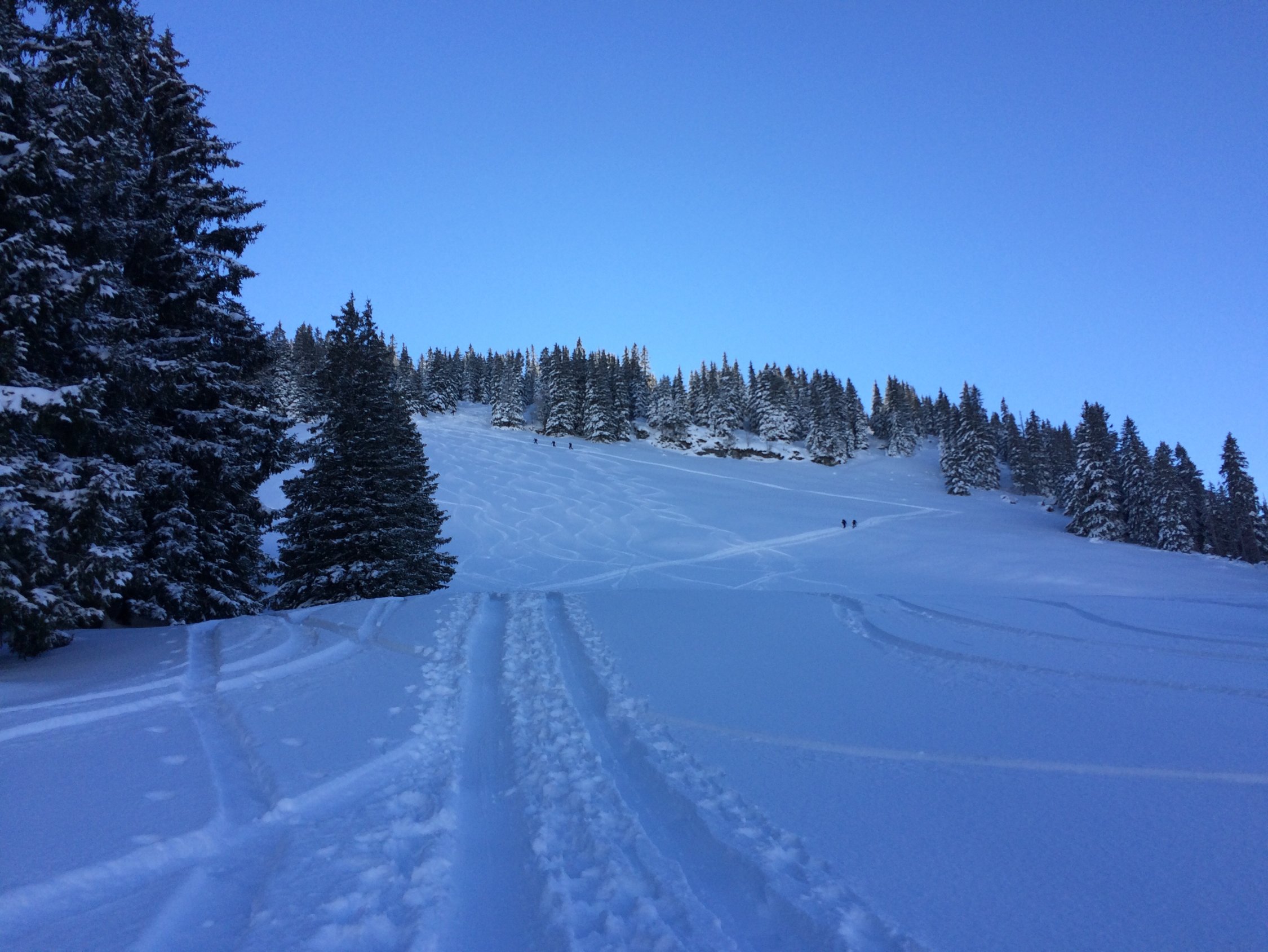 Start um 9:50 Uhr bei minus 5°C beim Parkplatz, wenig Wind. Beim Parkplatz hat es ca. 30cm Schnee mit wenig Unterlage.