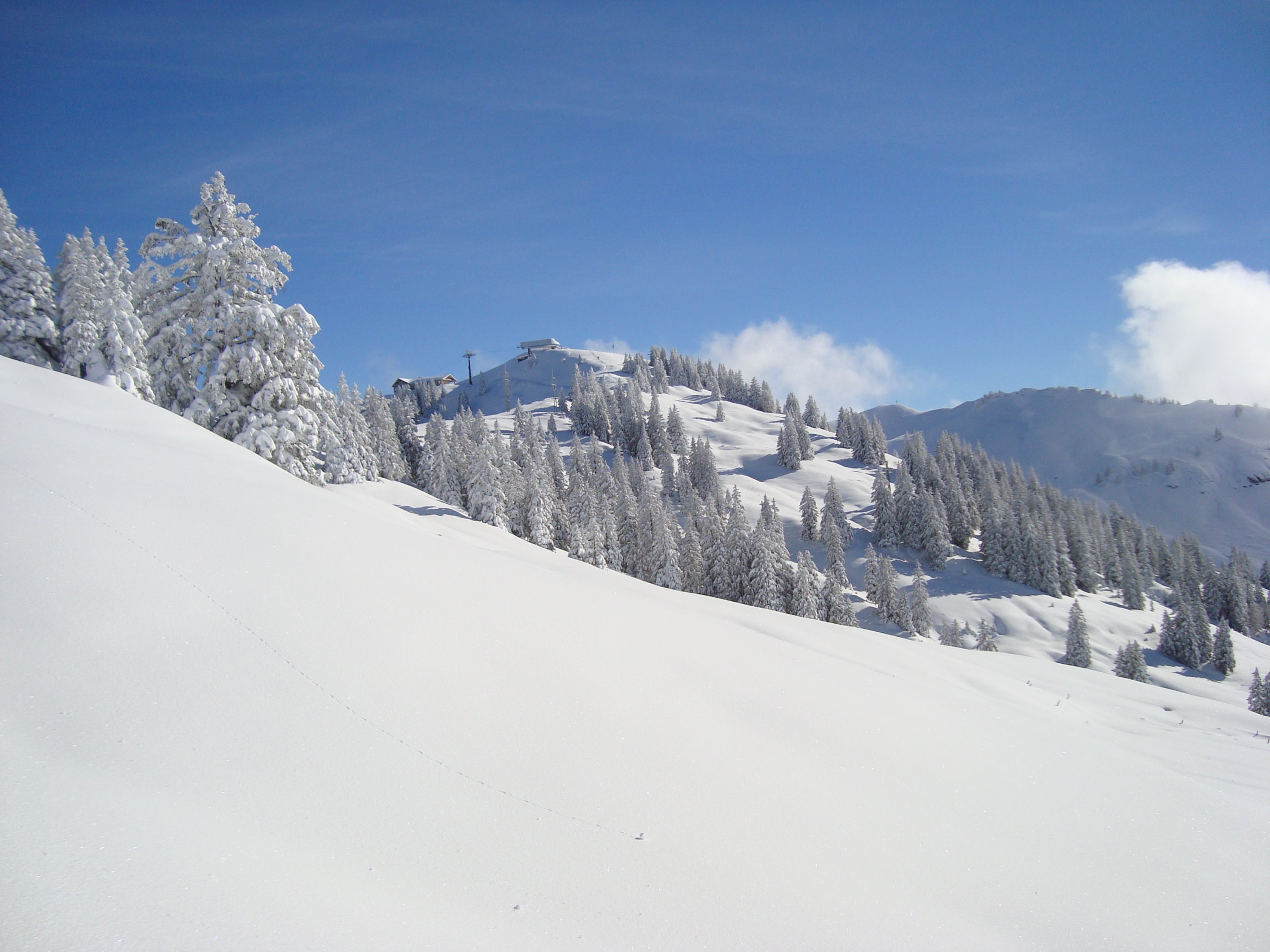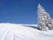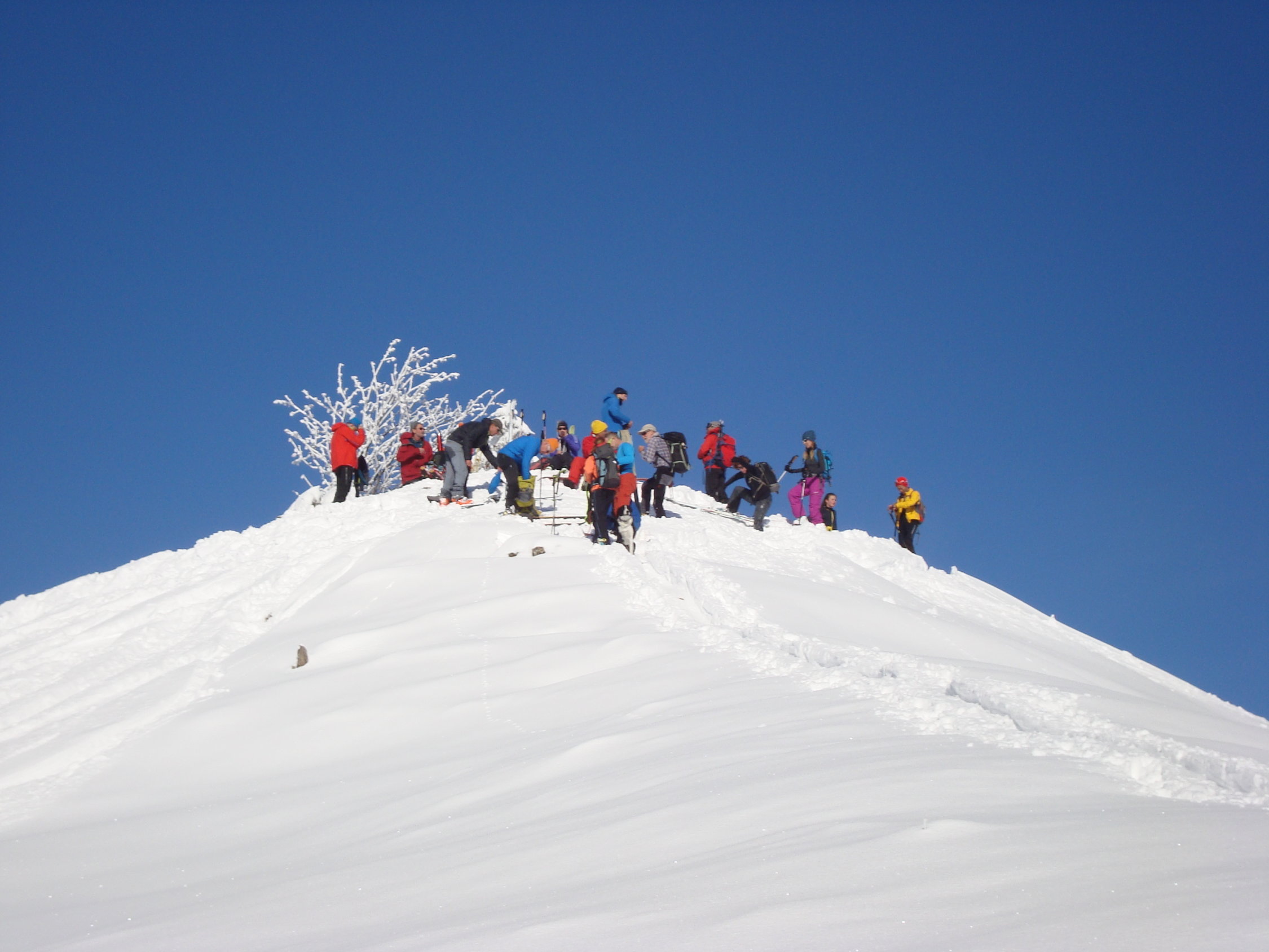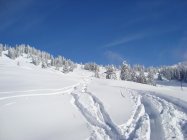 Vom Start an der Strasse schon fahrbar auf ca. 15cm Neuschnee. Im Gipfelbereich beträgt die Schneehöhe ca.60cm.