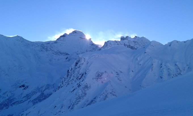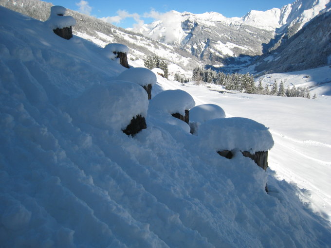 45-80-100-130-stop. Nein, das sind nicht die Traummasse einer Frau (von welcher Richtung auch immer gelesen), das sind die Schneehöhen... mehr Schnee wie erwartet, auch wenn man bei der Zufahrt erst so ab Engi mit weisser Pracht visuell verwöhnt wird. Die Strasse hoch zum Parkplatz nass, das wird schön gefrieren über Nacht. Ab Start wie gesagt zunehmende Schneehöhen (siehe Bilder), 80cm an der Obererbs-Hütte, 100cm an der Hanegg. Heute ist keiner auf den Gipfel, alle bei 2390m umgedreht. Ich wollte es doch noch wissen, da ich bis dahin flott unterwegs war, aber dann für 30Hm und 100 Längenmeter 10min gebraucht, bis zur Hüfte jeweils versunken und das Blockfeld ist nicht ohne mit seinen Löchern. Hochmultipliziert und festgestellt, dass ich so nicht zum Gipfel kommen werde. Abfahrt dann ja äh, zuviel weiss. Steinski waren falsche Wahl. Pulver jetzt durch Sonnenbearbeitung (je nach Exposition) leicht gedeckelt.
