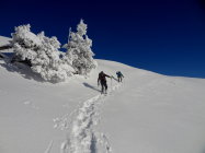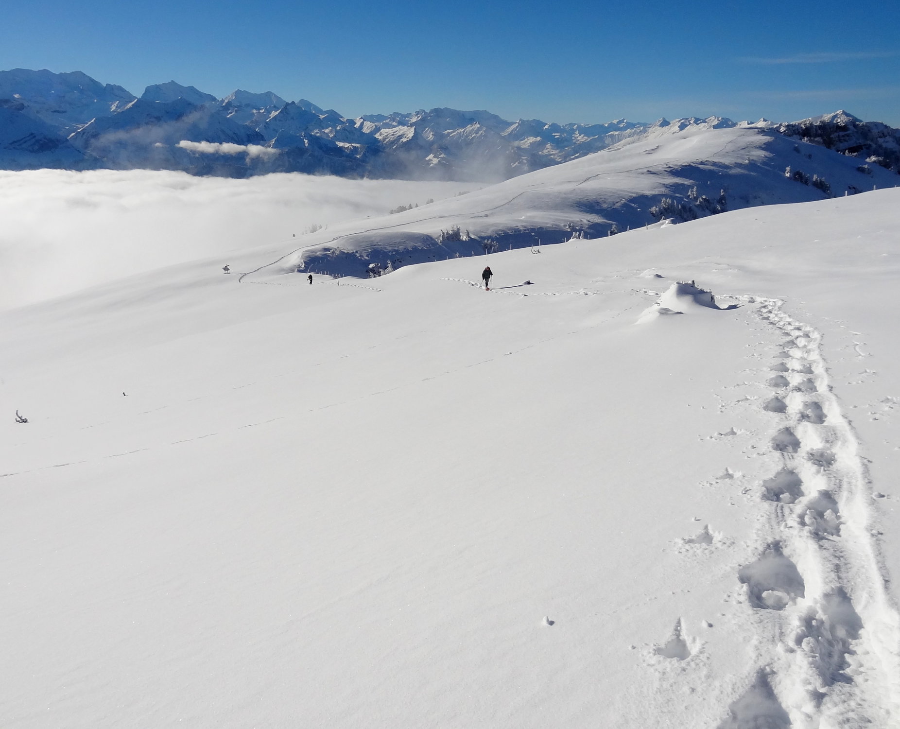 Niederhorn-Burgfeldstand erstaunlich viel Schnee. Starke Verfrachtungen die beim Spuren recht Mühe verursachten. Sobald die Sonne scheint, setz sich der Schnee am Niederhorn ziemlich schnell, was eine gute Unterlage bescheren könnte. Sobald es schneit und stark windet, sind die Schneeverfrachtungen wieder da.