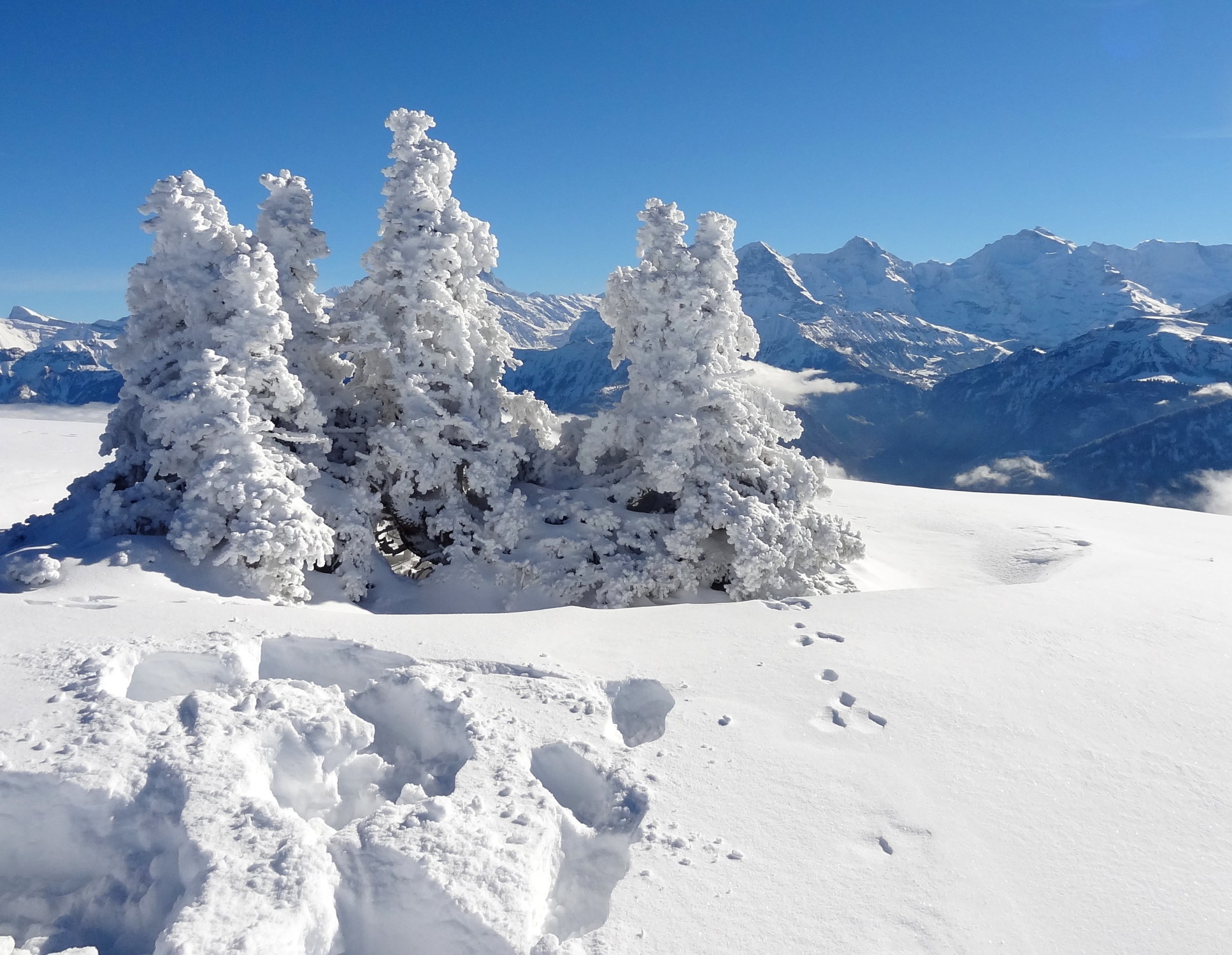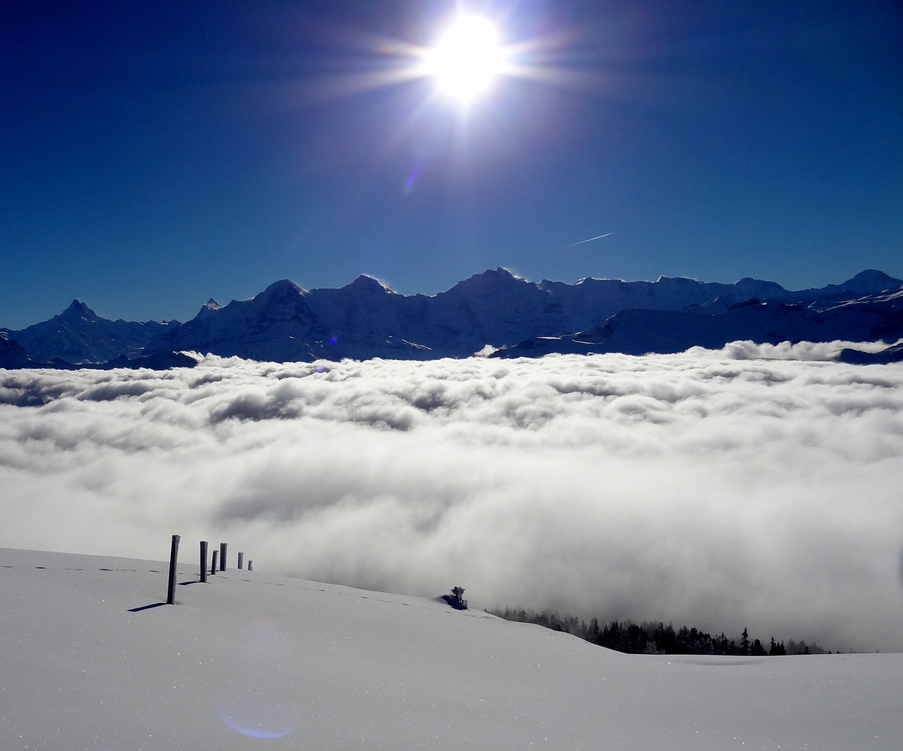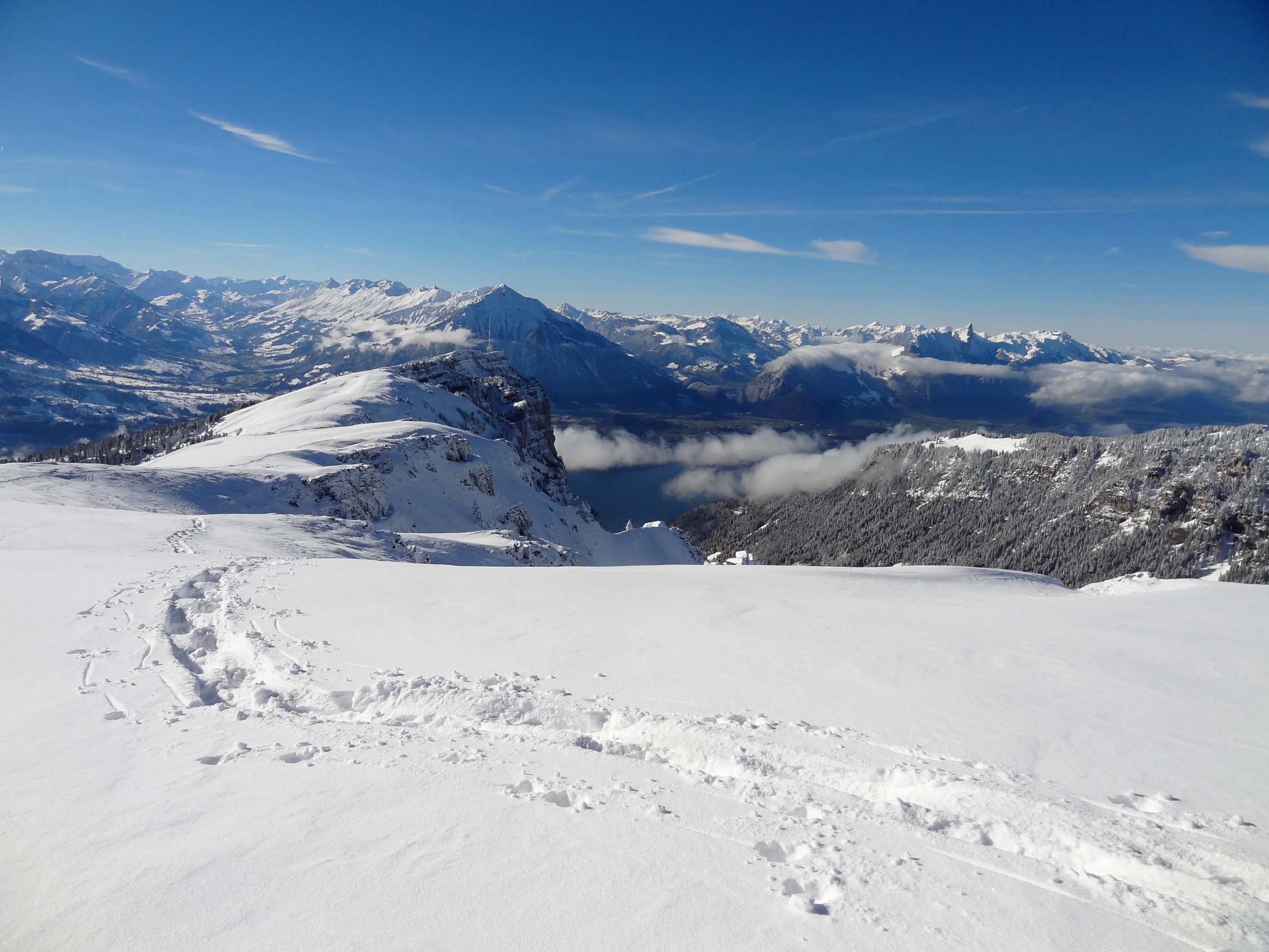 Das Niederhorn ist, nach einem Schneefall, immer eine dankbares Ziel. Gut mit ÖV erreichbar und mit einer Anzahl an Möglichkeiten für jeden Geschmack. Sind die Verhältnissen oder das Wetter nicht gut, kann man problemlos mit der Bahn wieder hinunterfahren. Dies dachte ich heute, als ich den vielen noch ungespurten Schnee sah. Also los mit Spuren bis zur Abzweigung beim Sesseli und dann überlegen. Beim Sesseli war der Schnee wie üblich sehr tief, da ging es nur im Geländegang. Weiter oben beim Grat, als ich überlegte allein geht es nicht, also Pause, fotografieren und dann zurück, tauchten zwei Schneeschüeler auf, Vater und Sohn. Sie übernahmen den zweiten Teil der Route und machten, scheinbar mühelos, eine wunderbare Spur bis zum Gipfel. Das nennt man Glück haben. Dankeschön.