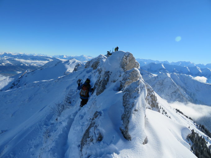 Top Verhältnisse um die Skitourensaison zu eröffnen,30-50cm Pulverschnee im Gipfelhang windbearbeitet kompakt dafür ohne Bodenkontakt.