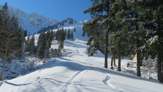 Wir sind nach der ersten Abfahrt zur Gustiberghütte nochmals aufgestiegen und sind zum Haber hinaus gequert,über diesen bei Top Pulverschnee mit kleiner Unterlage bis 1300m abgefahren.