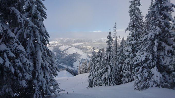 Neuschnee von der letzten Nacht. Mit frühem Start und Abfahrt um 11h hatten wir bis zur Strasse runter guten Pulver. Schneehöhen zwischen ca. 15 - 50cm.