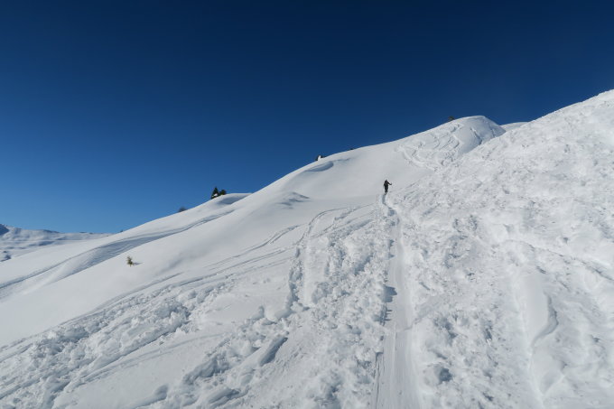 Sind vom Ragazer Blanken auf den Hochblanken. Der Gipfelhang des Hochblanken war mit bestem Pulver bestückt und besonders schön zu fahren.