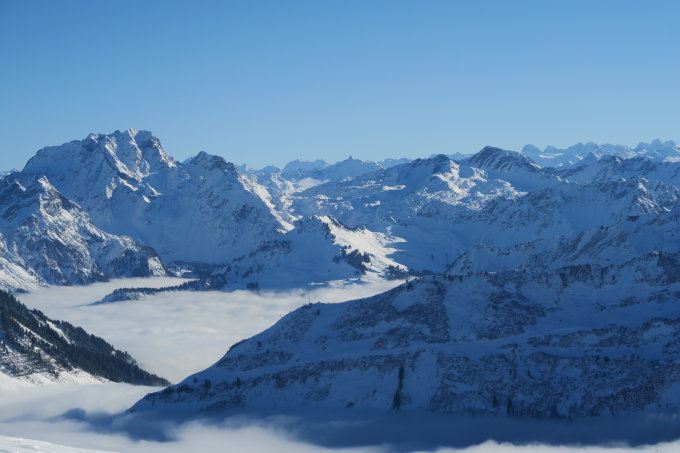 Der Hochnebel reichte bis kurz vor Damüls, darüber war es sonnig. Schnee auf den Sonnenseiten mit Deckel, sonst Pulver. Schneehöhe erstaunlich hoch und überall ausreichend. Den unteren Teil der Tour kann man auf den vorpräparierten Pisten abfahren.