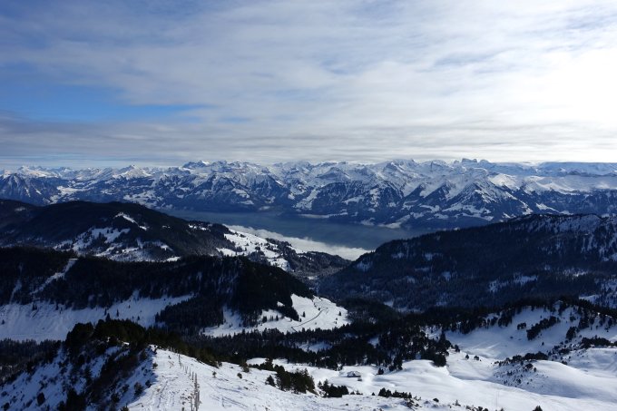 Ganz gute Verhältnisse vorgefunden: Unten märchenhaft verschneiter Wald, oberhalb Alp Rick, wo auch gestern die Sonne schon schien, bereits eine Kruste an stark beschienenen Hängen. Das Gelände klug ausnutzend, aber weitgehend Abfahrt im Pouder, in den Waldpartien sogar super! Langis ca. 30 cm, im Gipfelbereich bis 70 cm sehr schöner Pulverschnee. Die Mulden ausnutzend, kaum Steinkontakte! (Grate und Kuppen mehrheitlich abgeblasen)