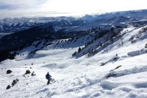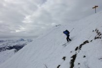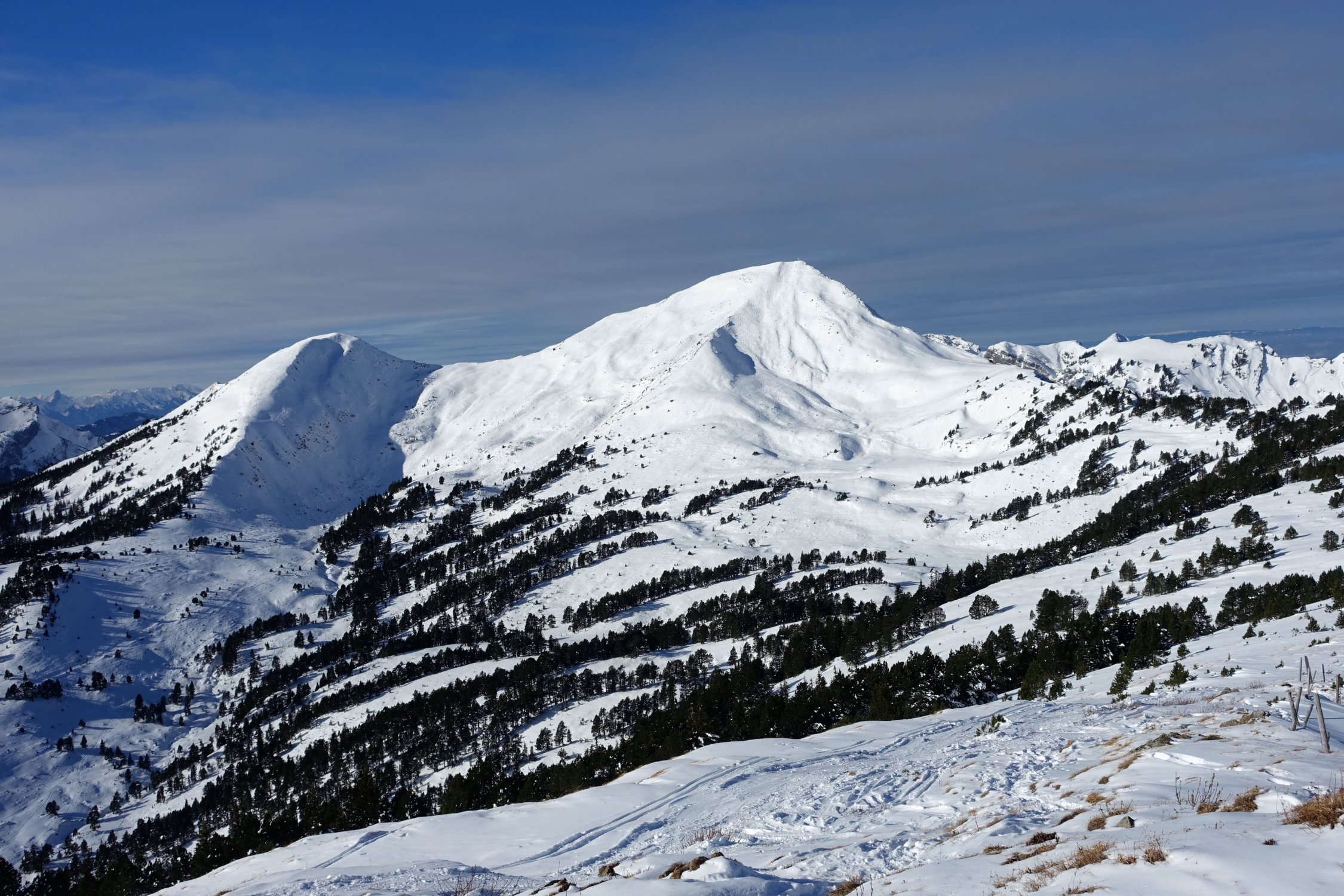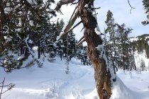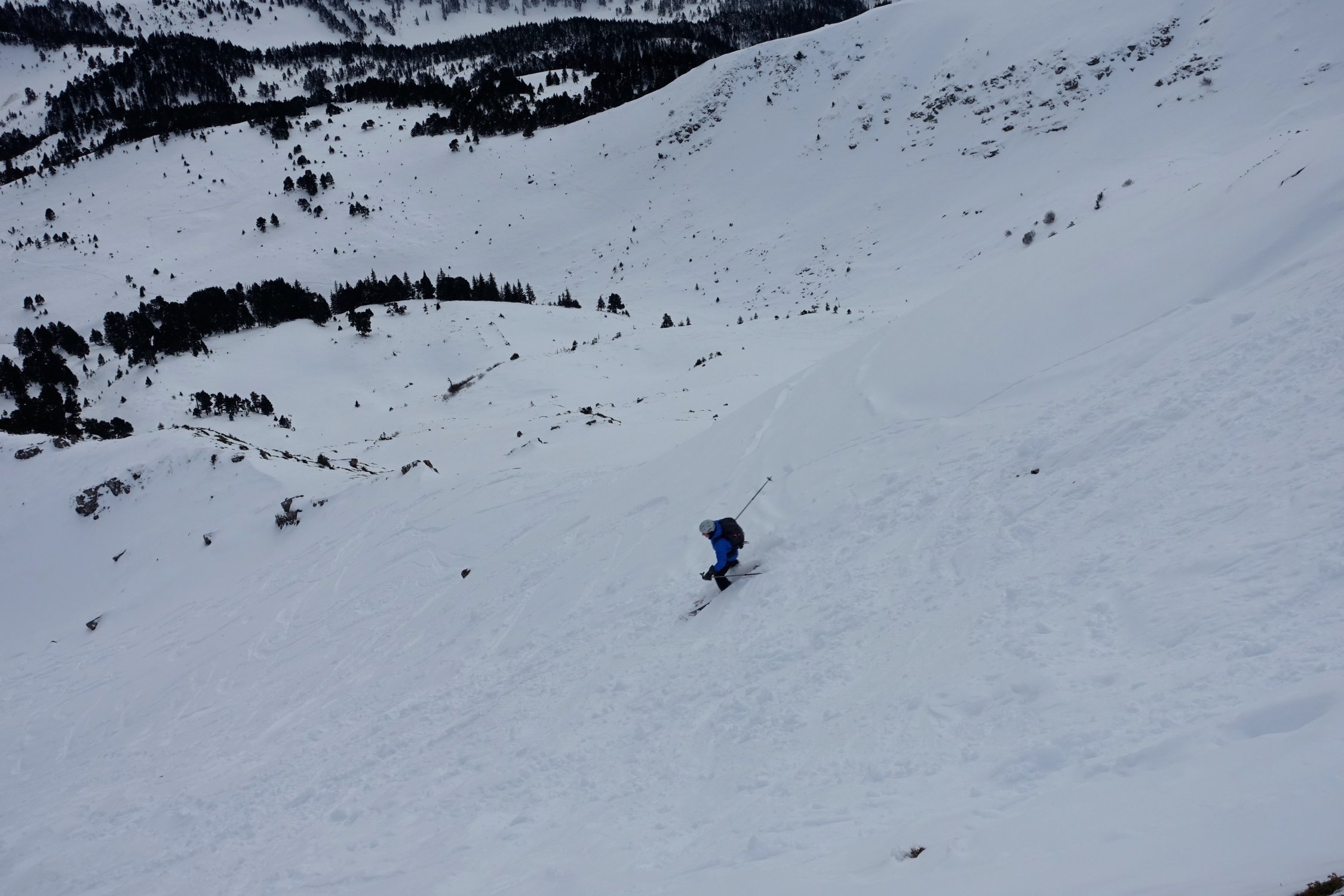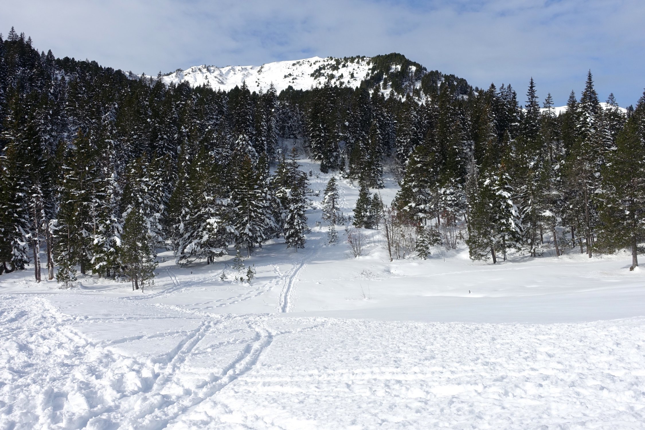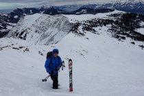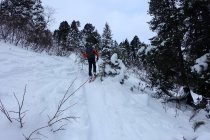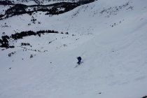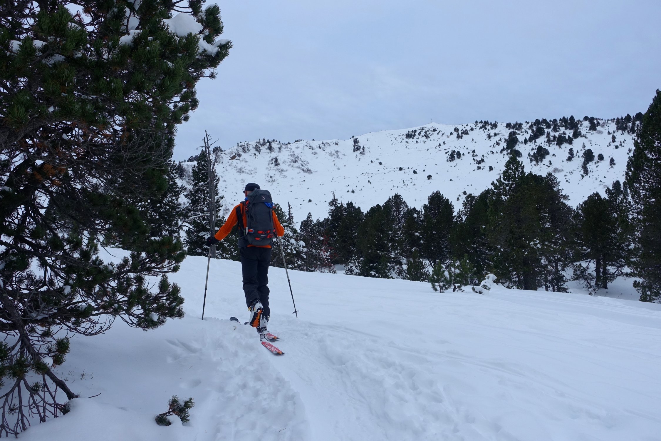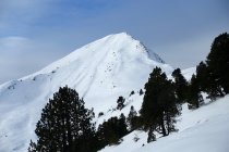 Abfahrt direkt unter dem Gipfelkreuz durch die steile Mulde bis ungefähr 1800 m. Nun wieder anfellen und nordöstlich durch den lichten Föhrenwald hoch gegen den Sattel auf 1885 m, oder östlich davon.