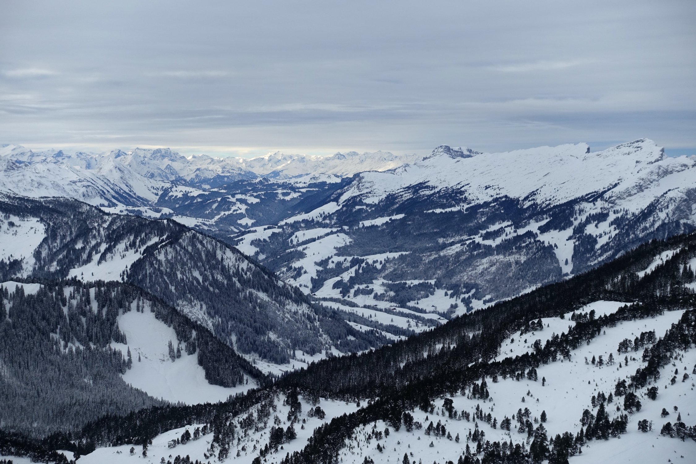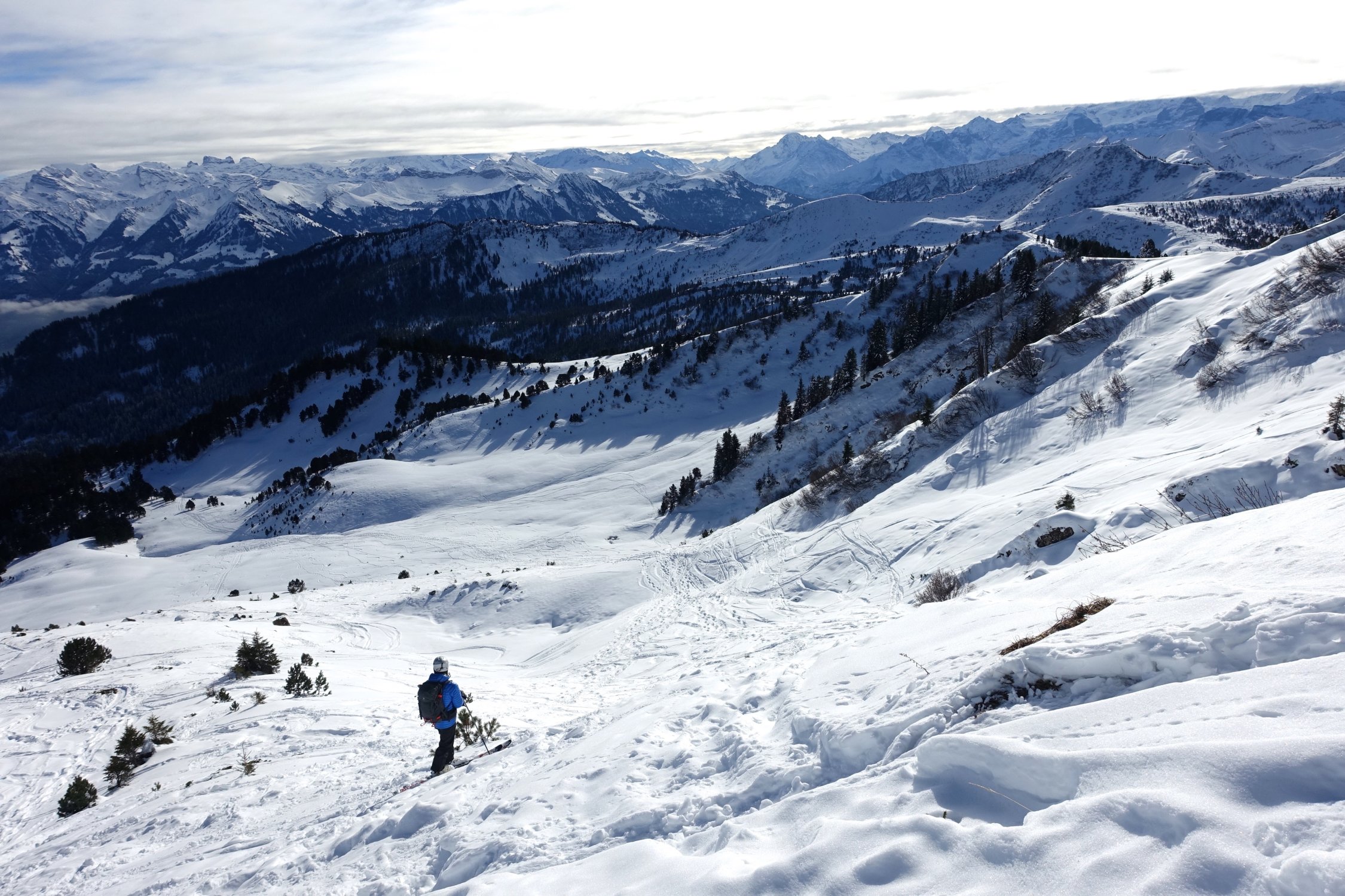 Abfahrt über die Ostflanke und später durch den Wald auf den Glaubenbergpass. Der Strasse entlang zum PP beim Langis.