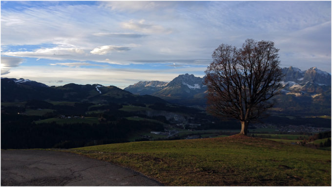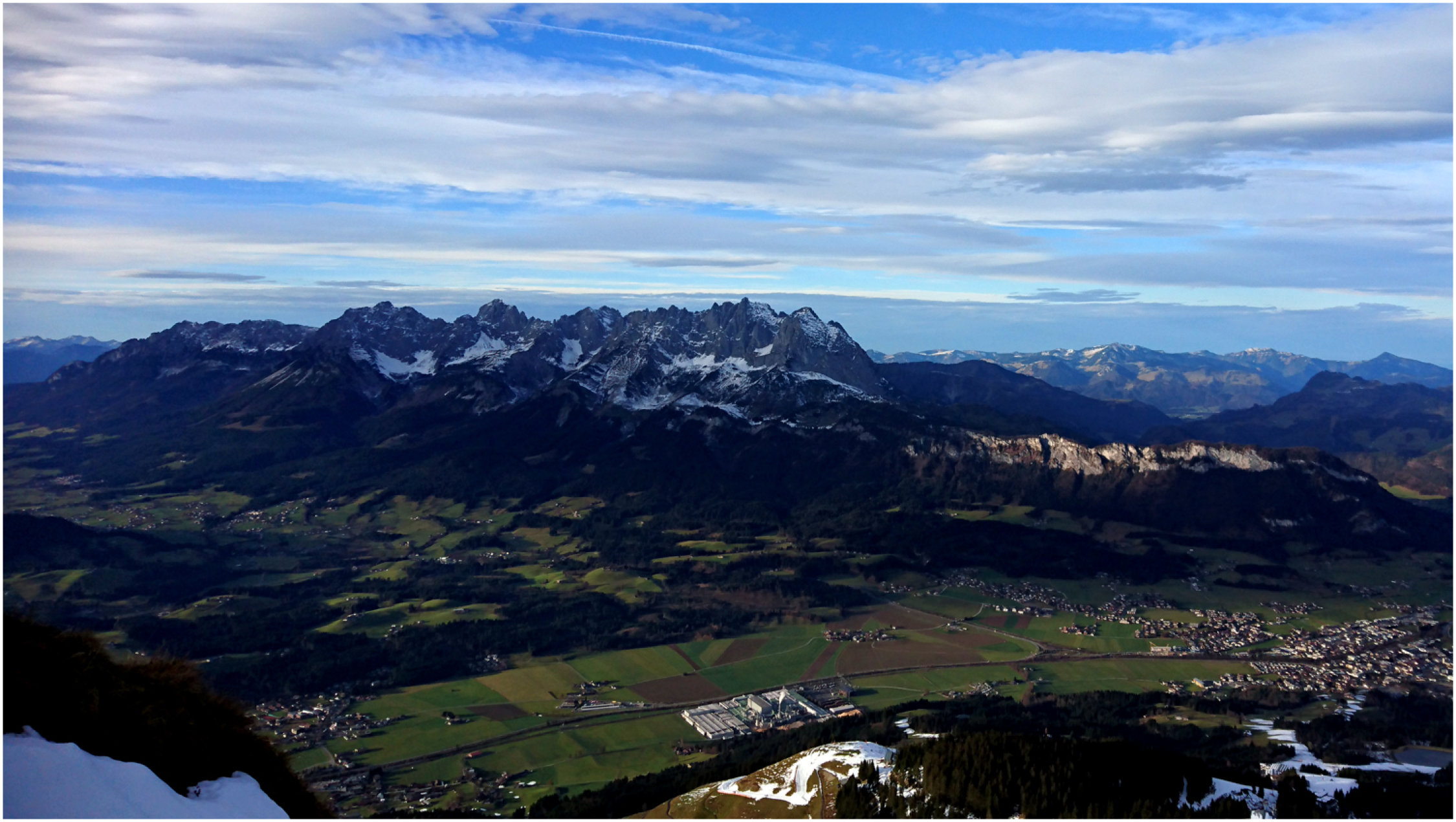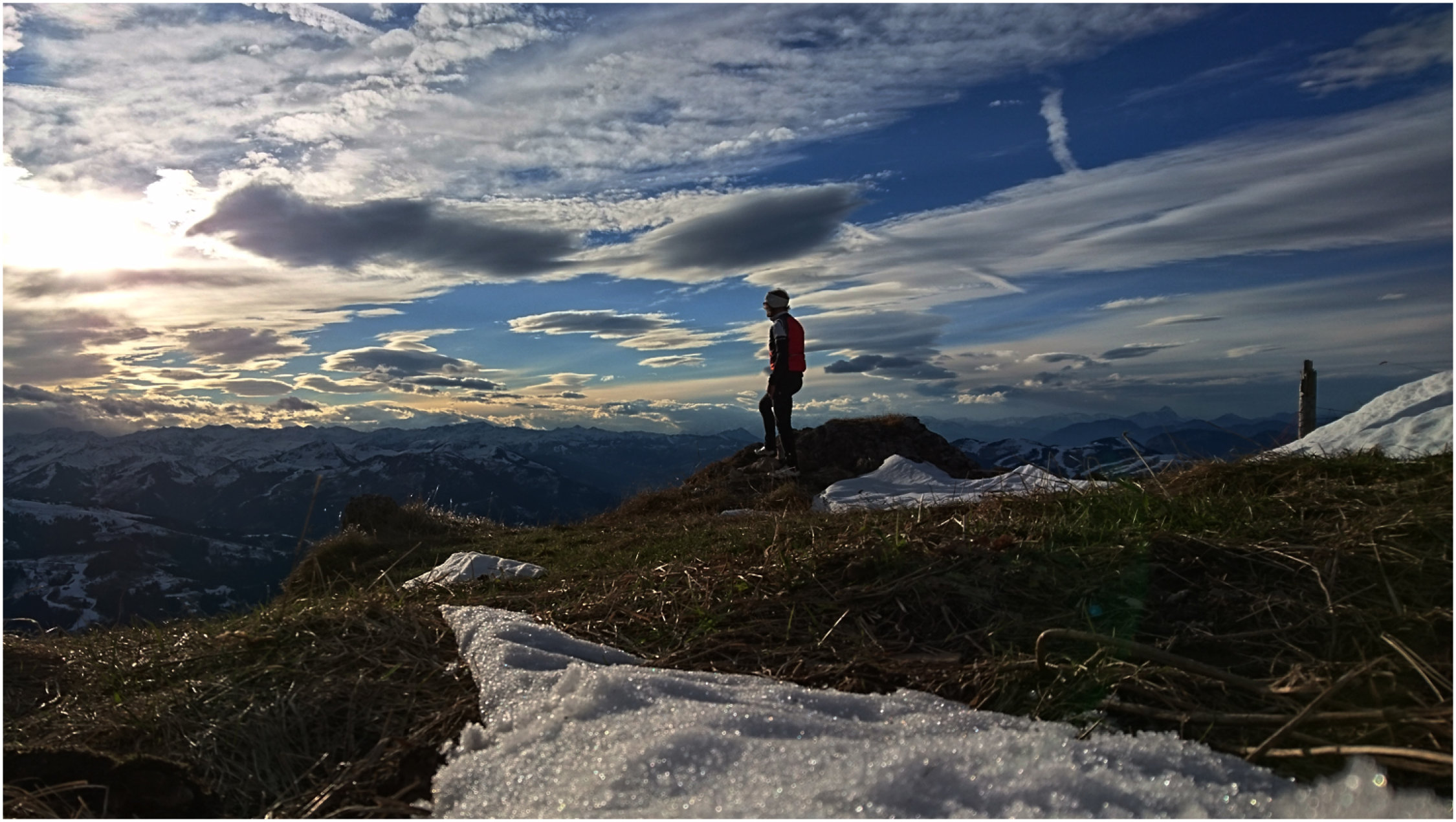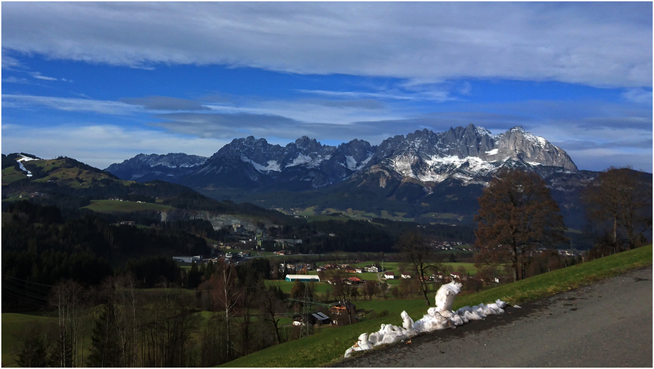 Beim Blick in die Runde fällt auf, dass die Schneemengen recht unterschiedlich sind. Kaiser Südseite: Ellmauer Tor und Ellmauer Halt eher schon zusammenhängende Schneeflecken, Scheffauer nur Schneereste, Treffauer Schneeflecken, Kopfkraxn eher schon mehr Schnee. Loferer bis etwa 2000m schon recht eingeschneit, Leoganger weniger Schnee. Kitzbühler Alpen nordseitig bis etwa 1500m ganz gut weiß. Für Skitouren allerdings auch mit dem Bike nicht lohnend.